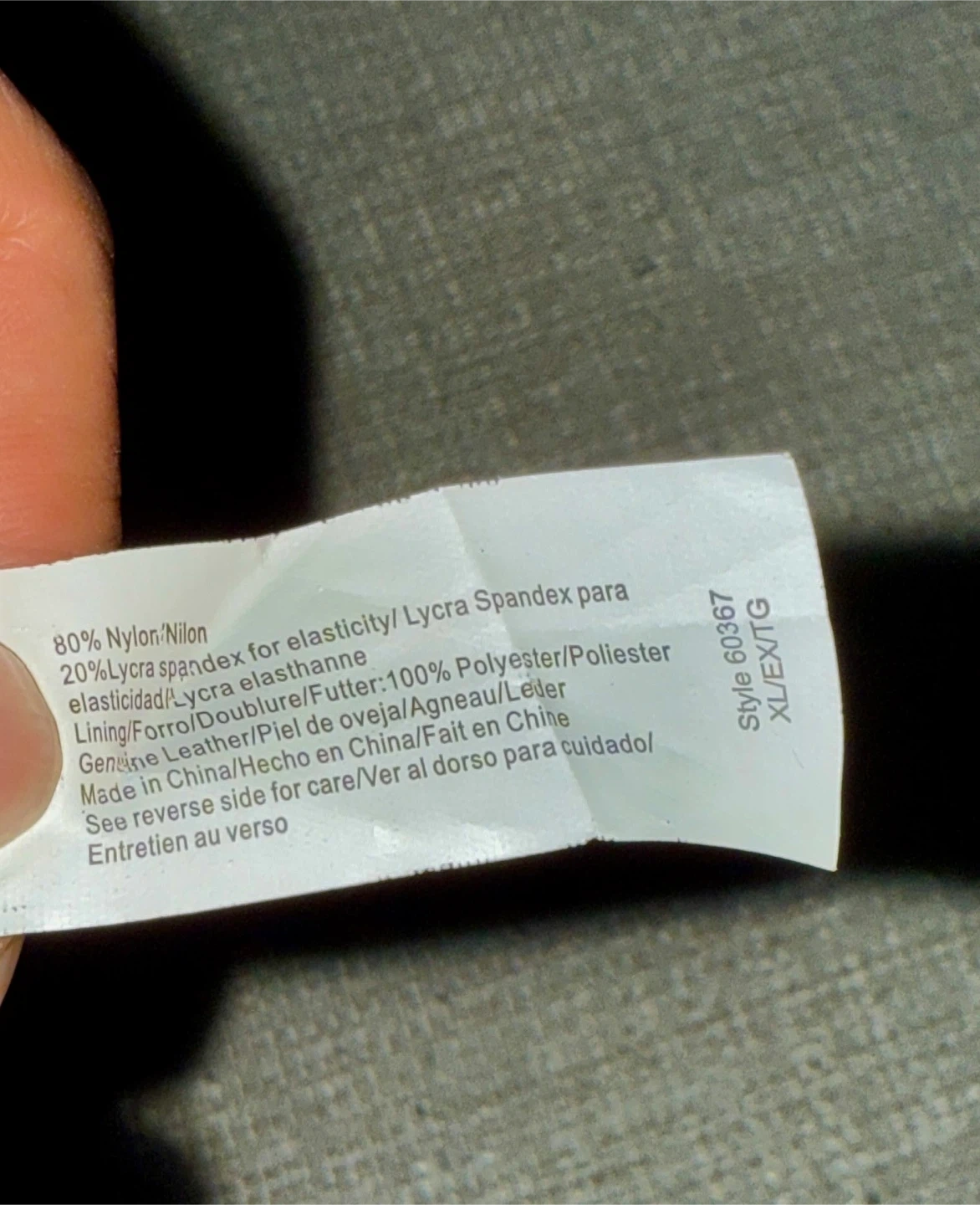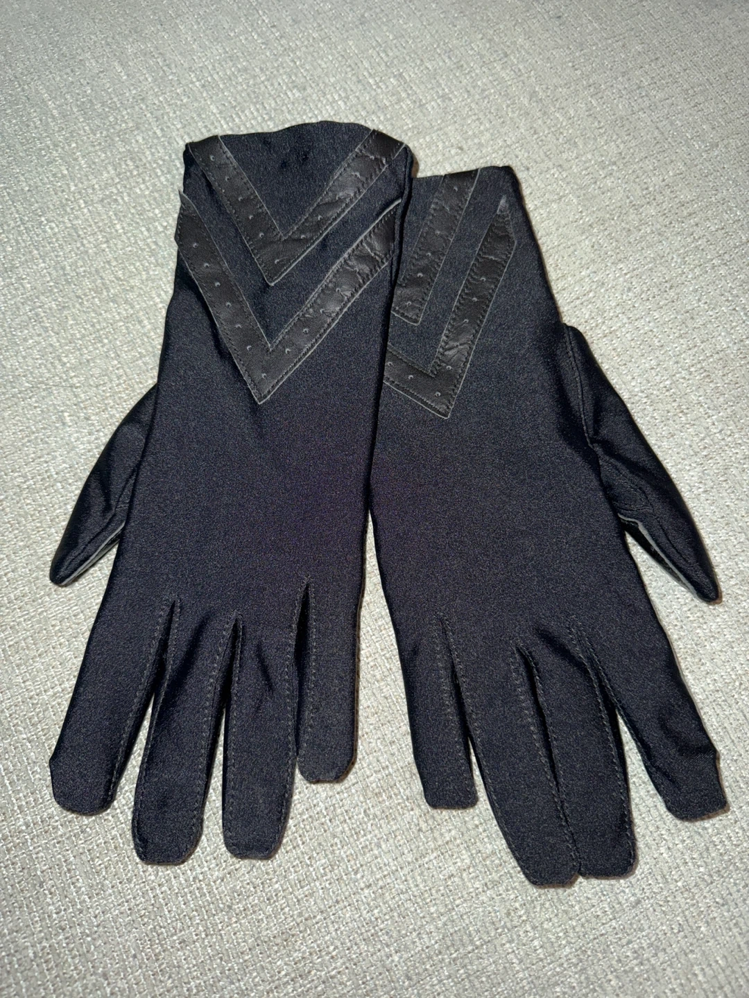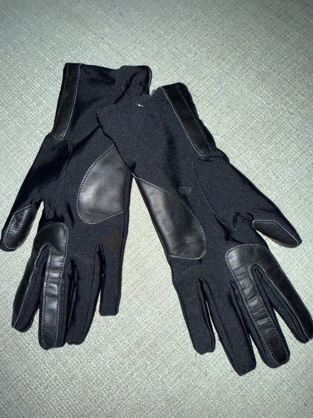 Selling a pair of black gloves. They are size XL and made of 80% Nylon and 20% Lycra spandex It runs small; it fits a size M or L. The lining is 100% polyester, with genuine leather details. Perfect for keeping your hands warm and stylish! Smoke free home.