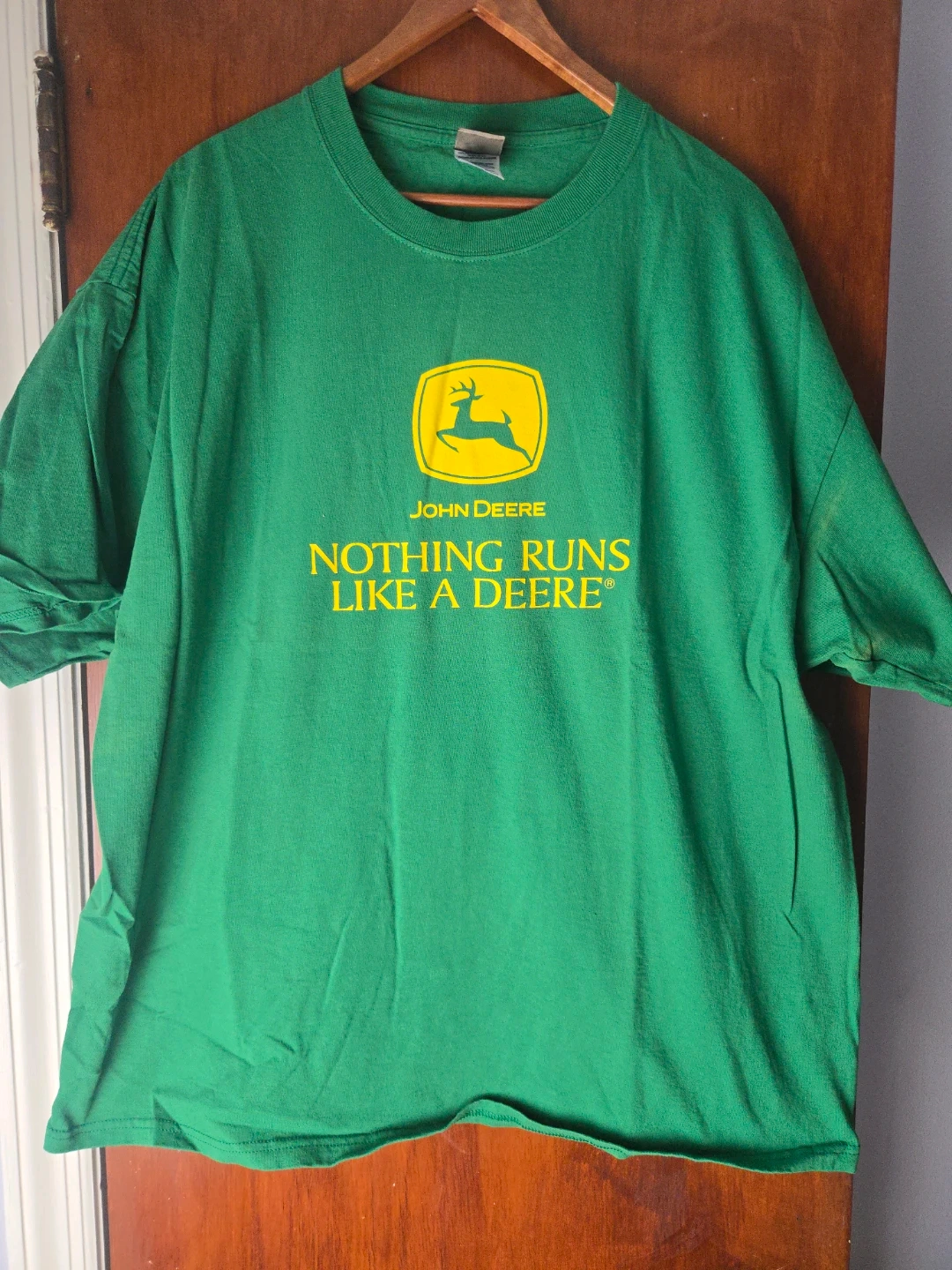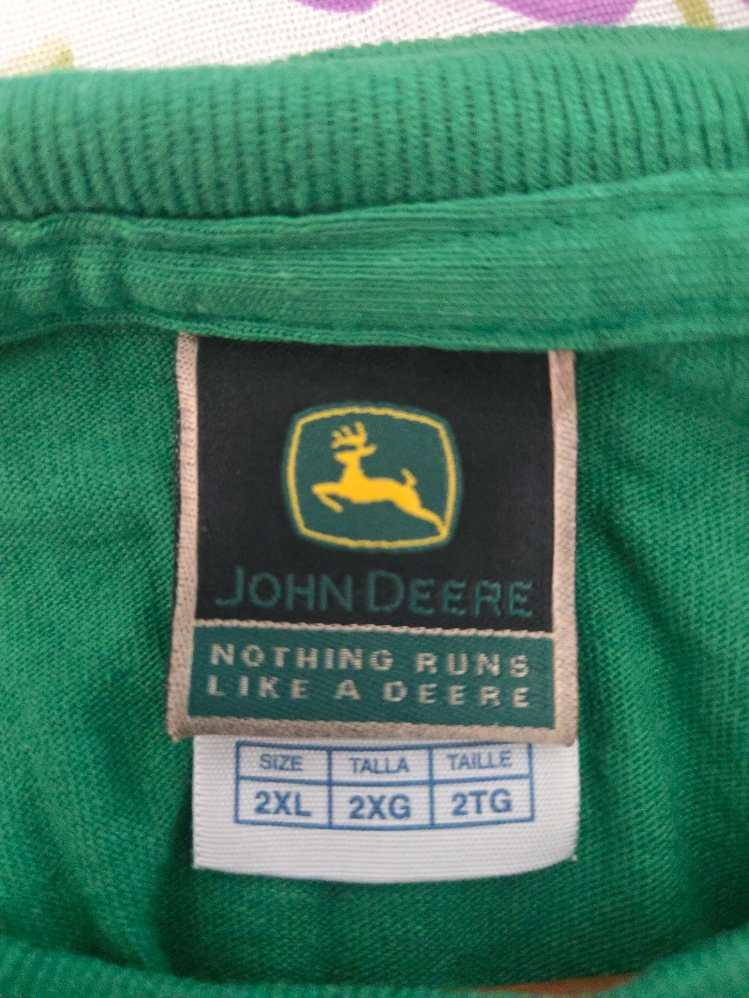 This is a green John Deere t-shirt with the "Nothing Runs Like a Deere" slogan. It's a size 2XL. Cotton material.