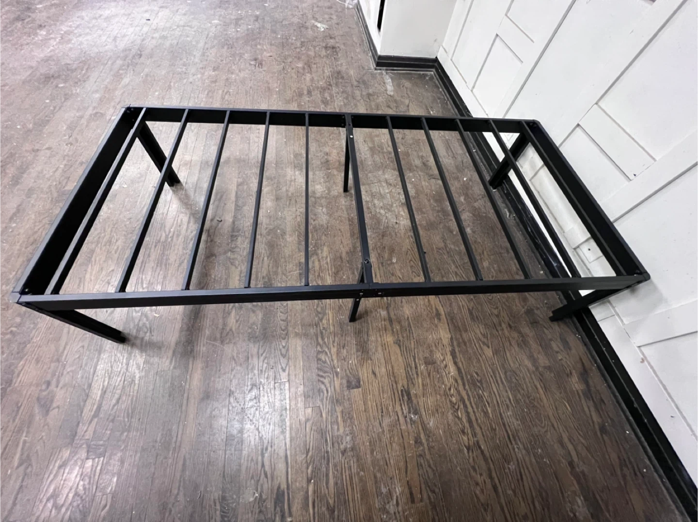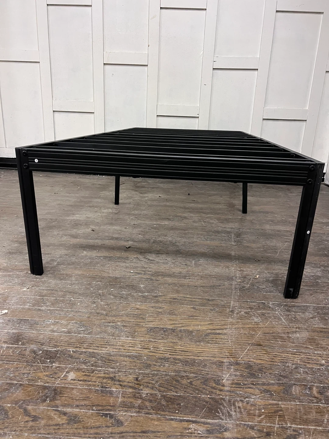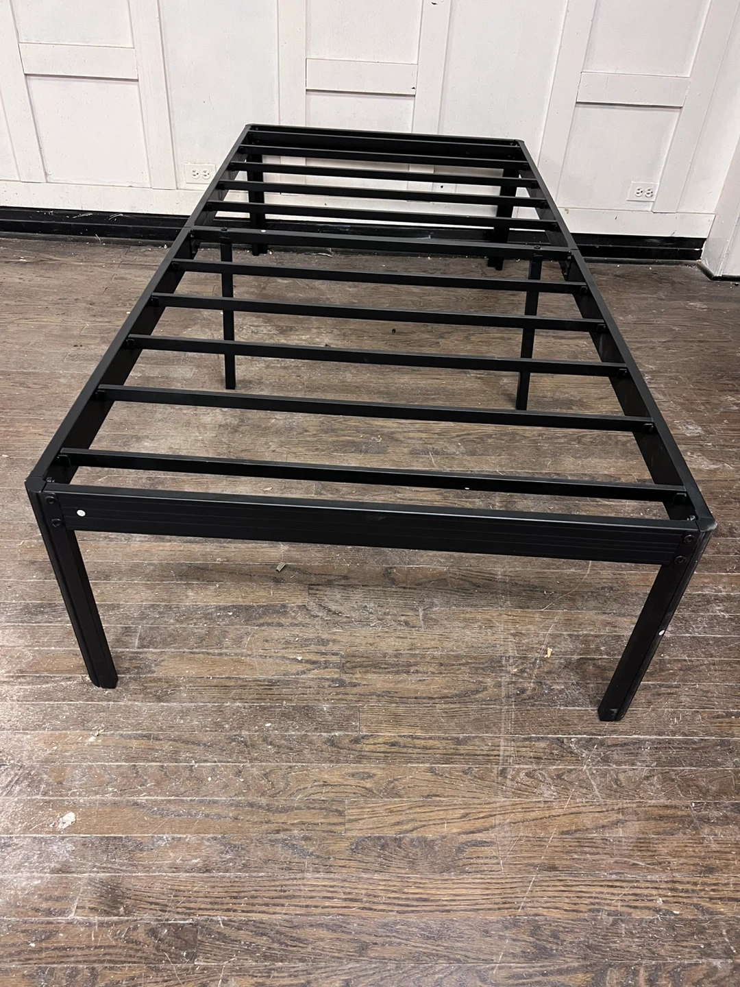 Sturdy black metal bed frame. It's a platform style with a slatted base. This frame offers a solid foundation for your mattress.