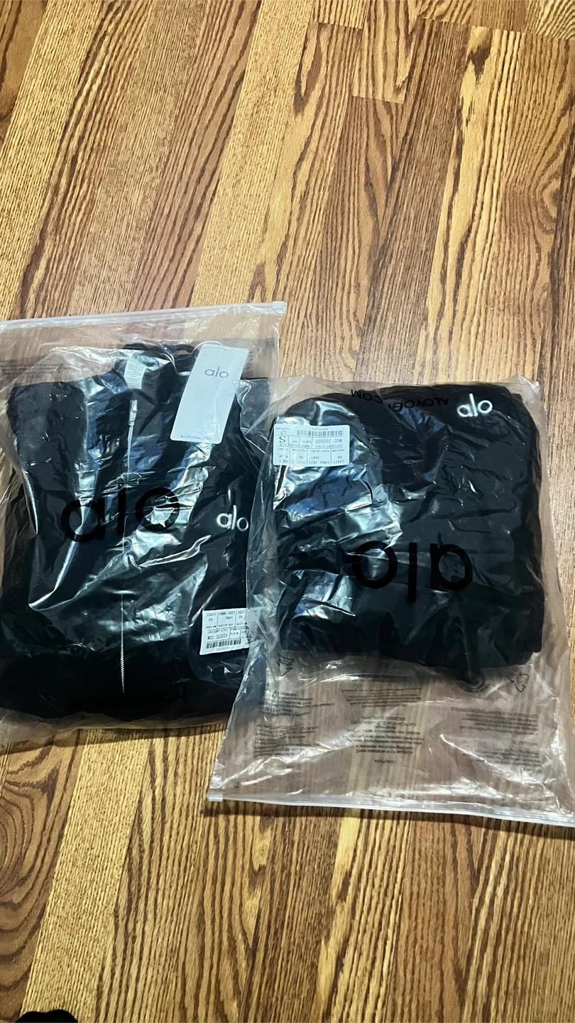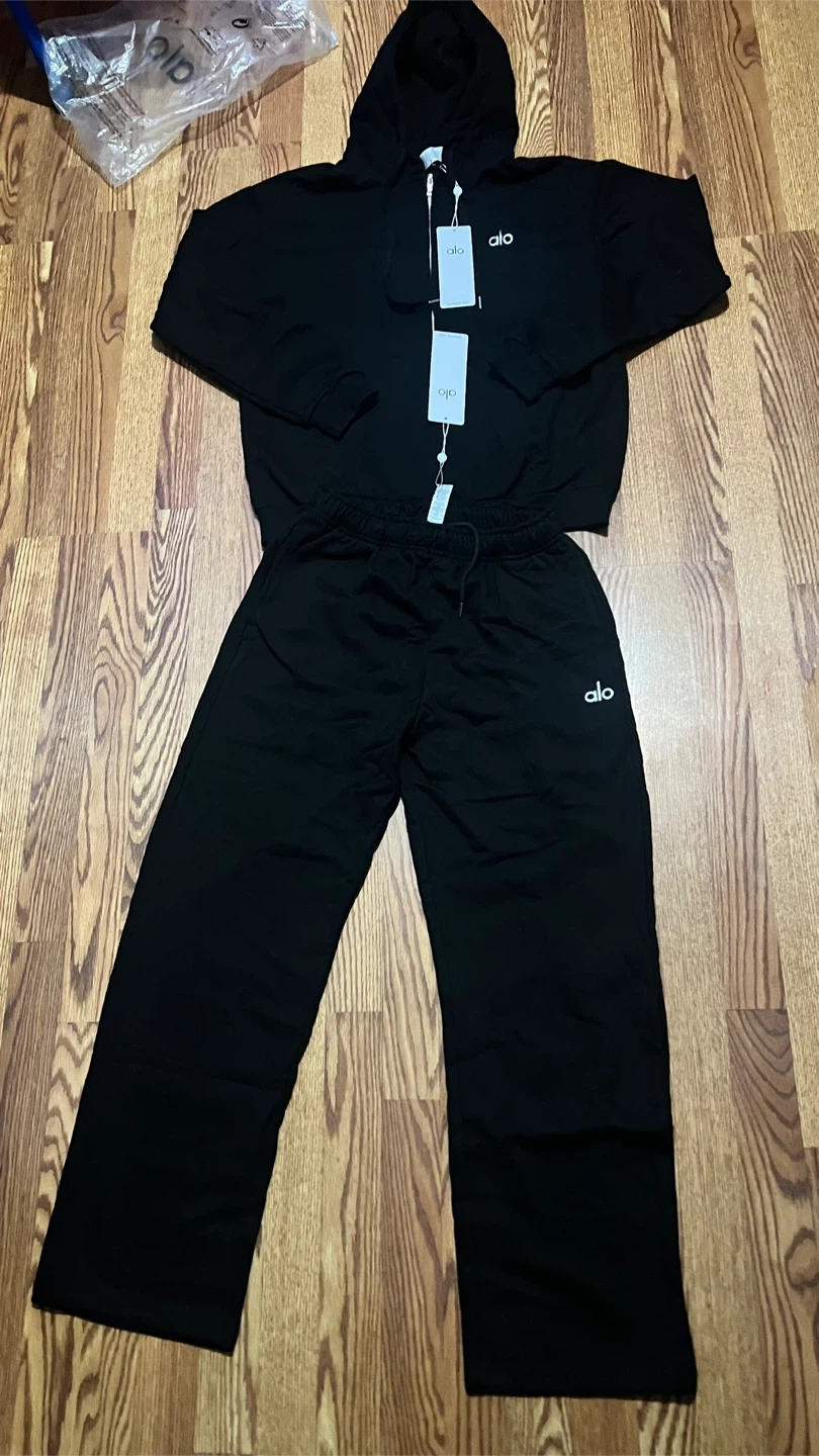 Comfortable Alo Yoga hoodie and matching sweatpants set. Both pieces are black with the Alo logo. Hoodie is a size small. Sweatpants are size small.