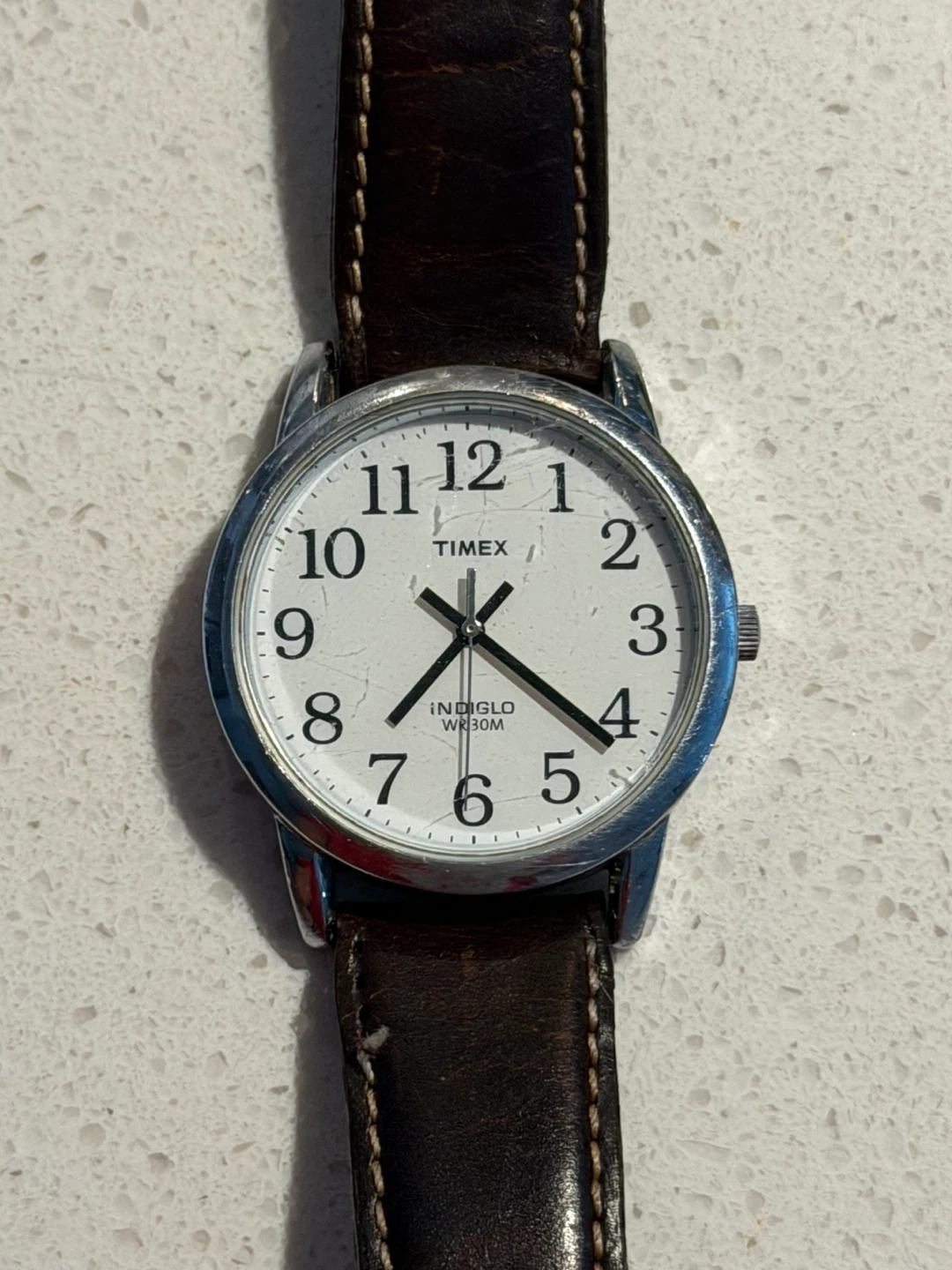 This Timex watch features a gold-tone metal band and a white dial with easy-to-read numbers. It has Indiglo backlight and is water-resistant up to 30 meters. Some minor scratches are visible on the face.