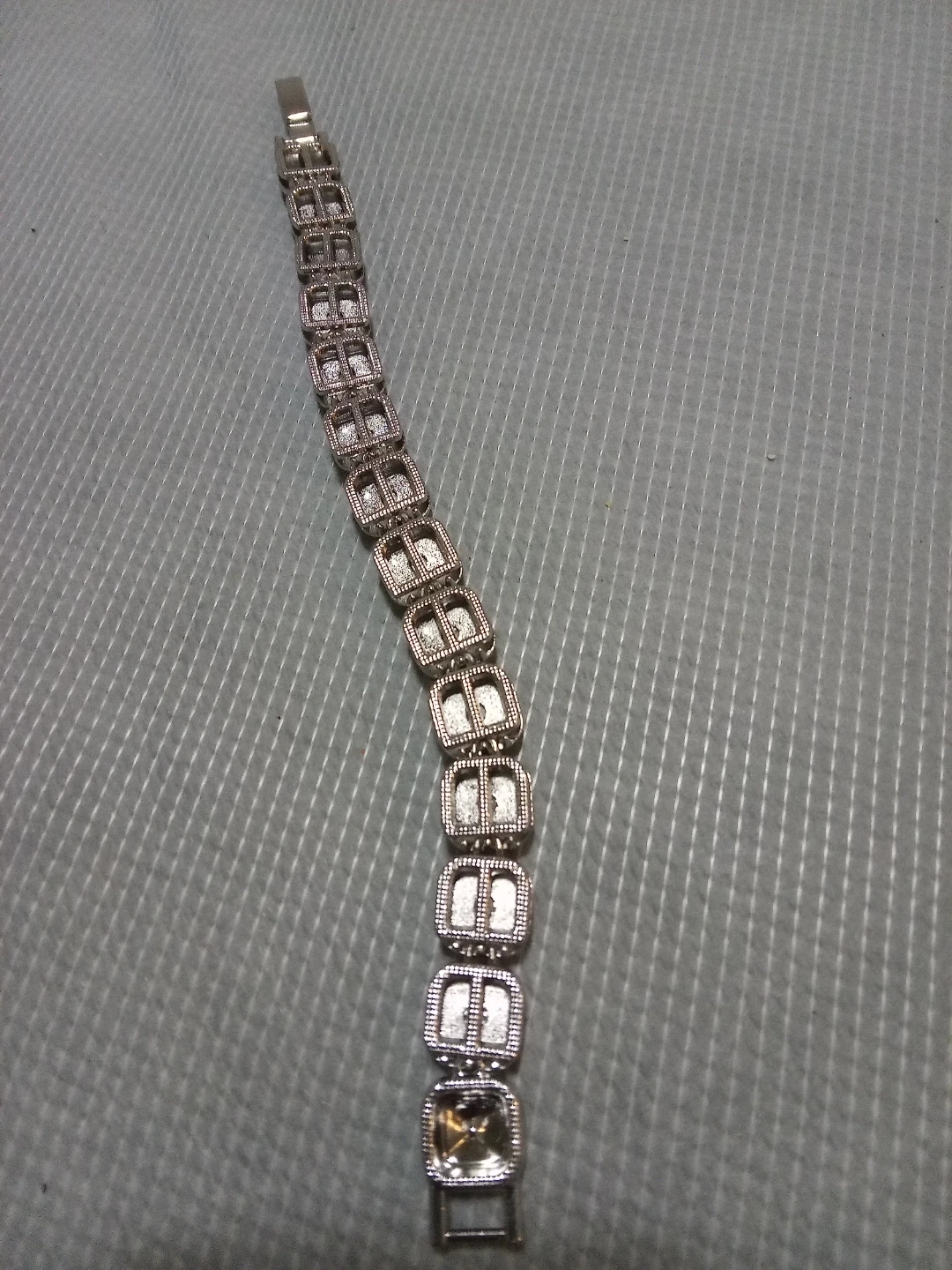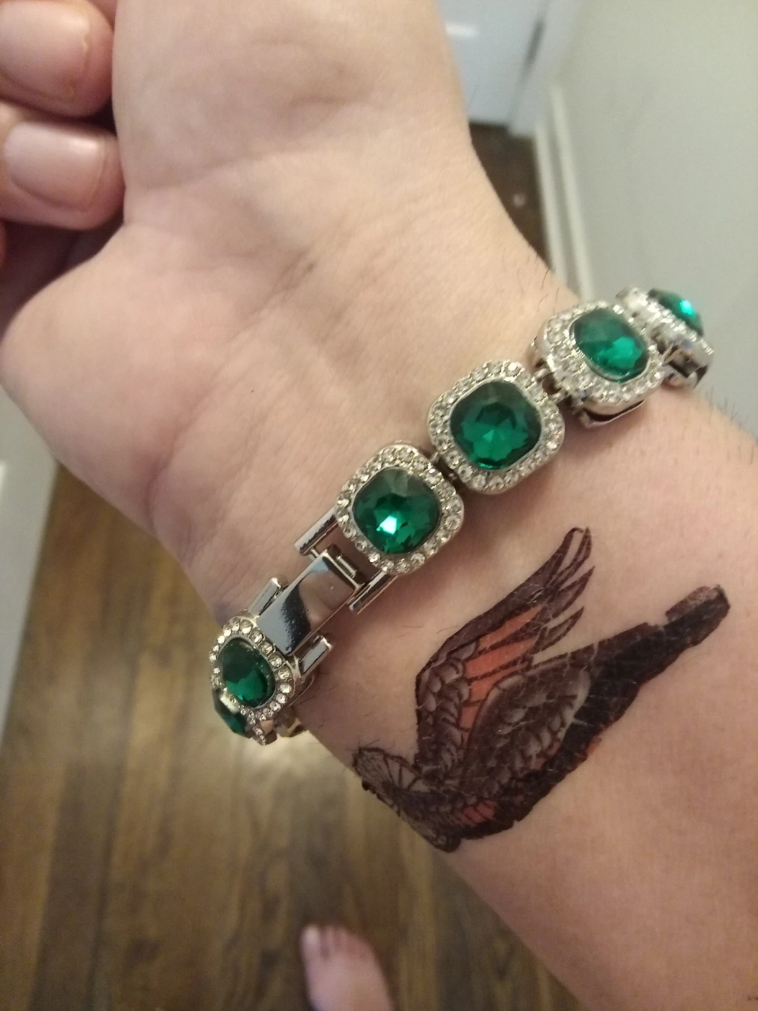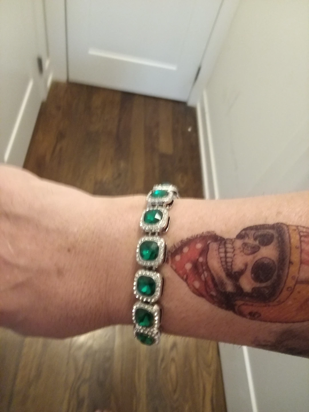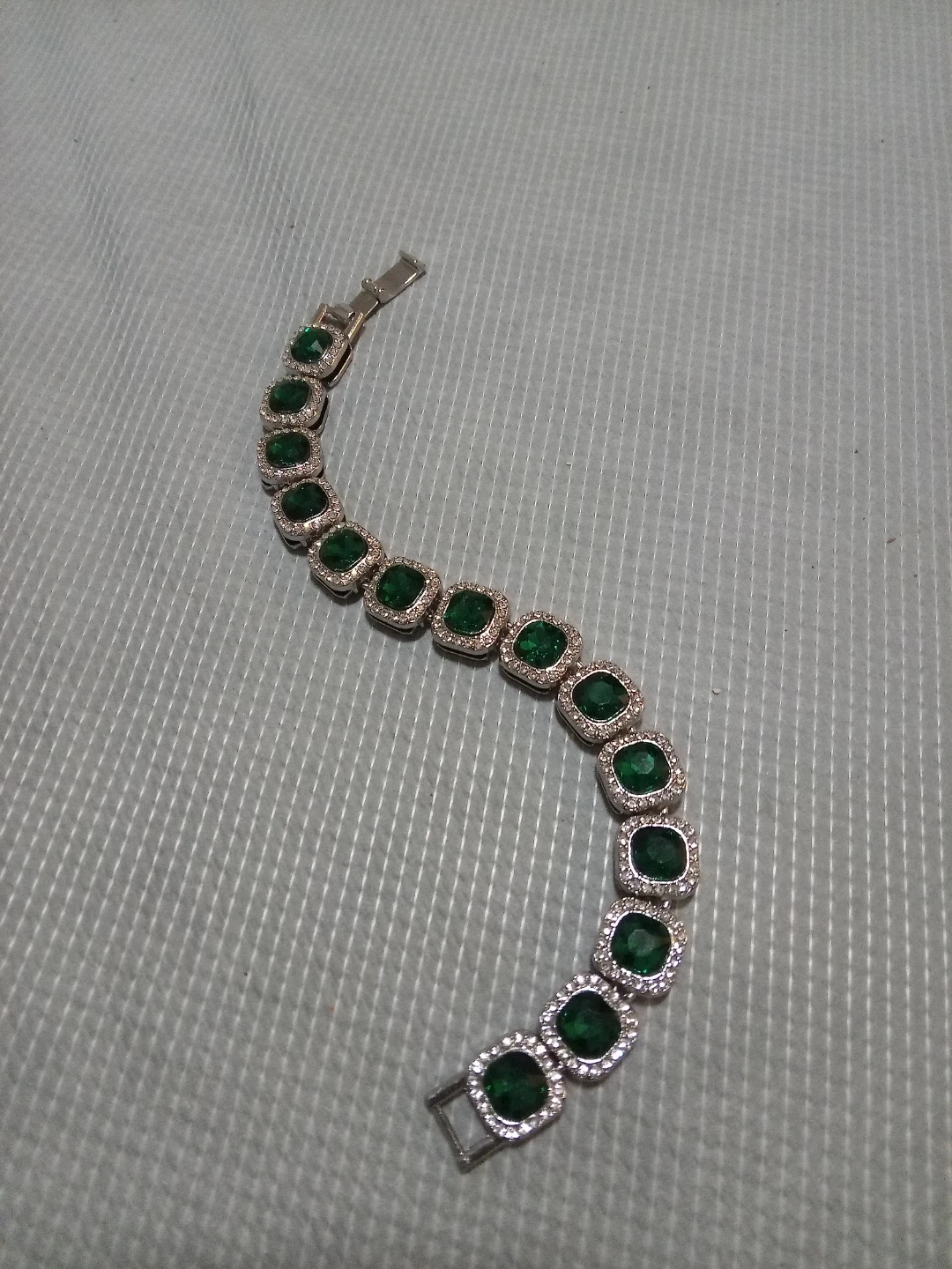 This bracelet features a row of square-cut emerald green stones surrounded by clear accents. It has a silver-tone finish and a secure clasp closure. It's perfect for adding a touch of sparkle to any outfit!