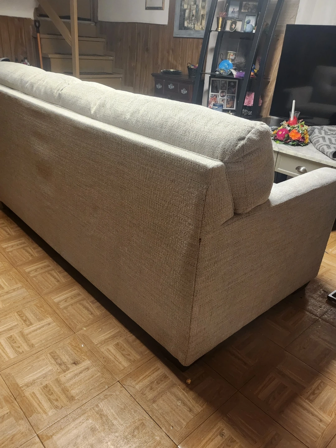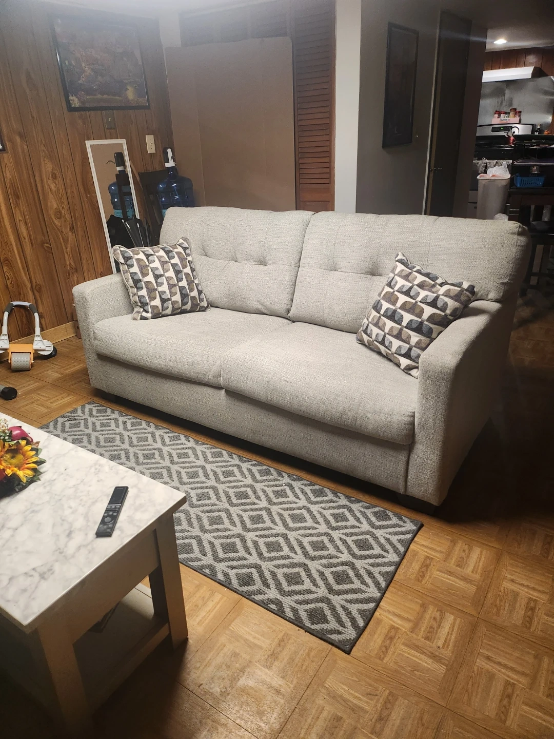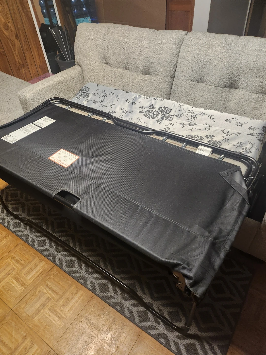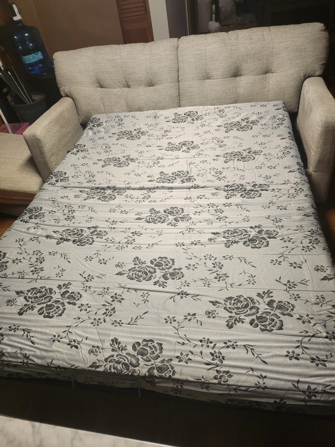 This sofa easily converts into a bed. It's upholstered in a light gray textured fabric. The pull-out mattress has a floral pattern. It comes with two decorative pillows.