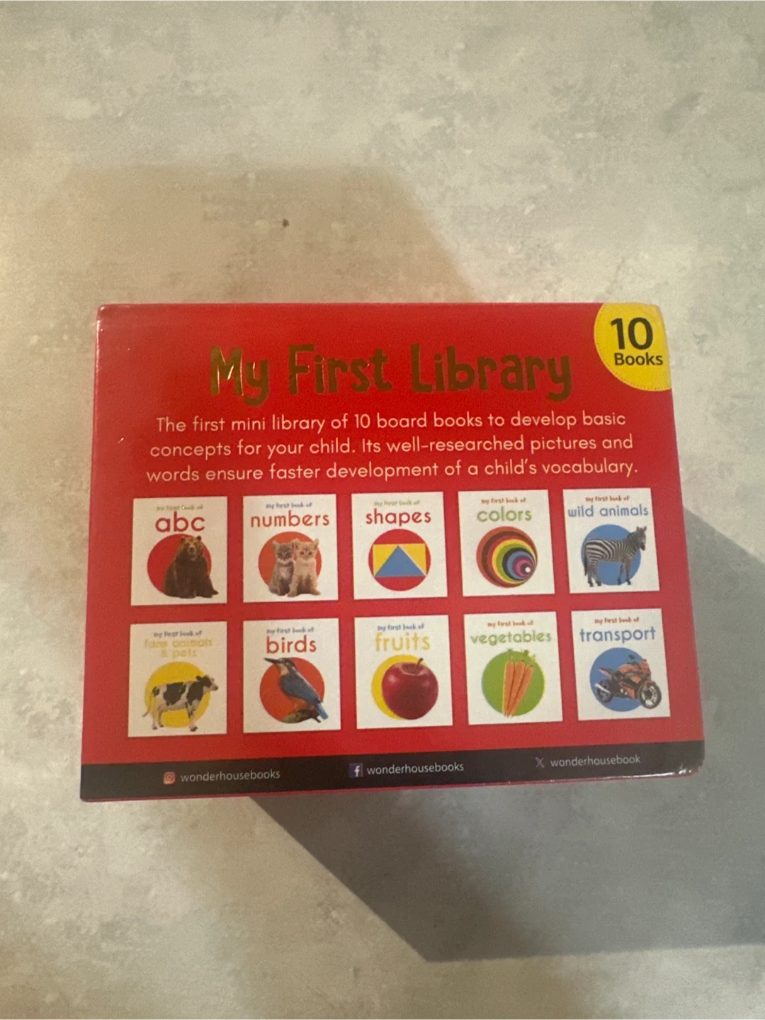Selling 'My First Library,' a set of 10 mini board books designed to introduce basic concepts to young children. These books use well-researched pictures and words to help develop a child's vocabulary. Includes books about abc, numbers, shapes, colors, wild animals, farm animals & pets, birds, fruits, vegetables, and transport