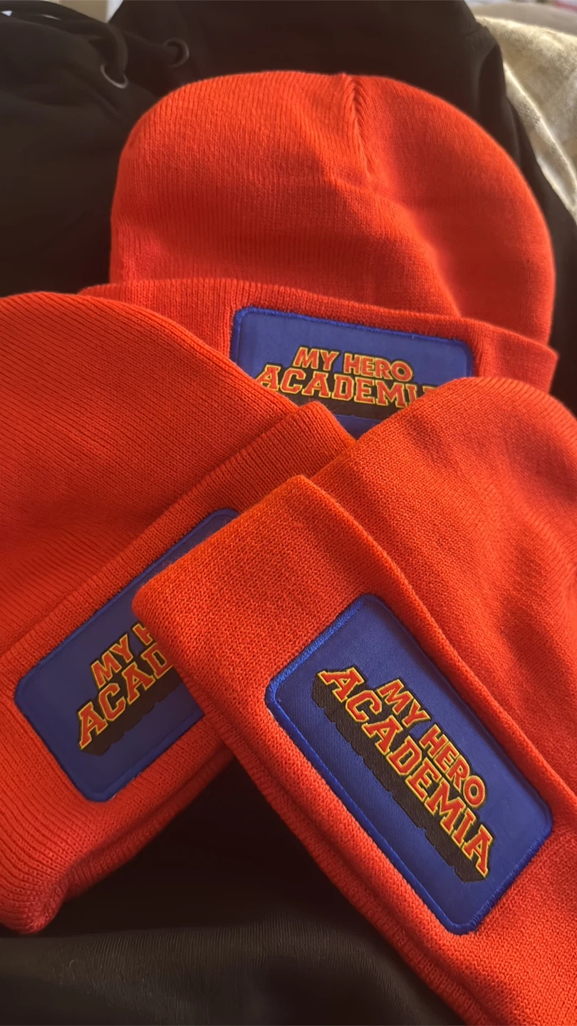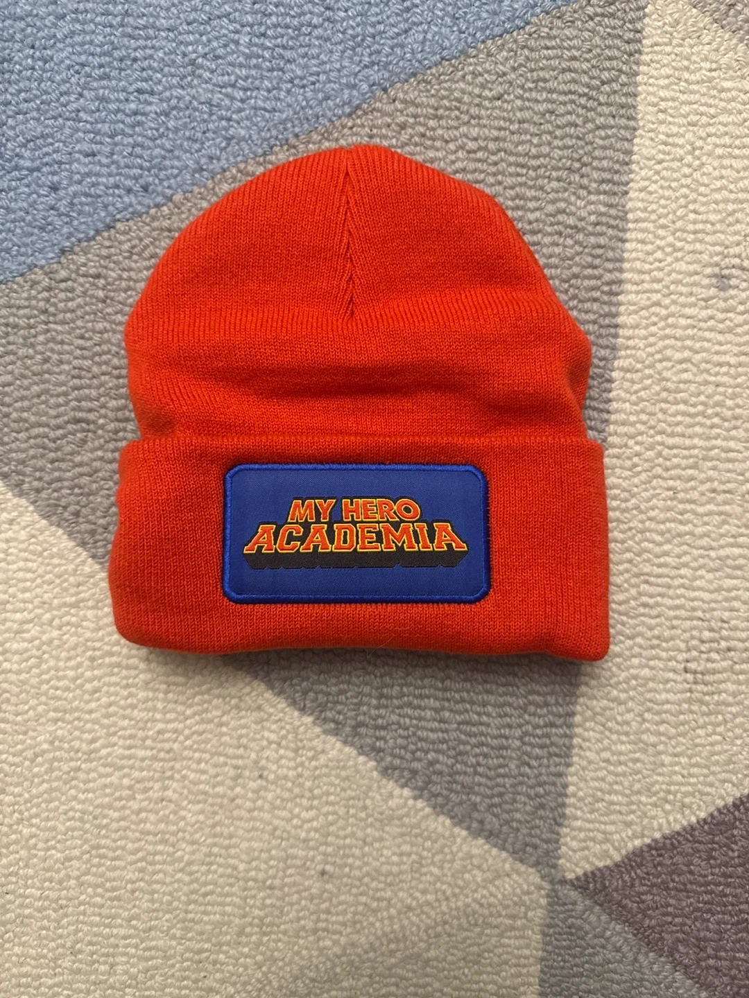 Selling a red beanie featuring a My Hero Academia logo patch. It's in great condition and ready to keep you warm! New