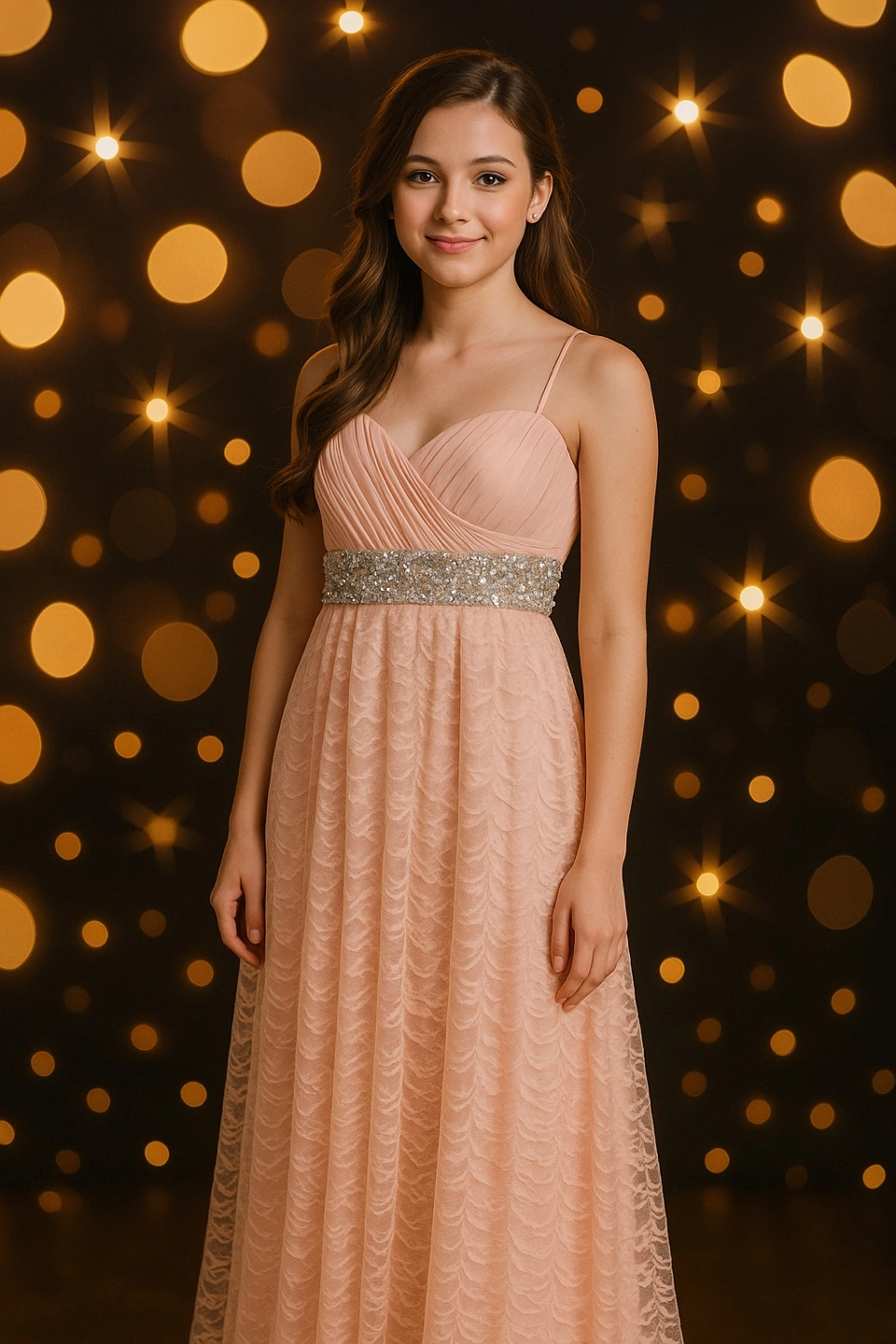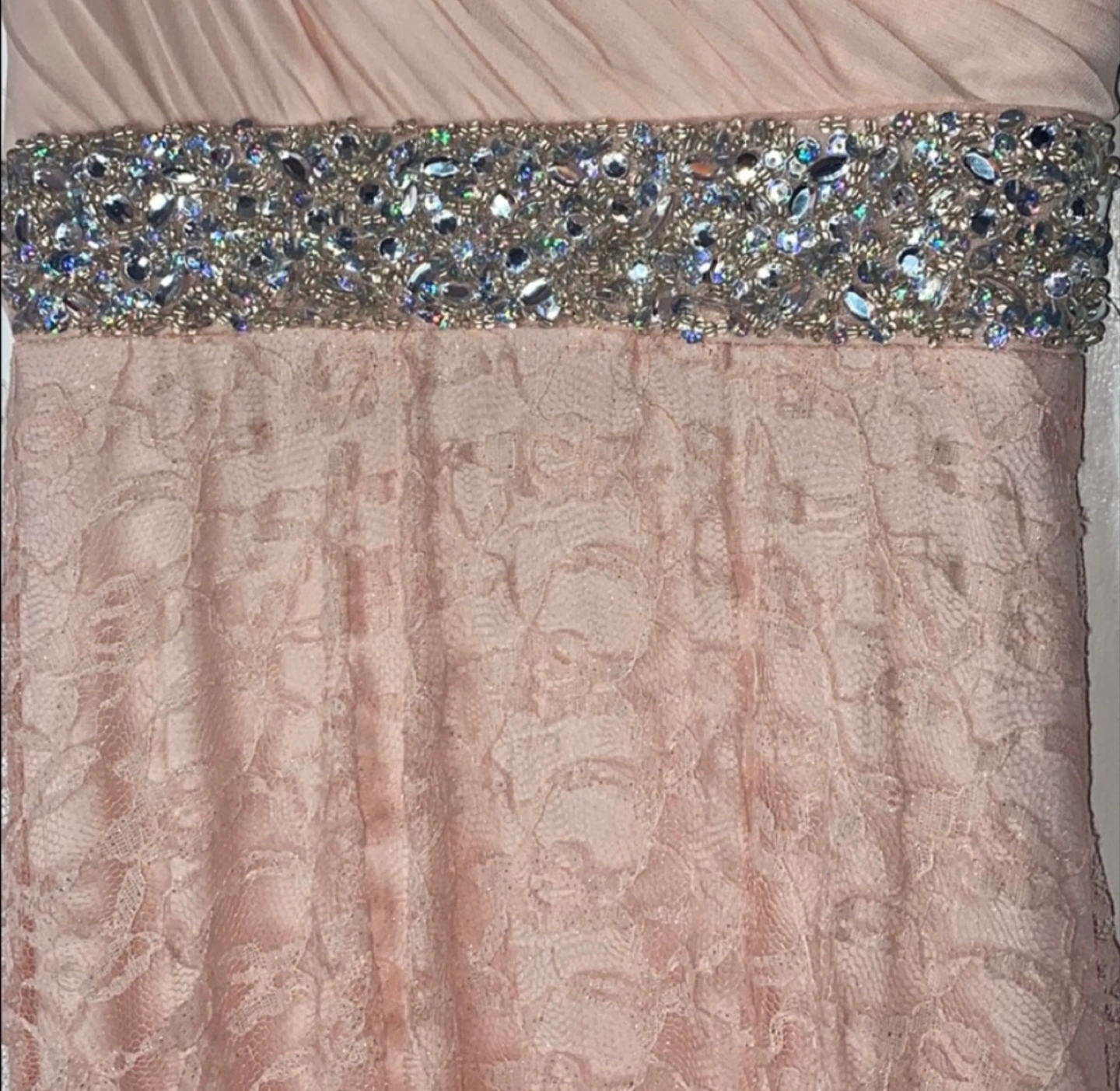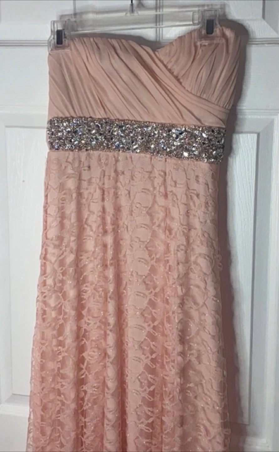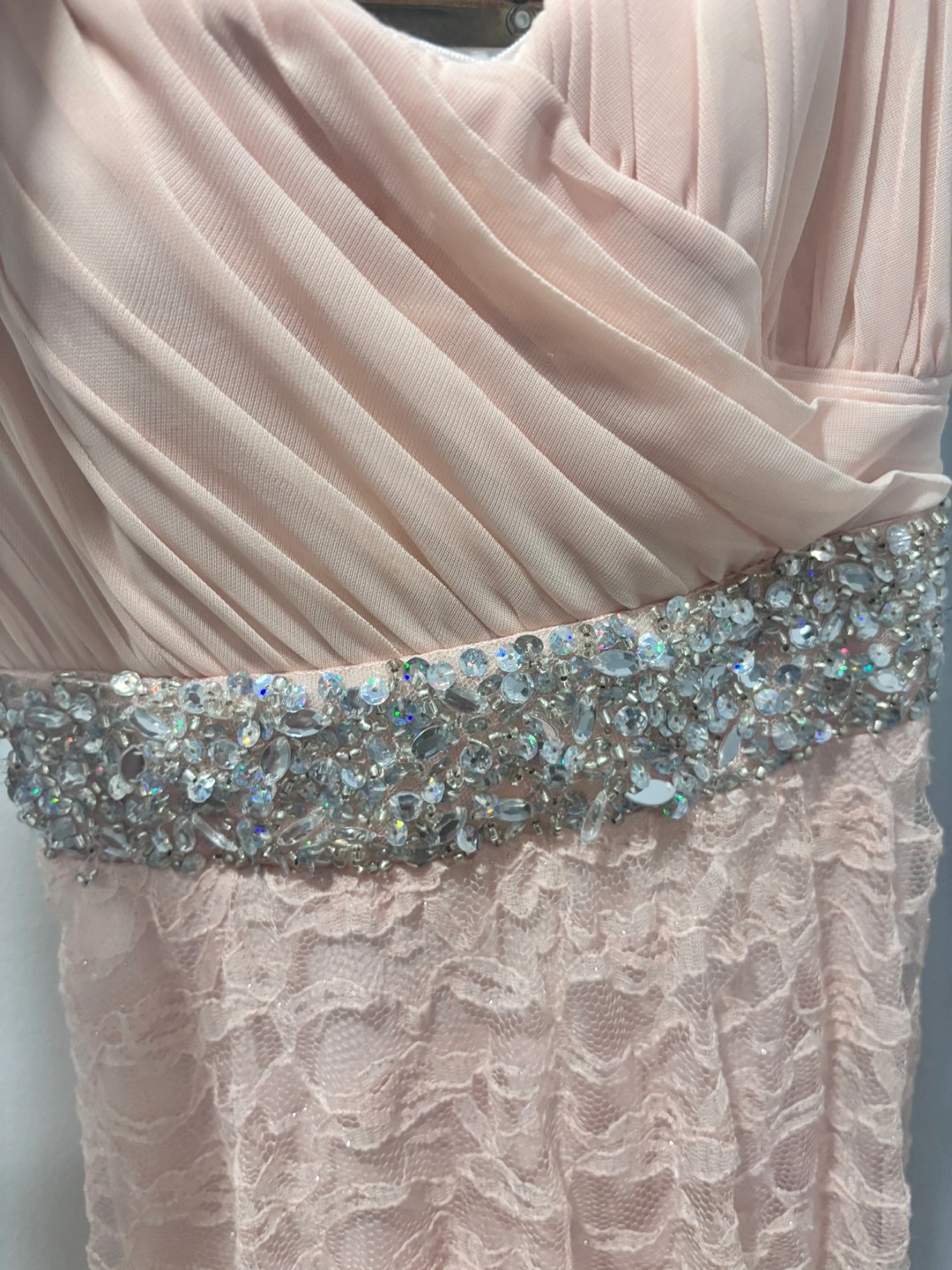 Elegant floor-length blush pink gown featuring a pleated chiffon sweetheart bodice, sparkling rhinestone waist, and delicate lace overlay with subtle shimmer. Worn once for a formal event — in excellent condition. Fully lined, side zip closure. Perfect for prom, formal occasions, bridesmaid, or evening wear. Measurements (approx): Bust 33” | Waist 26” | Length 58” Style: Sweetheart lace gown with rhinestone waist Color: Soft blush pink Size: 5 (Junior sizing — fits roughly women’s size 2–4) Condition: Worn once, excellent condition Fabric: Lace overlay with pleated chiffon bodice and crystal waistband Closure: Side zipper, partially lined Style: Romantic, feminine, classic