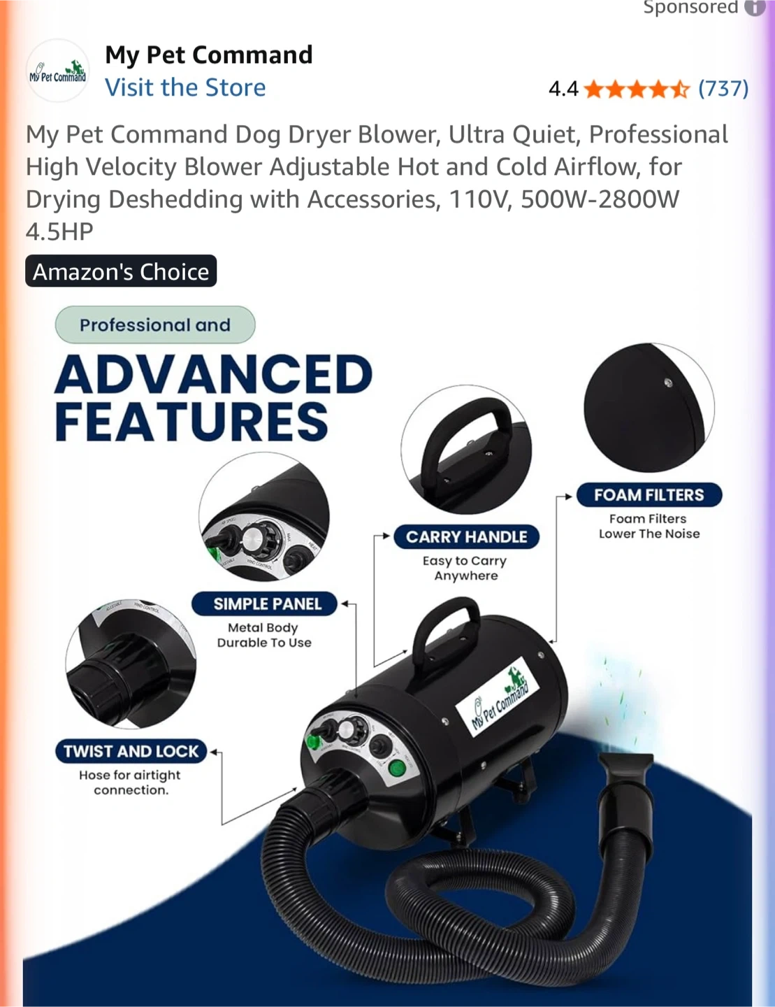**Yellow Selling a My Pet Command Dog Dryer Blower. It's an ultra quiet, professional high velocity blower with adjustable hot and cold airflow. It's great for drying and deshedding your pet. It comes with accessories and operates at 110V, 500W-2800W, 4.5HP Floral Park/ Glen Oaks pick up