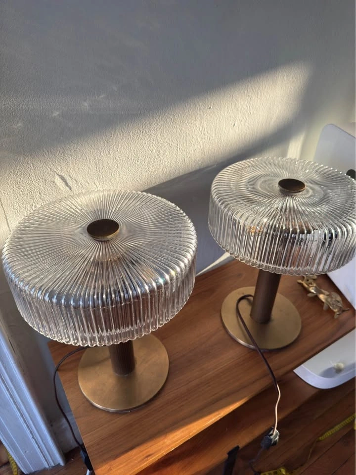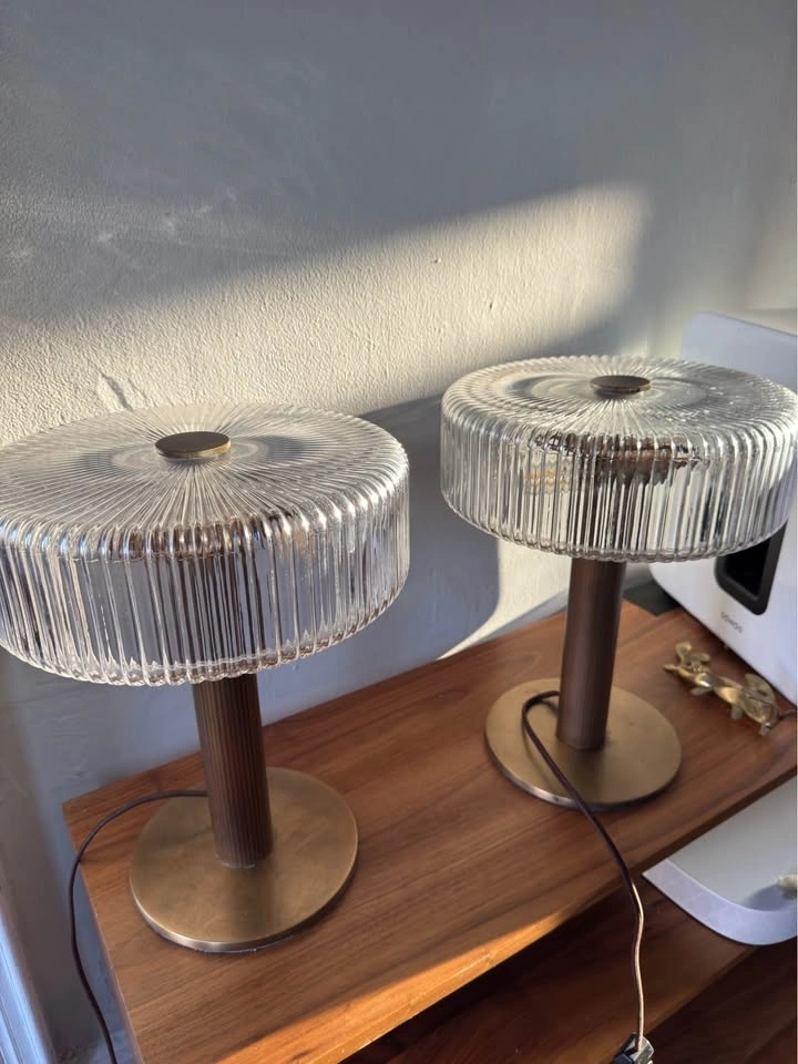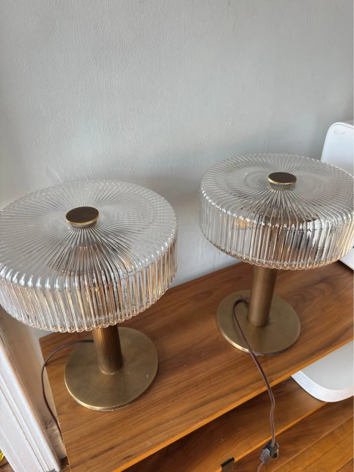 Bring the Soho House aesthetic into your home with a matched pair of Renato Table Lamps from Soho Home's signature collection. These lamps exude understated luxury — their warm glow and refined form elevate any bedside table, console, or living room corner. Condition: Like new — both lamps pristine, no scratches or damage. Quantity: 2 lamps (sold as a set) | Approx. Dimensions per lamp: 9.2"W x 9.2"D x 11.8"H Material: Brass-finish metal base | Compatible with standard LED bulbs. A pair from Soho Home retails at $900. Moving sale — fraction of the cost.