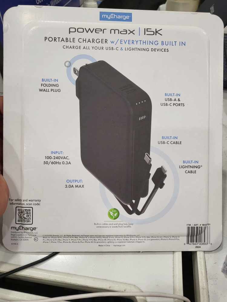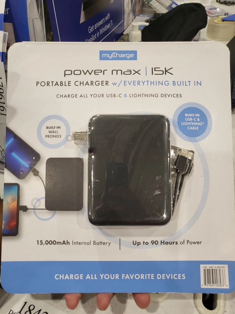 Selling a myCharge Power Max 15K portable charger. It features everything built-in to charge all your USB-C & Lightning devices. Key features include: - Built-in wall prongs - Built-in USB-A & USB-C ports - Built-in USB-C cable - Built-in Lightning cable It has a 15,000mAh internal battery and provides up to 90 hours of power