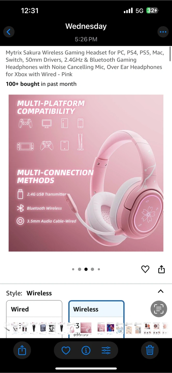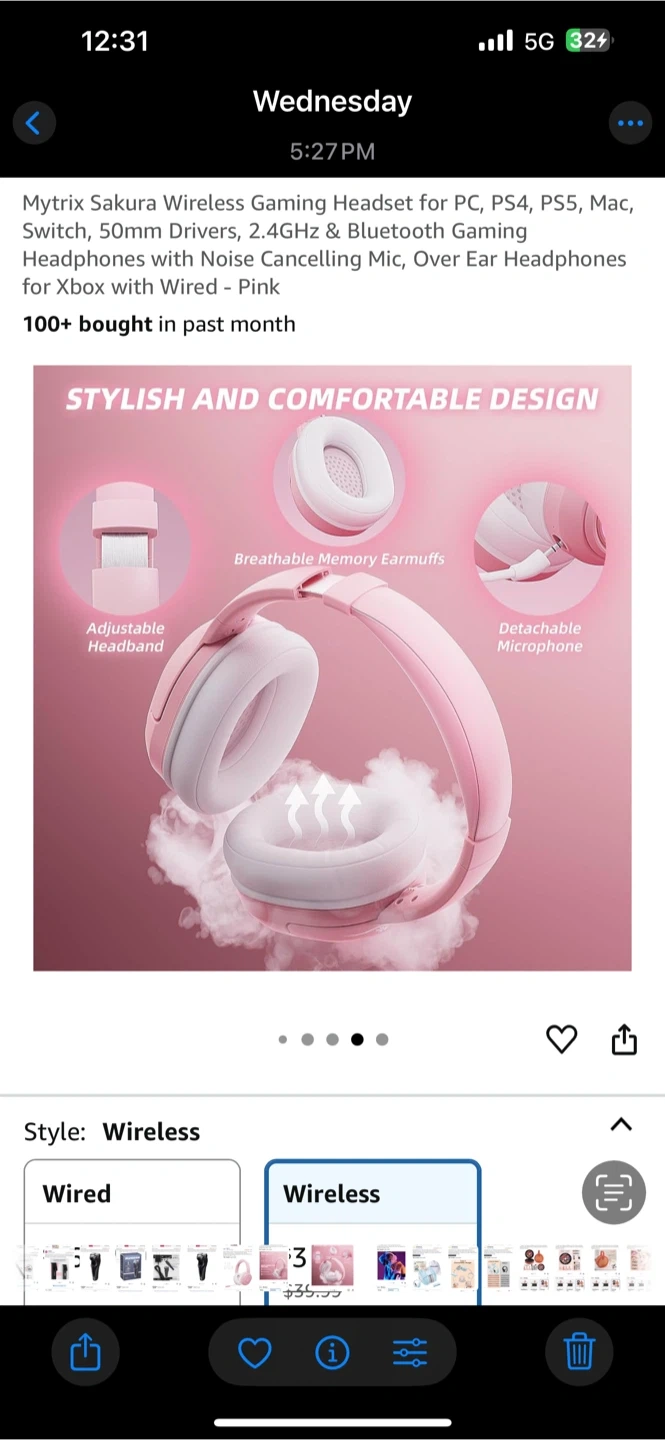 60Selling a Mytrix Sakura Wireless Gaming Headset in pink! It's compatible with PC, PS4, PS5, Mac, Switch, and Xbox. It has 50mm drivers, 2.4GHz & Bluetooth for wireless gaming. Also features noise cancelling mic and over ear headphones.