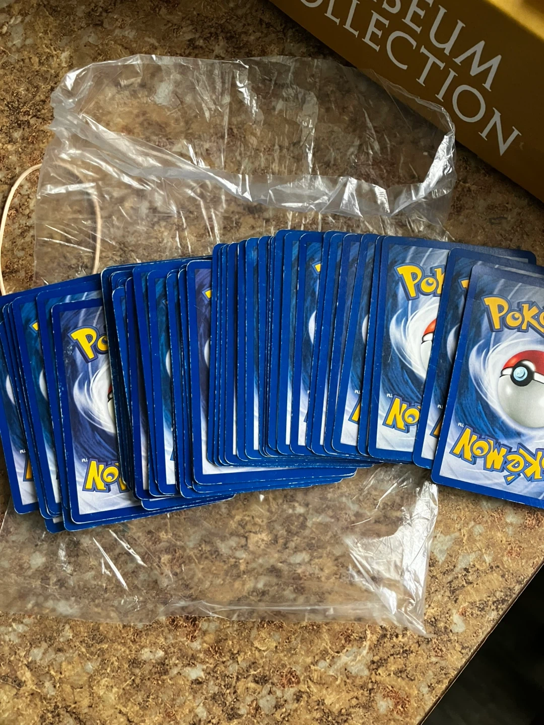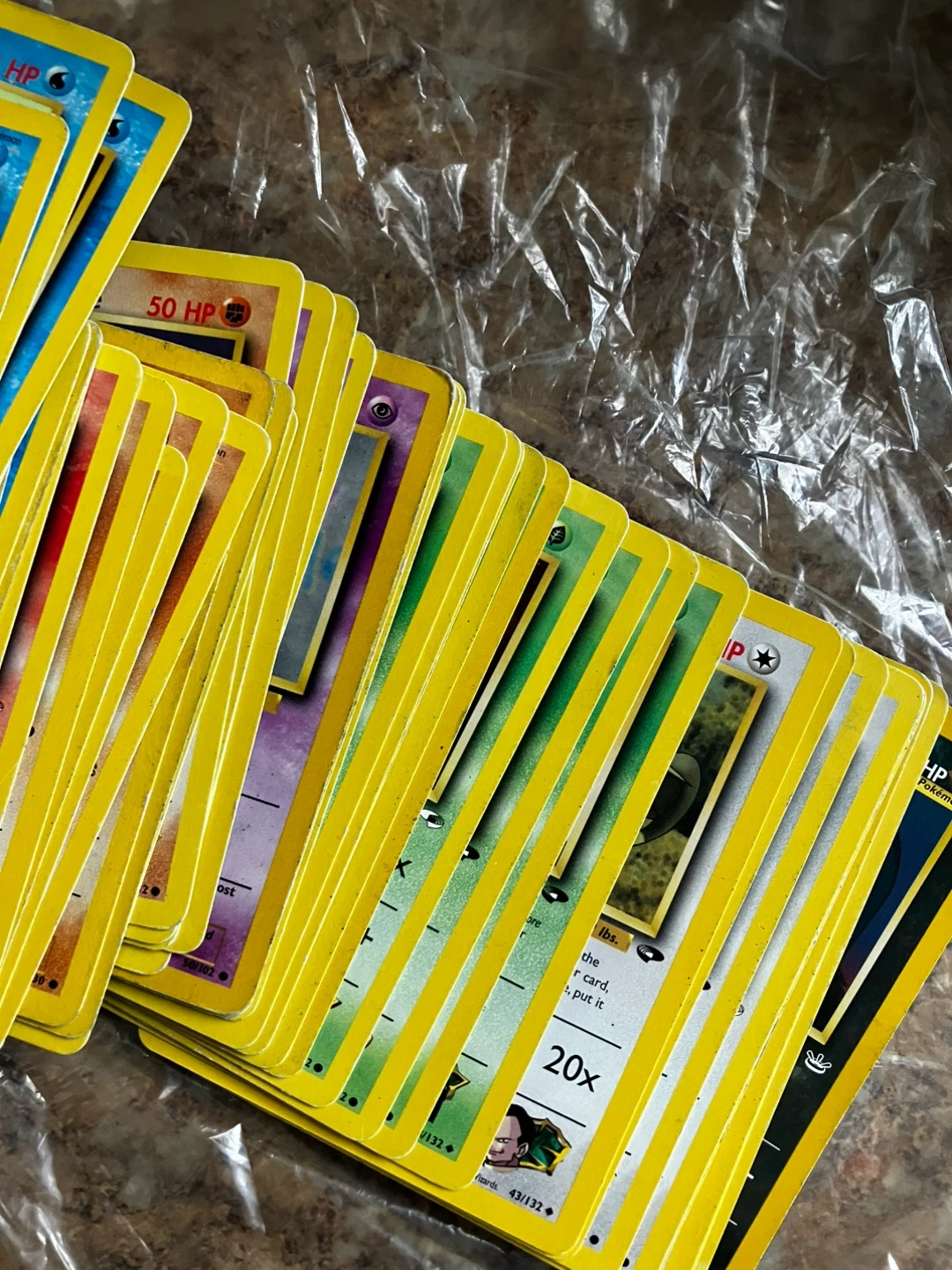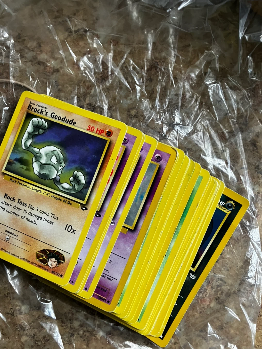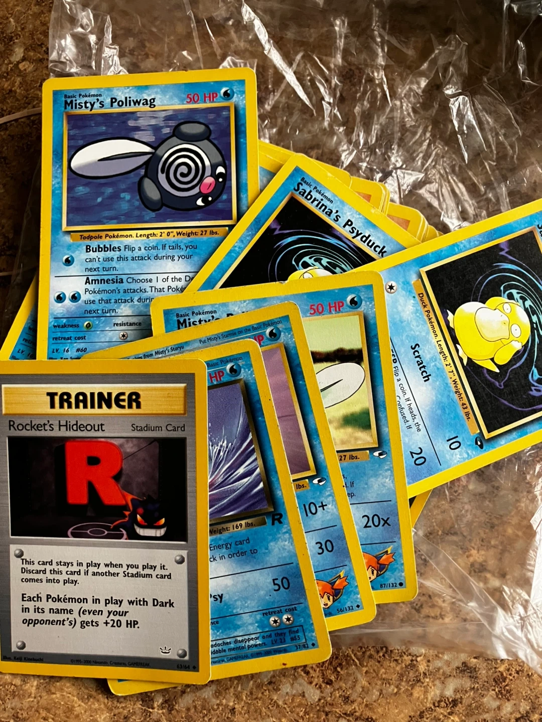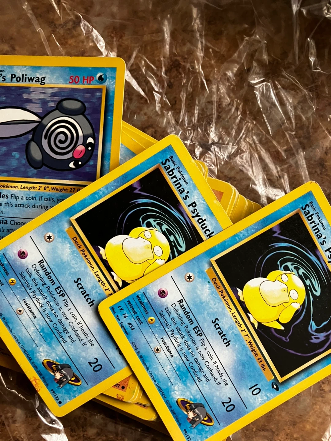 Collection of assorted Pokemon trading cards. Includes cards like Misty's Poliwhag, Sabrina's Psyduck, and Brock's Geodude. Great for collectors or players!