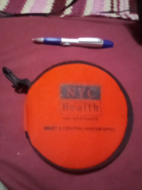 Orange round pouch with NYC Health branding. Includes a blue and silver pen. Pouch has a zipper closure and a clip for attachment. Perfect for carrying small C.D.'s on the go!