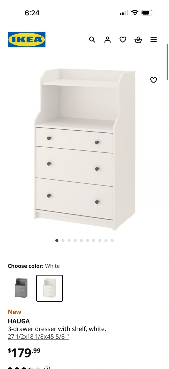 Selling a white IKEA Hauga 3-drawer dresser with a shelf. It's in great condition and ready for a new home! The original listing states it is 27 1/2x18 1/8x45 5/8". Originally bought for $179.99