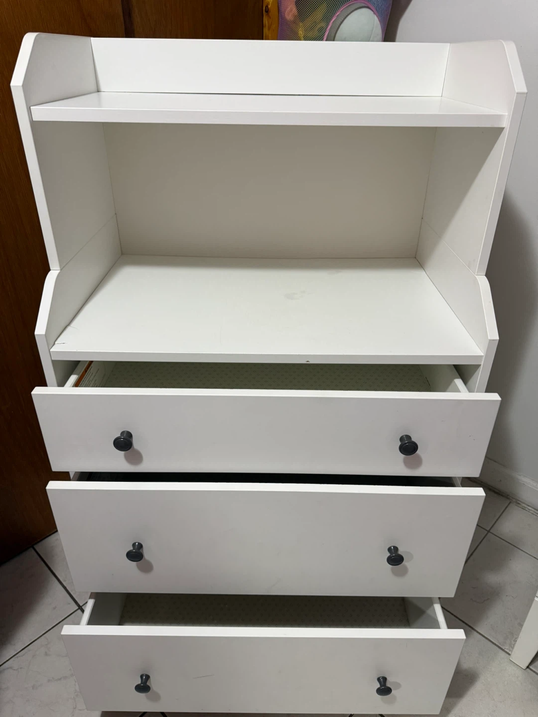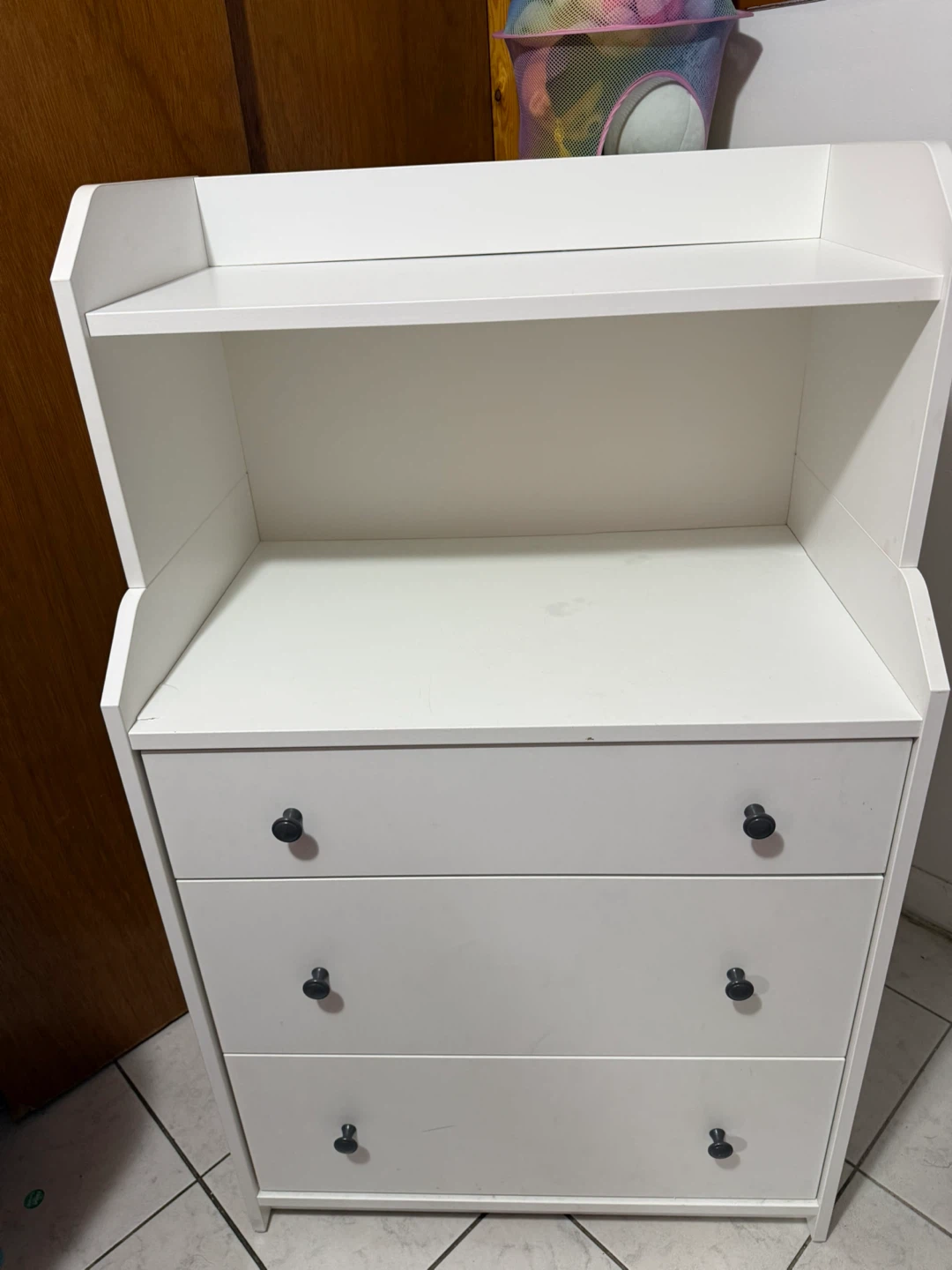 Selling a white IKEA Hauga 3-drawer dresser with a shelf. It's in great condition and ready for a new home! The original listing states it is 27 1/2x18 1/8x45 5/8". Originally bought for $179.99