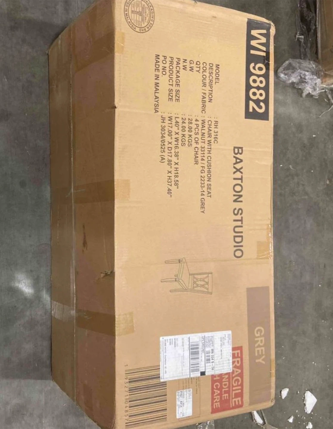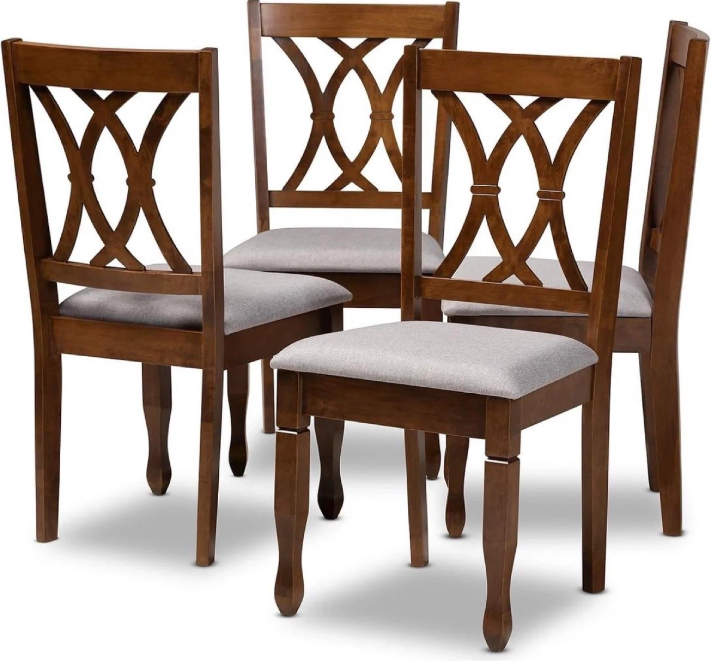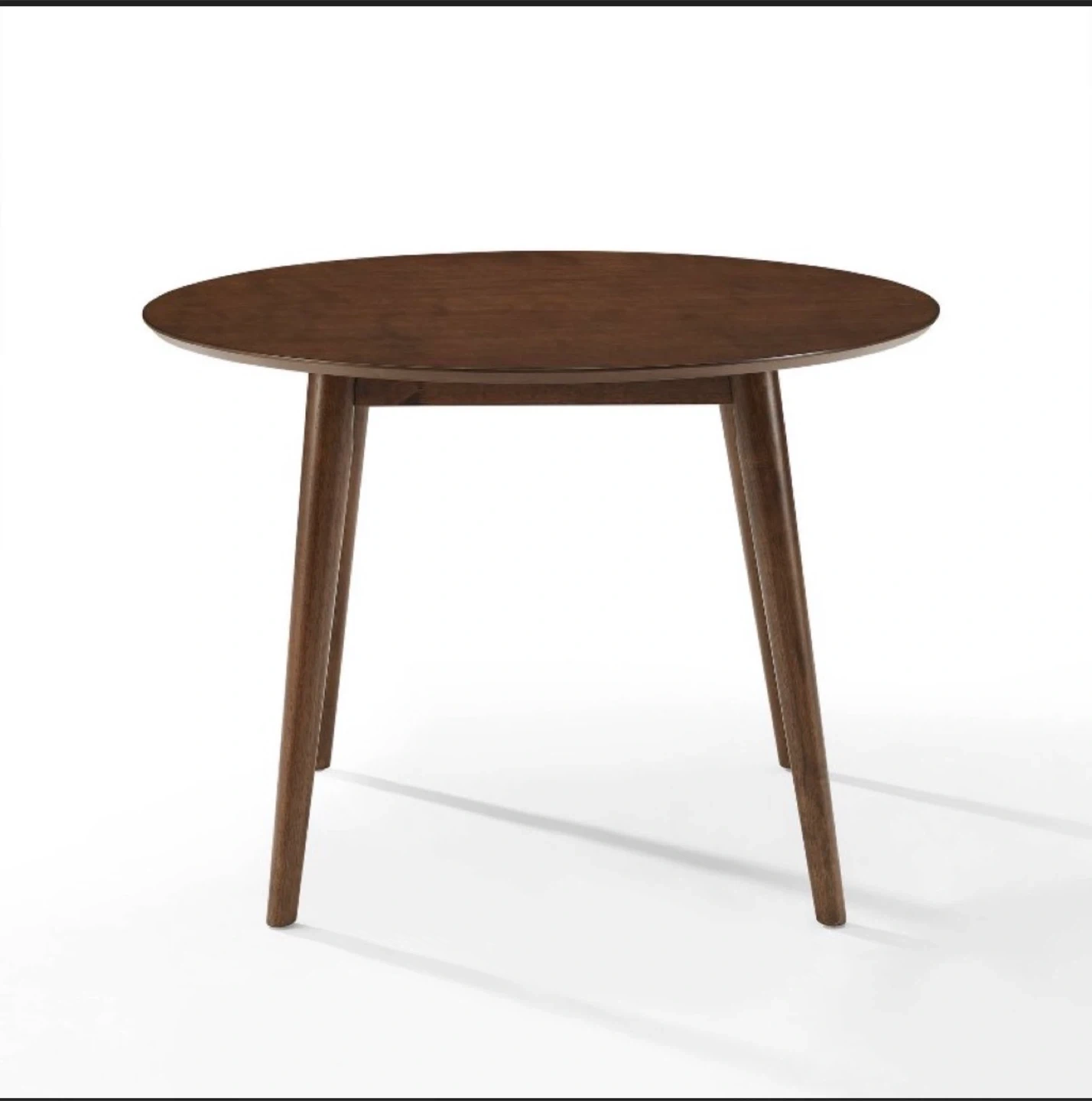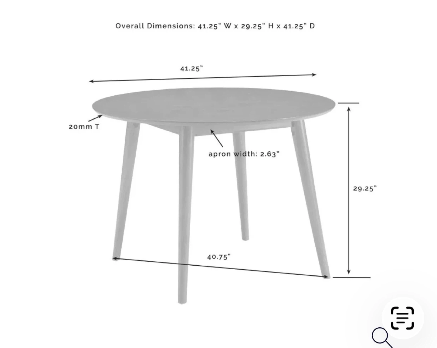 This dining set includes one round dining table and four chairs. The table's overall dimensions are 41.25" W x 41.25" D x 29.25" H. The chairs are upholstered with walnut finish and come in a set of four. The table has a 20mm top thickness and an apron width of 2.63".