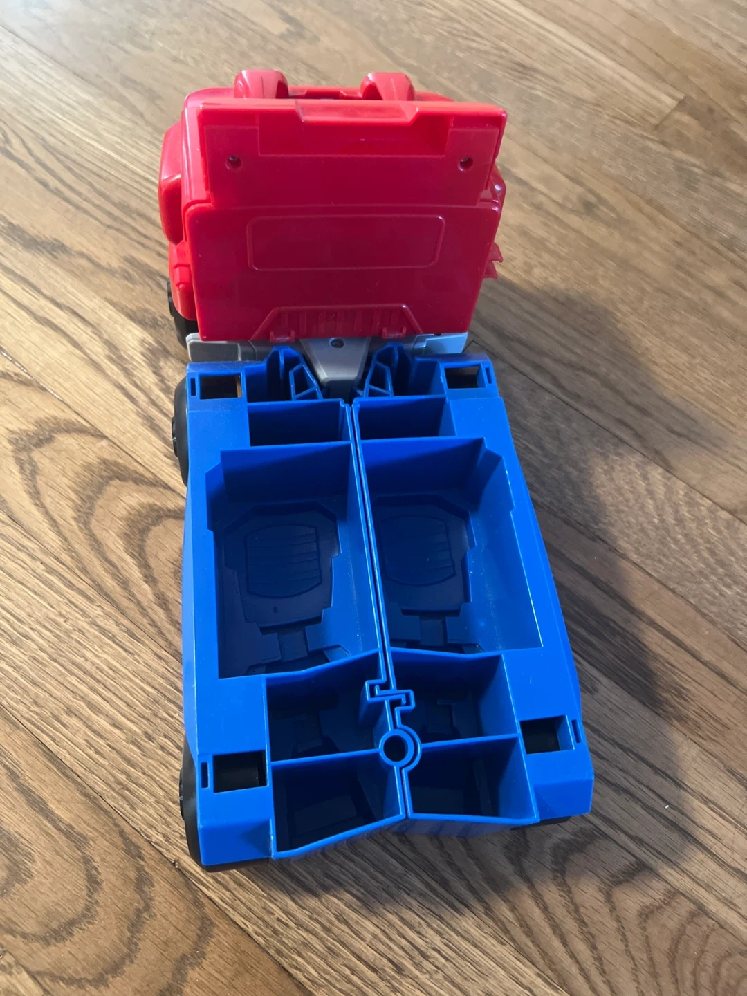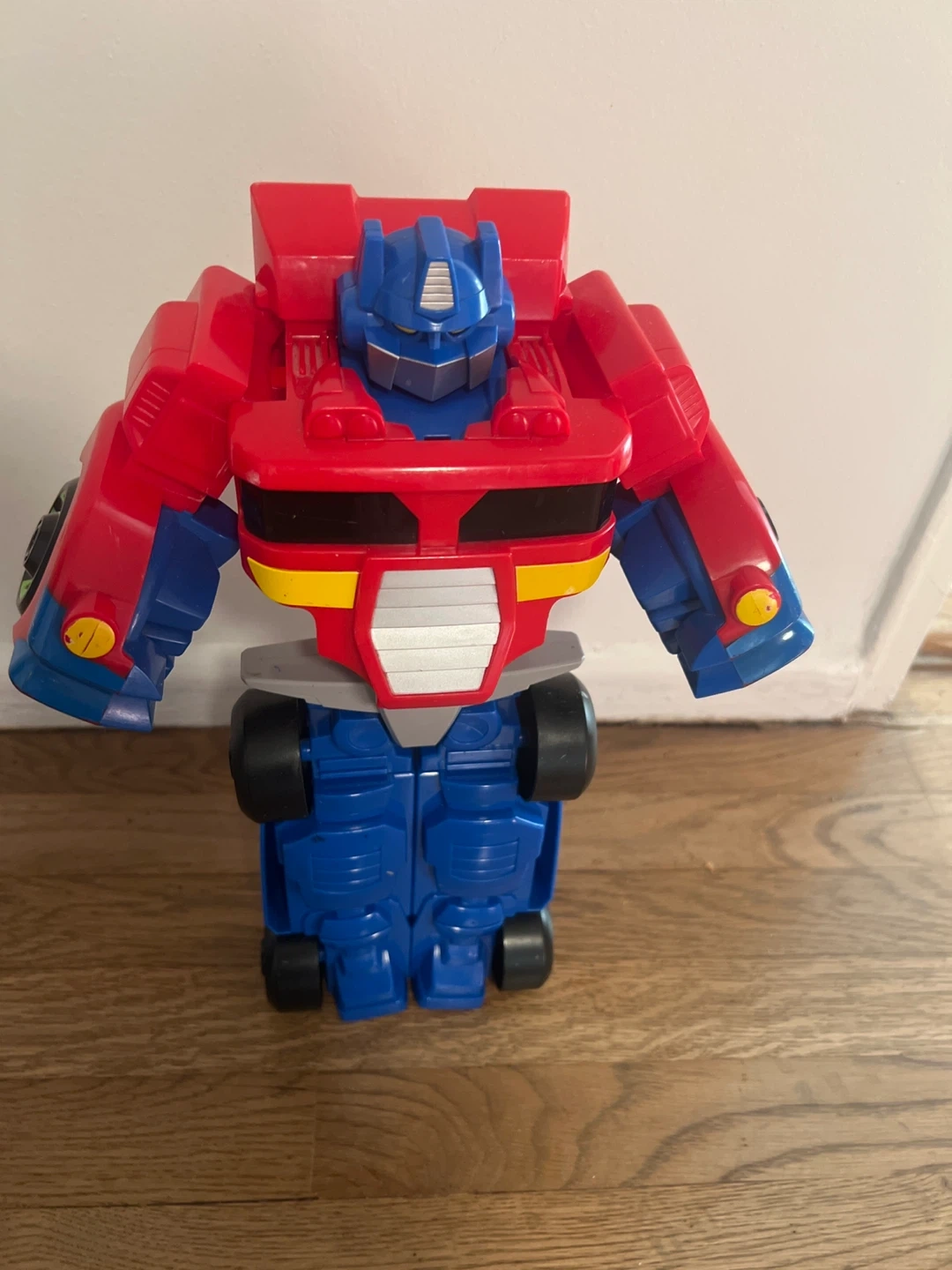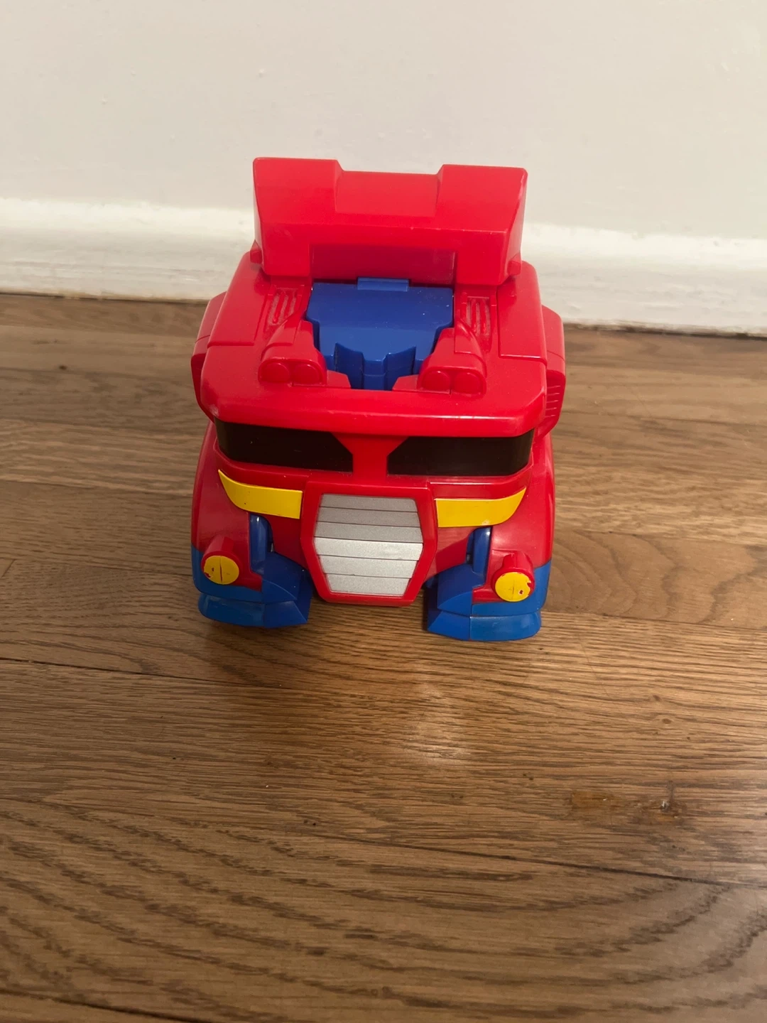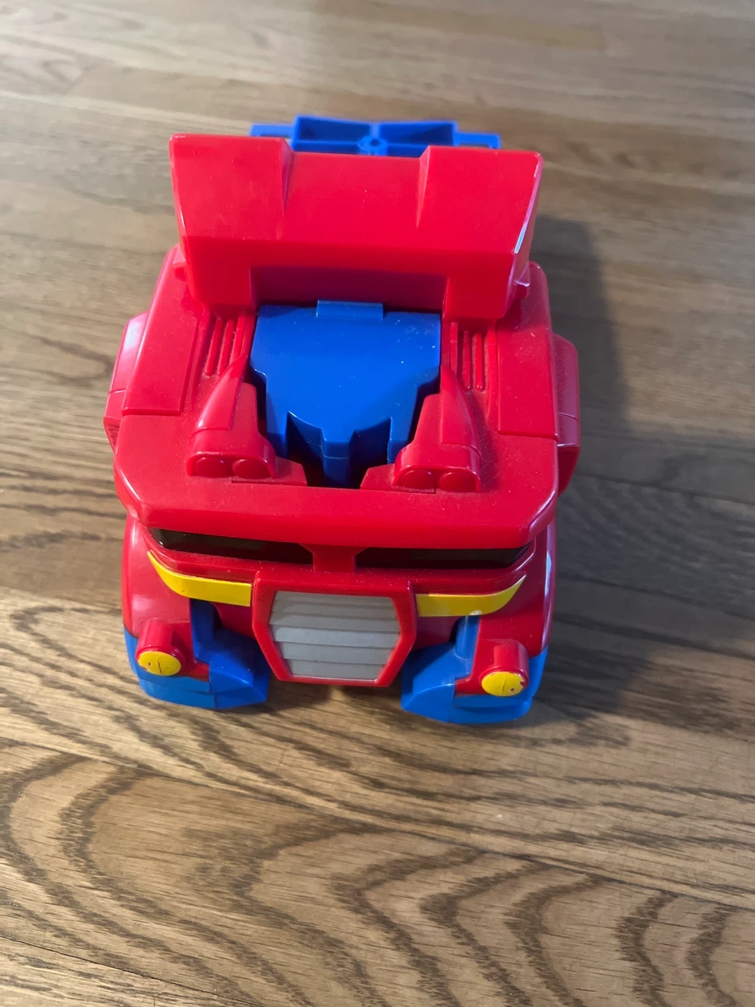 This is a red and blue transforming robot toy. It changes between a truck and a robot! Made of durable plastic. A fun toy for kids!