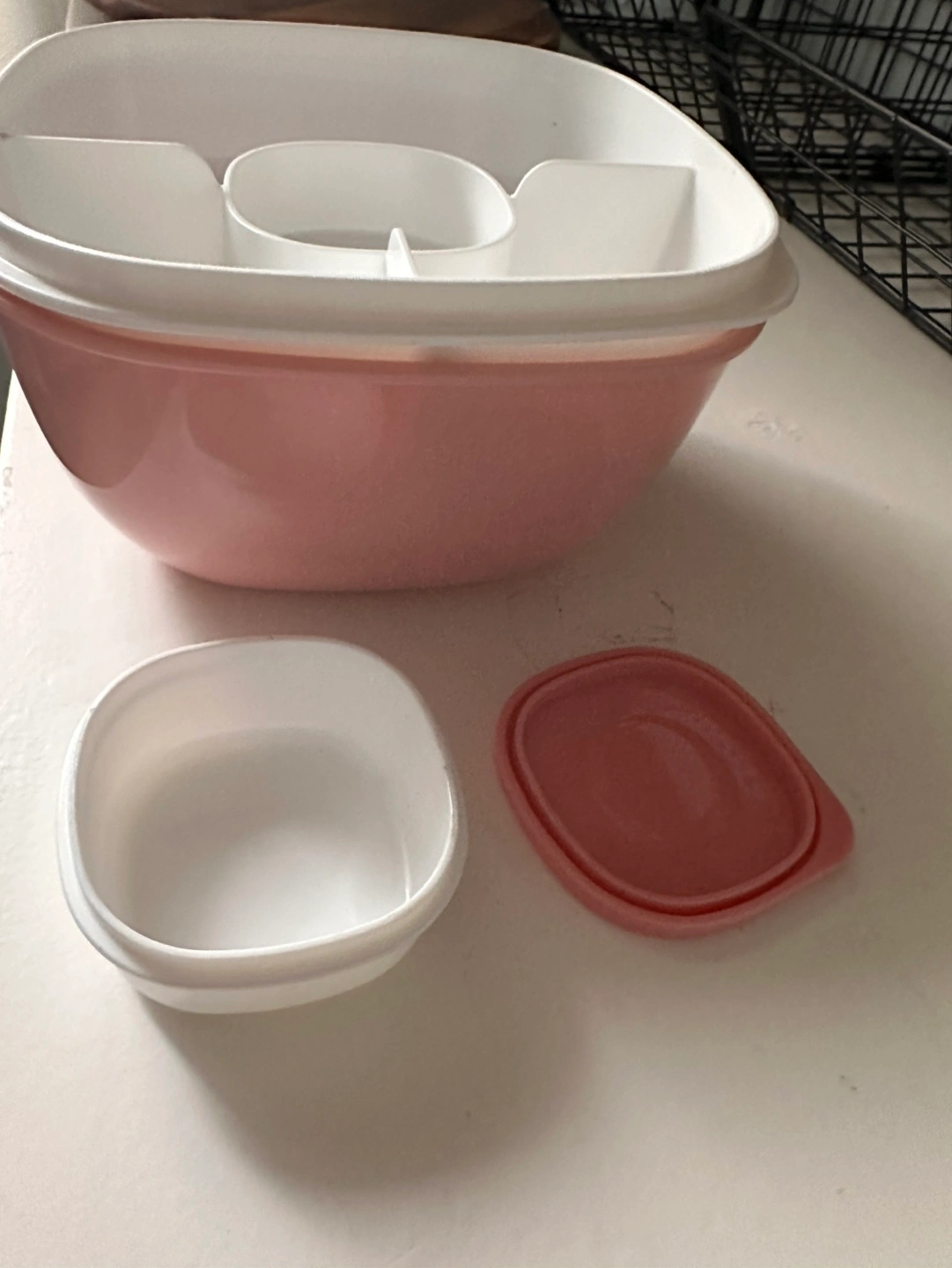Pink and white food container. Multiple compartments. Perfect for lunch or snacks. Includes separate small container and lids.