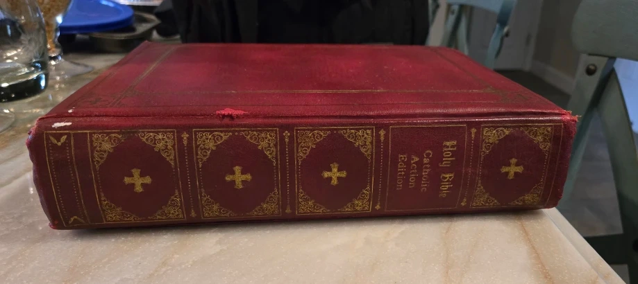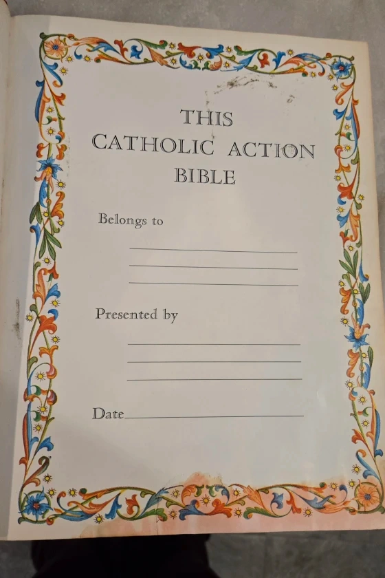Selling a Catholic Action Bible. It has a red cover with gold detailing. Please see photos for condition
