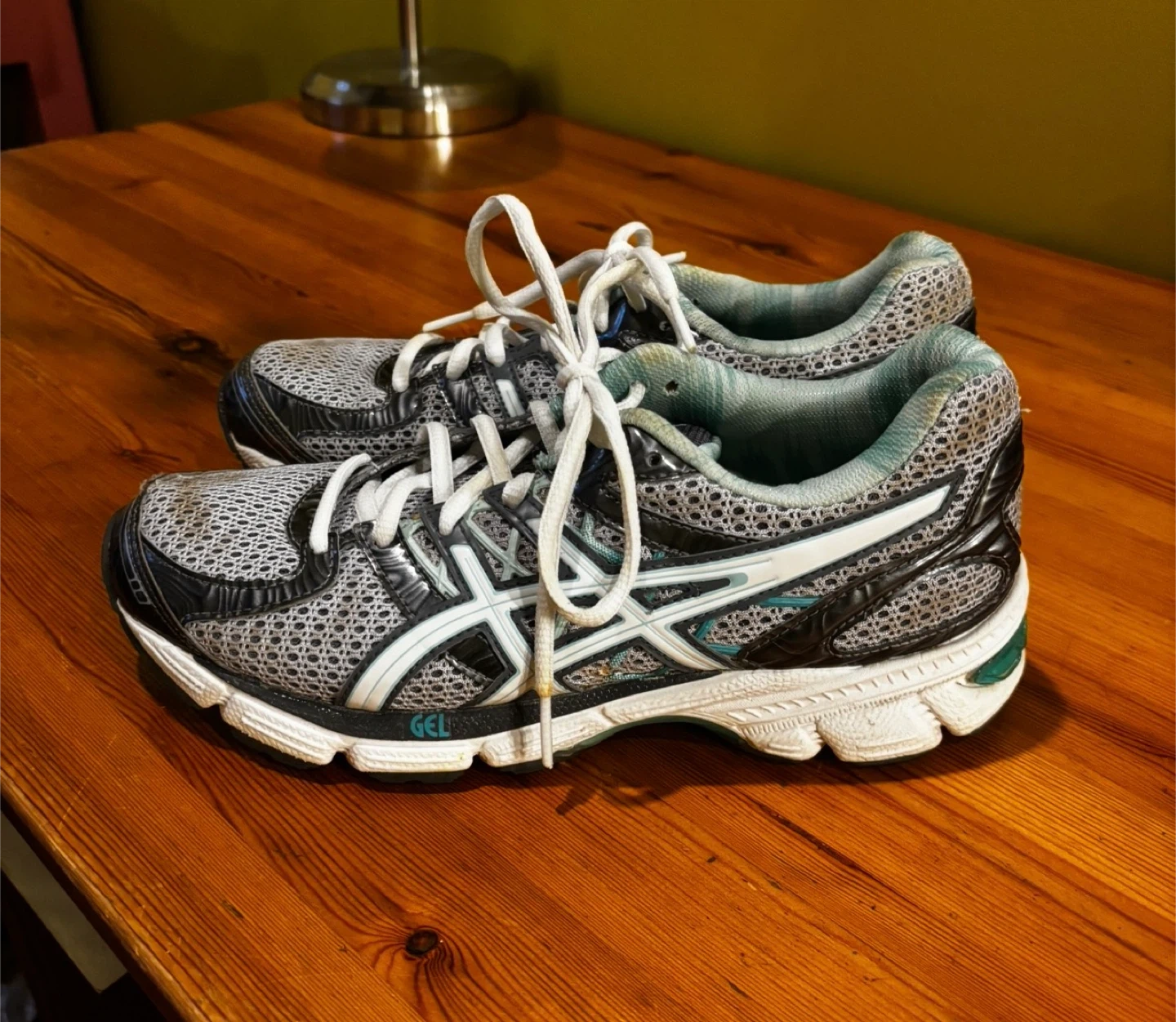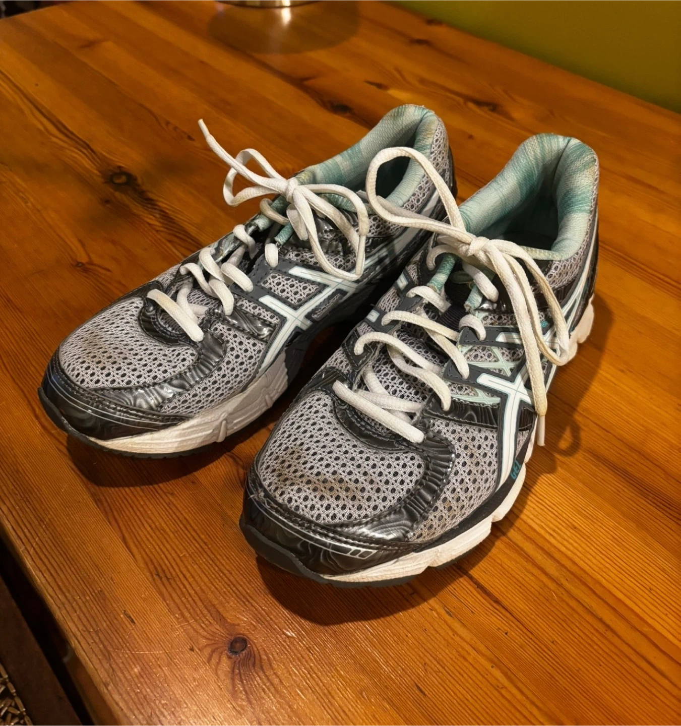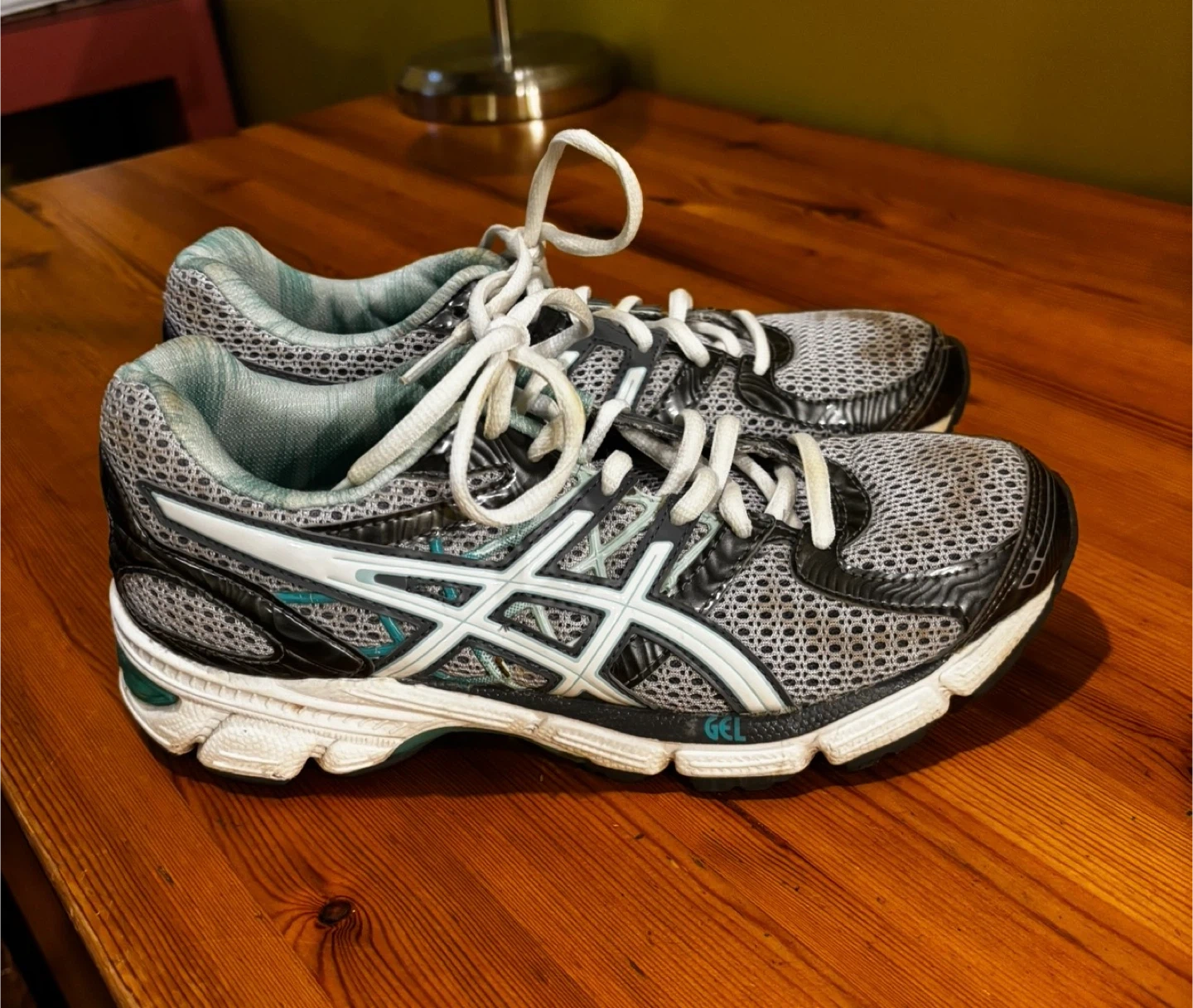 These ASICS GEL running shoes are designed for comfort and performance. They feature a breathable mesh upper and a supportive sole with GEL cushioning. White laces tie them securely.