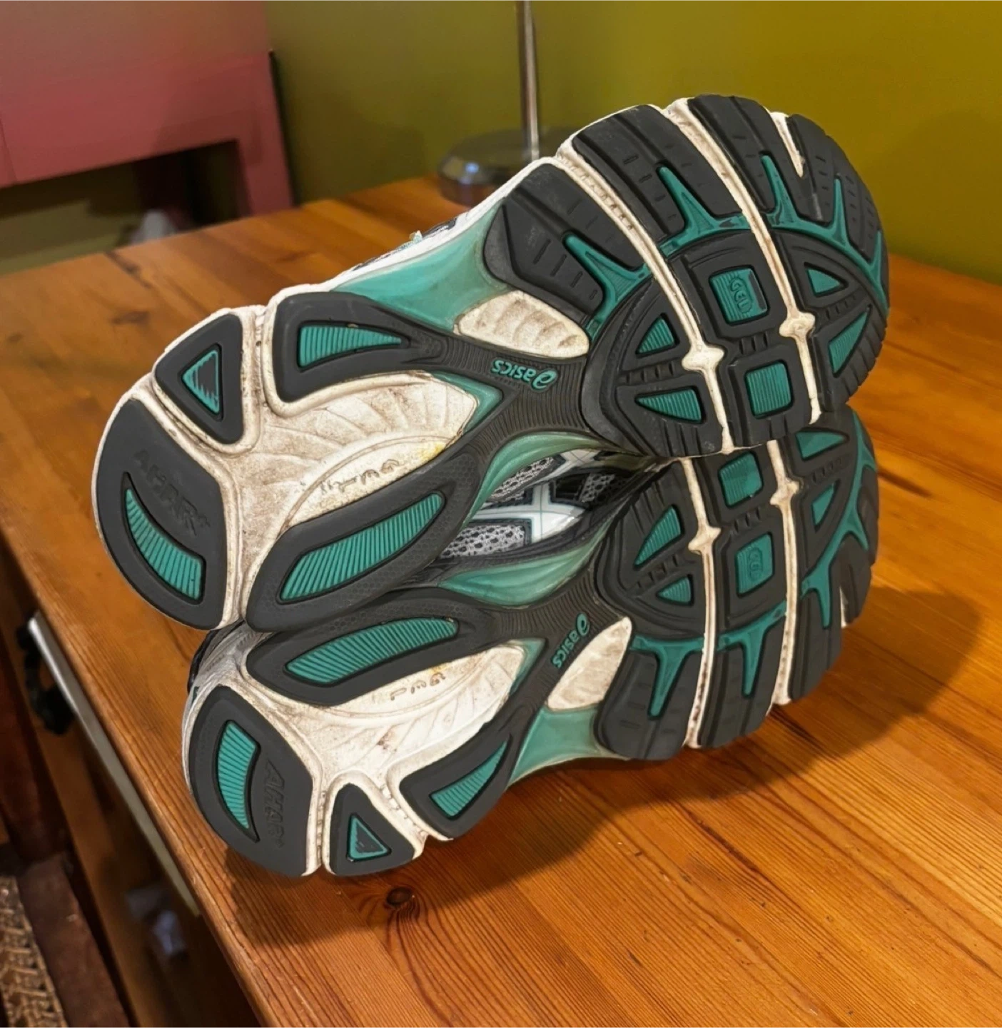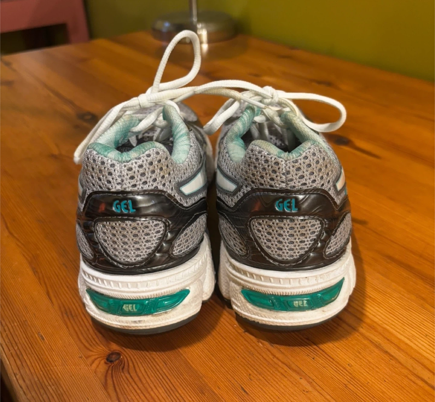 These ASICS GEL running shoes are designed for comfort and performance. They feature a breathable mesh upper and a supportive sole with GEL cushioning. White laces tie them securely.