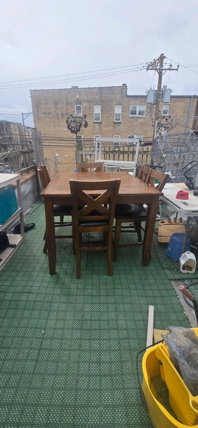 Solid wood dining table and four chairs. The table has a rich wood finish and the chairs have comfortable upholstered seats. It's perfect for smaller dining areas or as a breakfast nook set. Table dimensions are approximately 48" x 30".