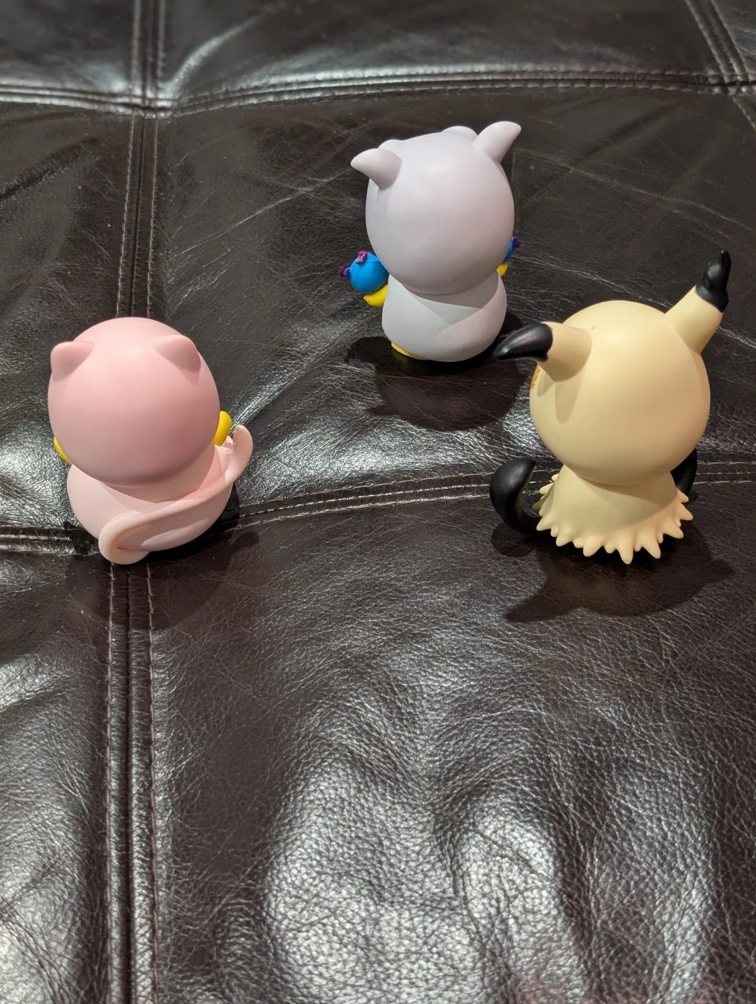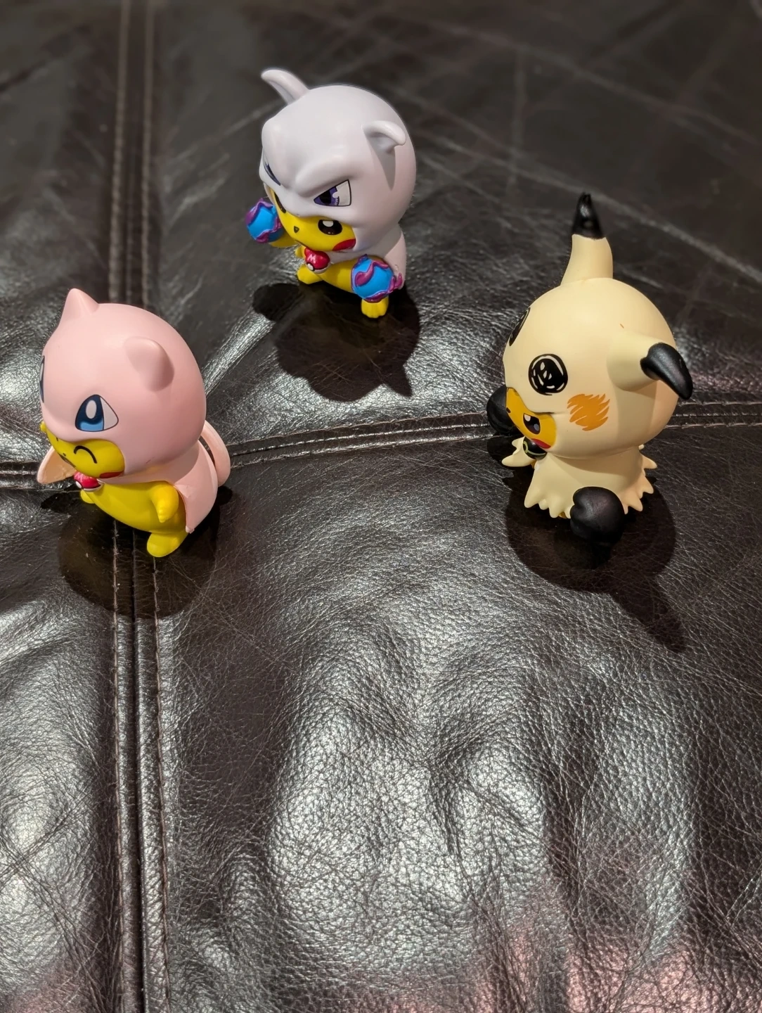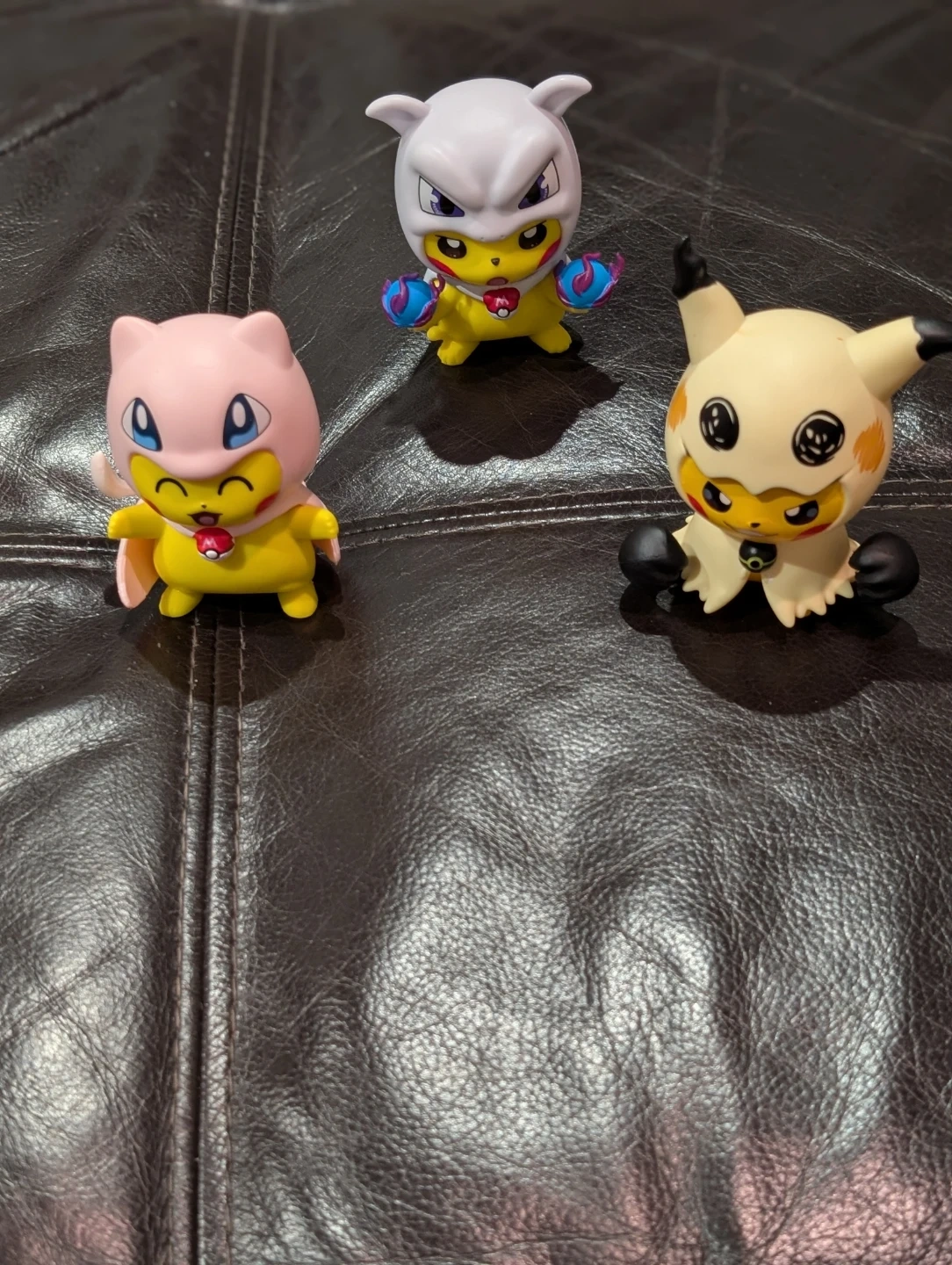 This set of tree Pokemon figures 3" inch Picachu poncho Mew, Mimikyu, and Cubone. They're made of plastic and have bright, detailed designs. These figures are great for any Pokemon fan's collection!