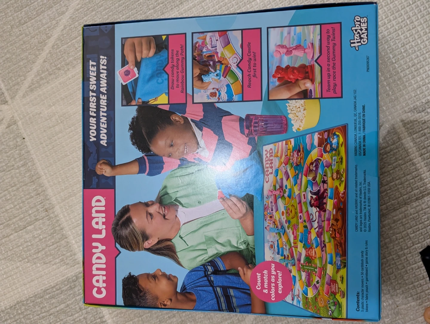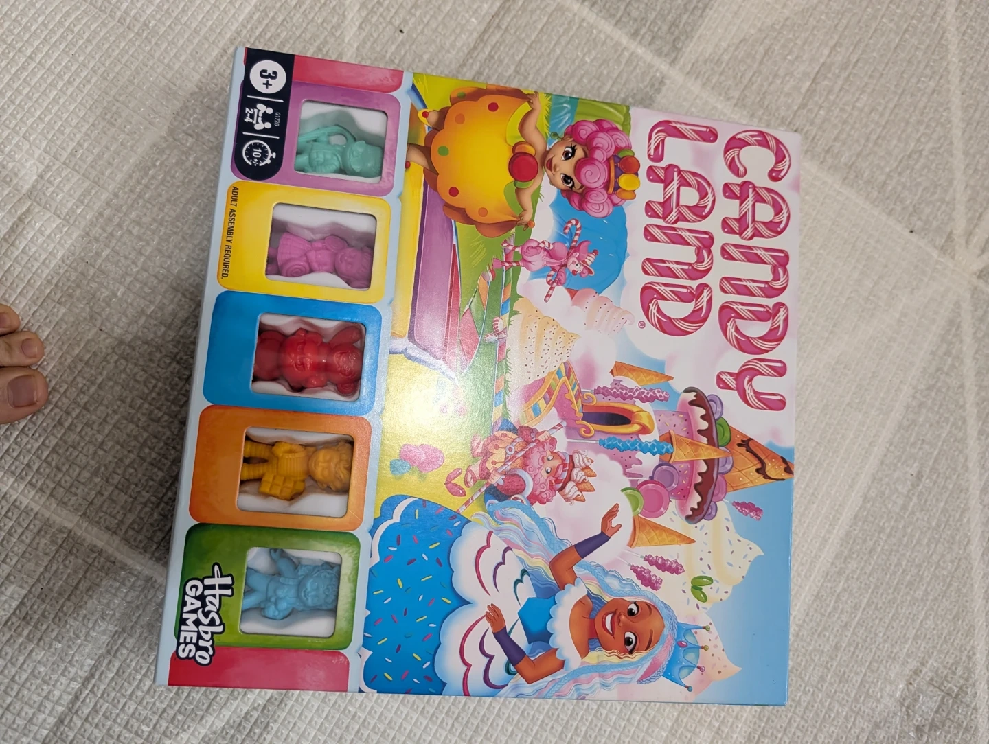 This is the classic Candy Land board game by Hasbro. It includes 5 plastic pawns and a deck of cards. Recommended for ages 3 and up.
