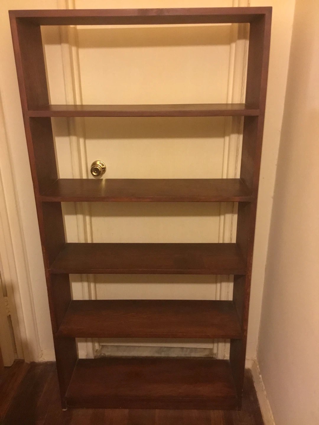 1 / 11 / 1Buy & SellWooden Bookcase - 5 ShelvesWooden Bookcase - 5 ShelvesFreeThis is a wooden bookcase with five shelves. It's a dark brown color and made of wood. It's ready for your books or decor!ConditionGoodDimensions30 in W x 9 in D x 60 in HWHERE TO MEETGreenwich StView MapSELLERverifiedDavidGreenwich Village1000+87 reviews5 chats·5 favorites·95 viewsSEND CHAT TO SELLERHi David! I’m interested in your listing.Hi David! I’m interested in your listing.Get the Karrot app to chatSign In to chat