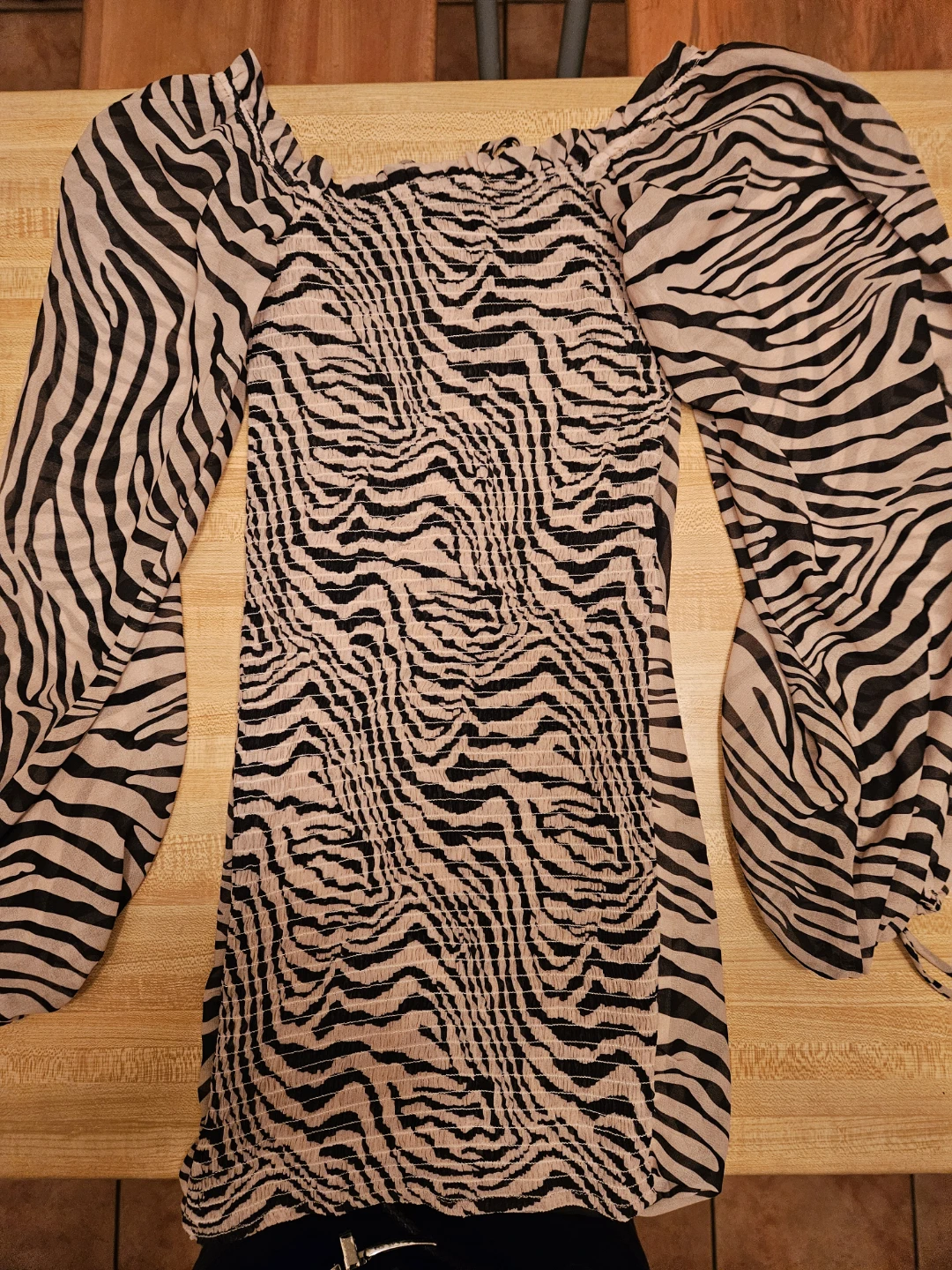 Cute Commense dress with a zebra print. It has long sleeves and a drawstring neckline. Perfect for a night out!
