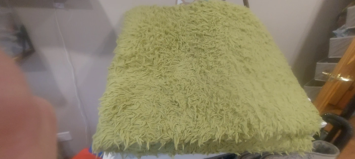Soft, fuzzy throw blanket in a light green color. It's made from a plush, shaggy material. Great for adding warmth and texture to your couch or bed!