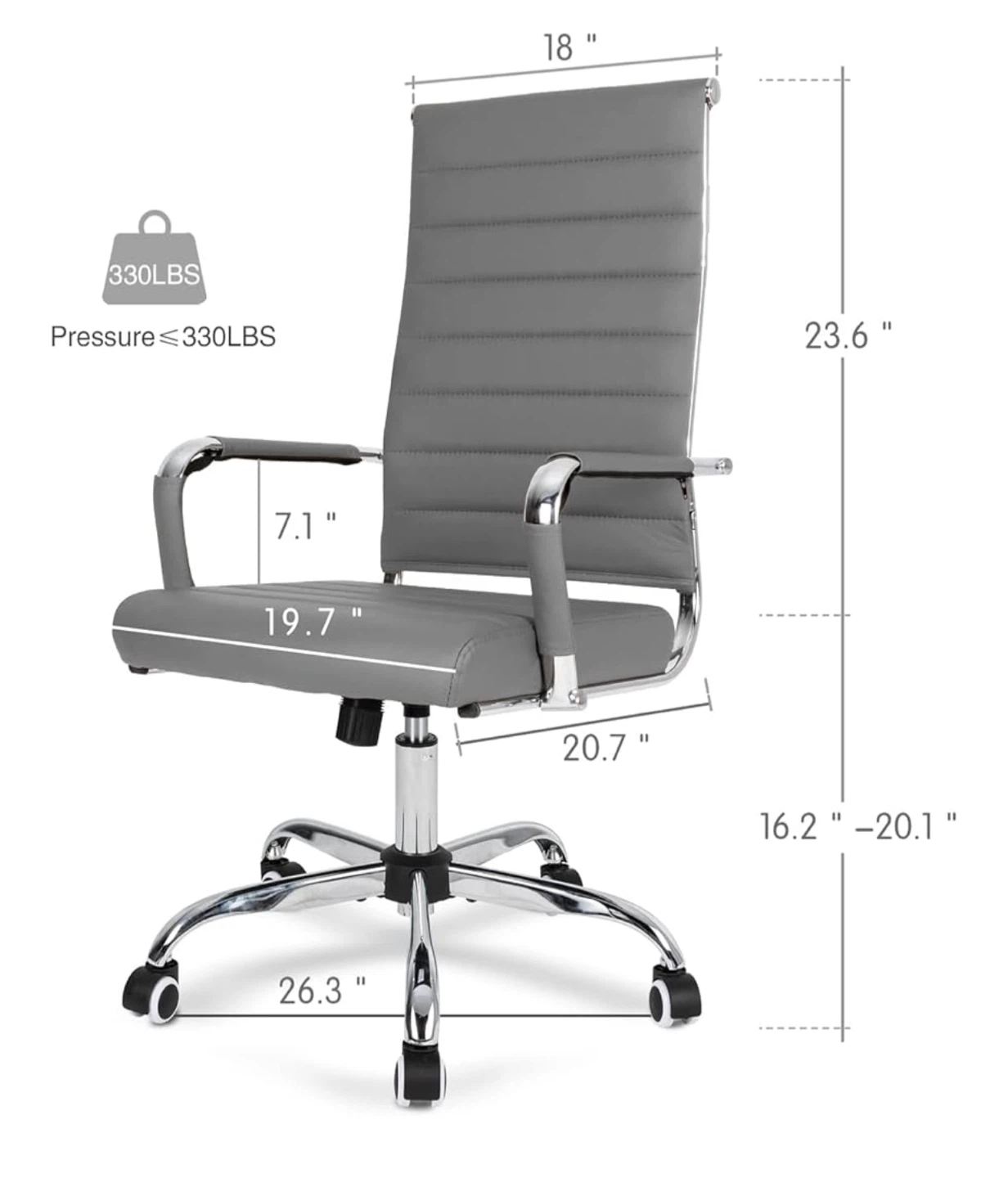 Selling a comfortable gray office chair! It features adjustable height and a practical coat hanger bar in the back for hanging clothes or bags. The chair has a weight capacity of up to 330lbs. It also has rocking tension control and a tilt range of 90-105 degrees
