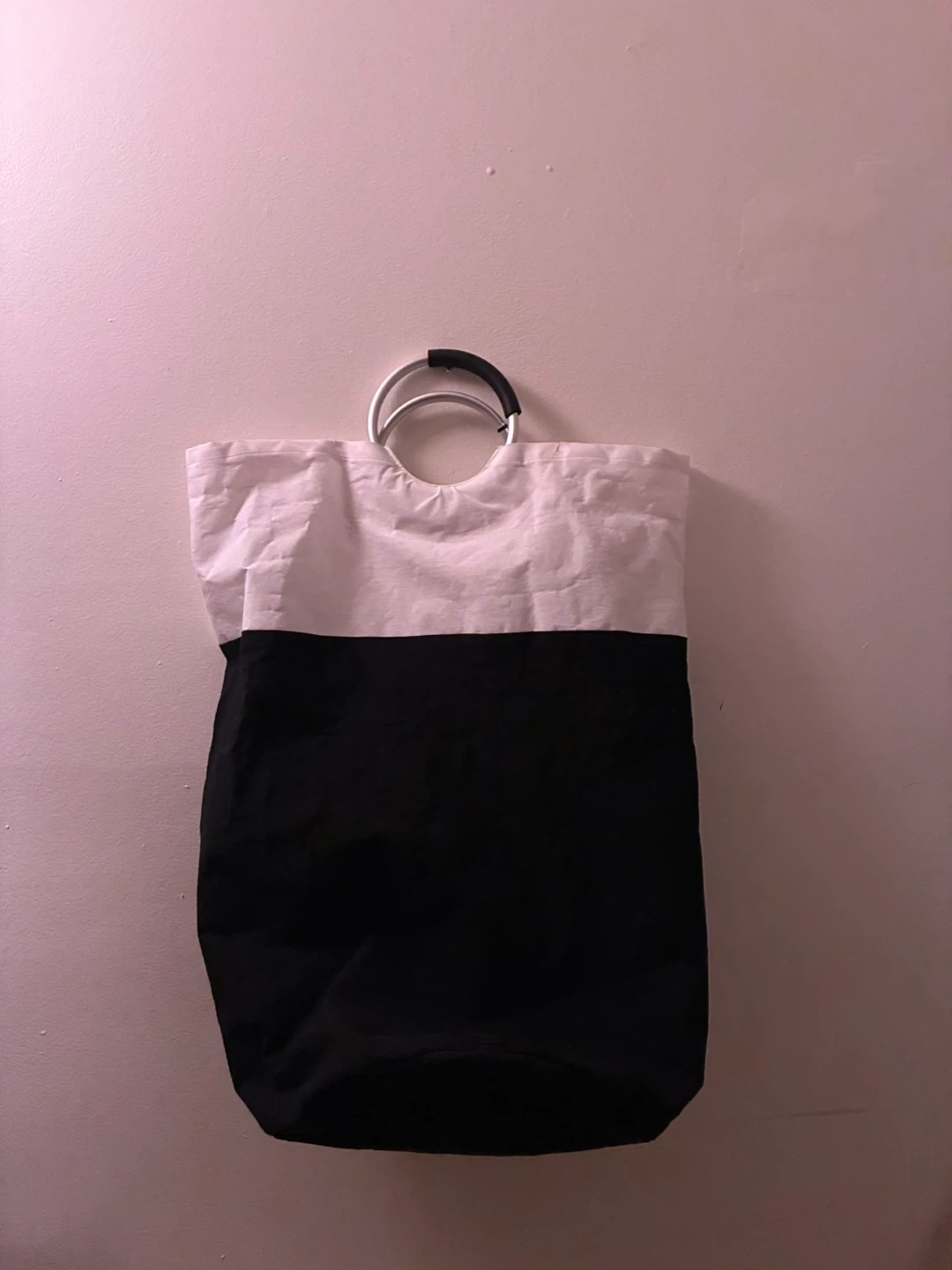 This laundry bag features a two-tone design with a white top and a black bottom. It has durable metal handles with black grips for easy carrying. It's made of canvas material.