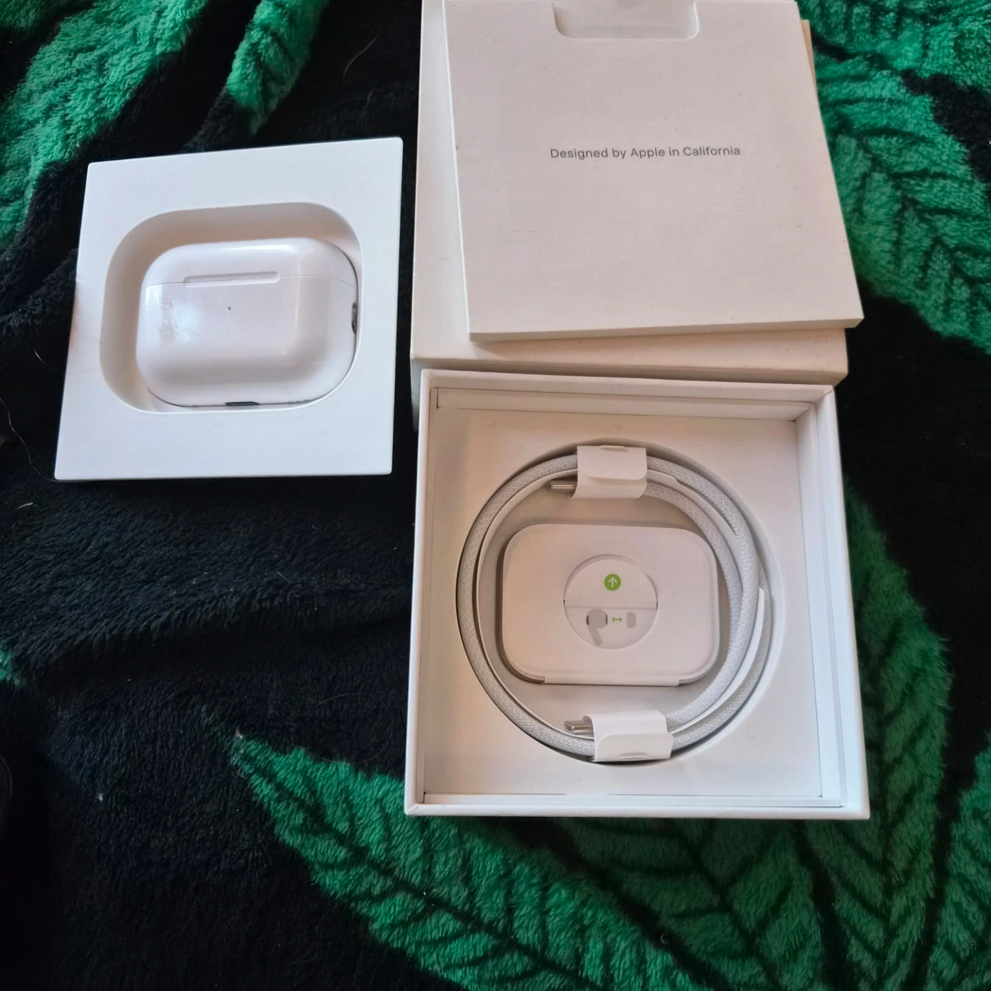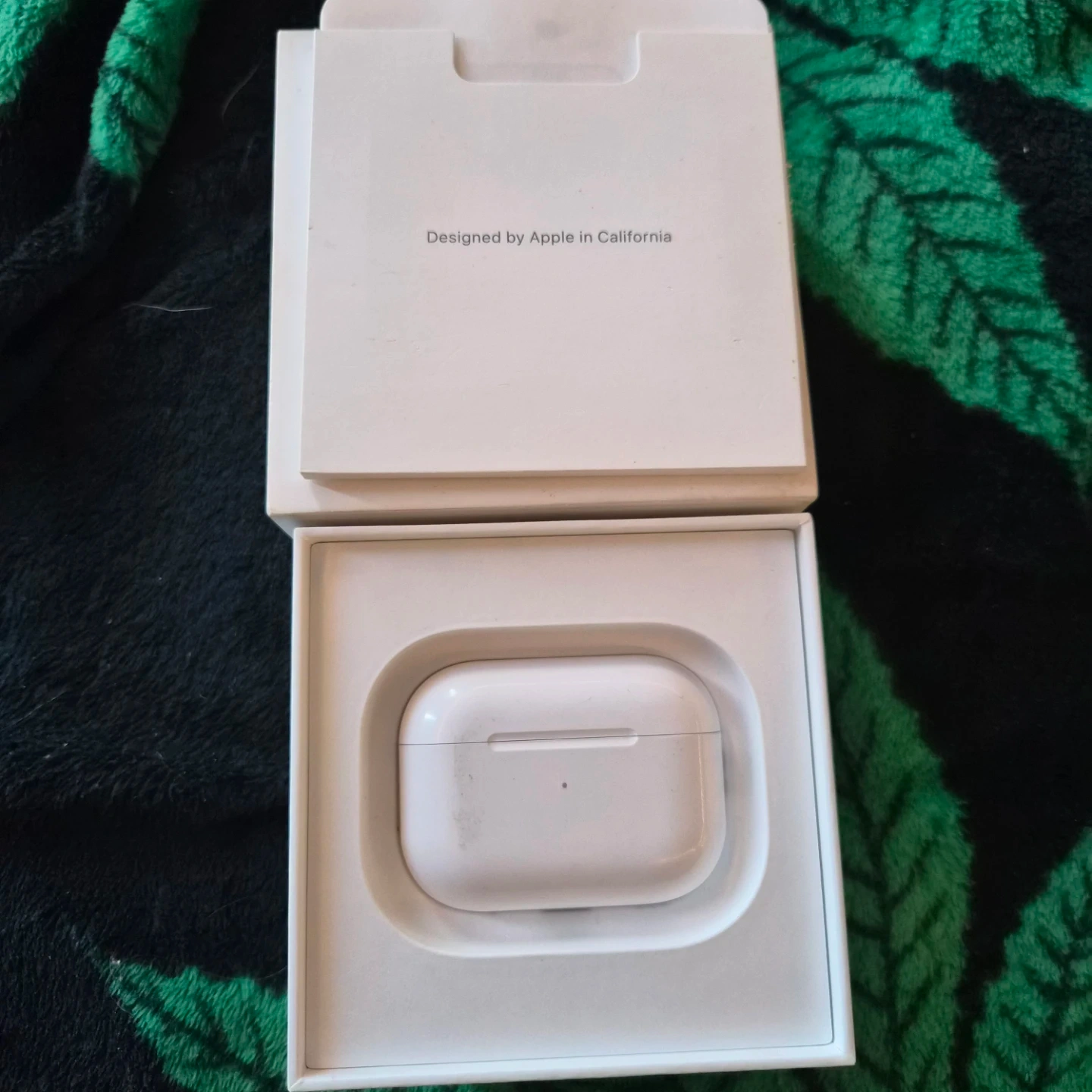 Apple AirPods Pro (2nd generation) with charging case. Includes USB-C charging cable and MagSafe compatible charging case. Designed by Apple in California.