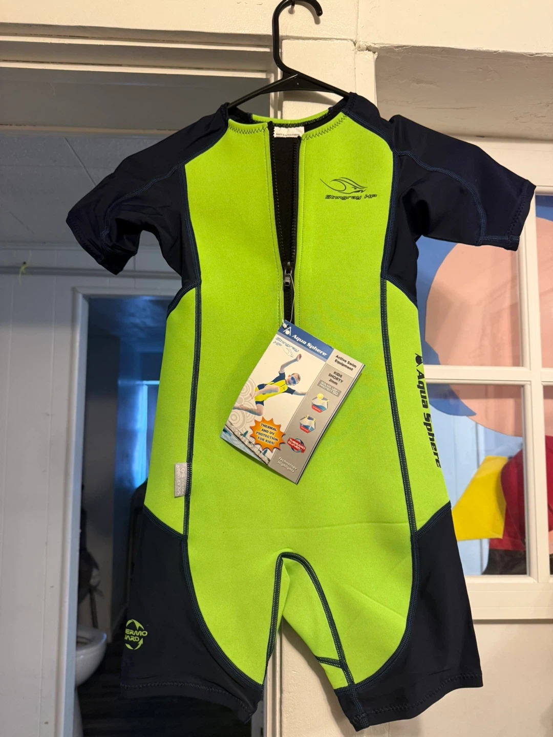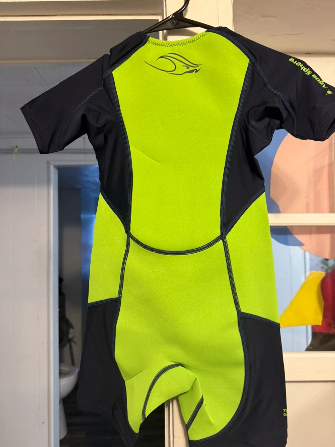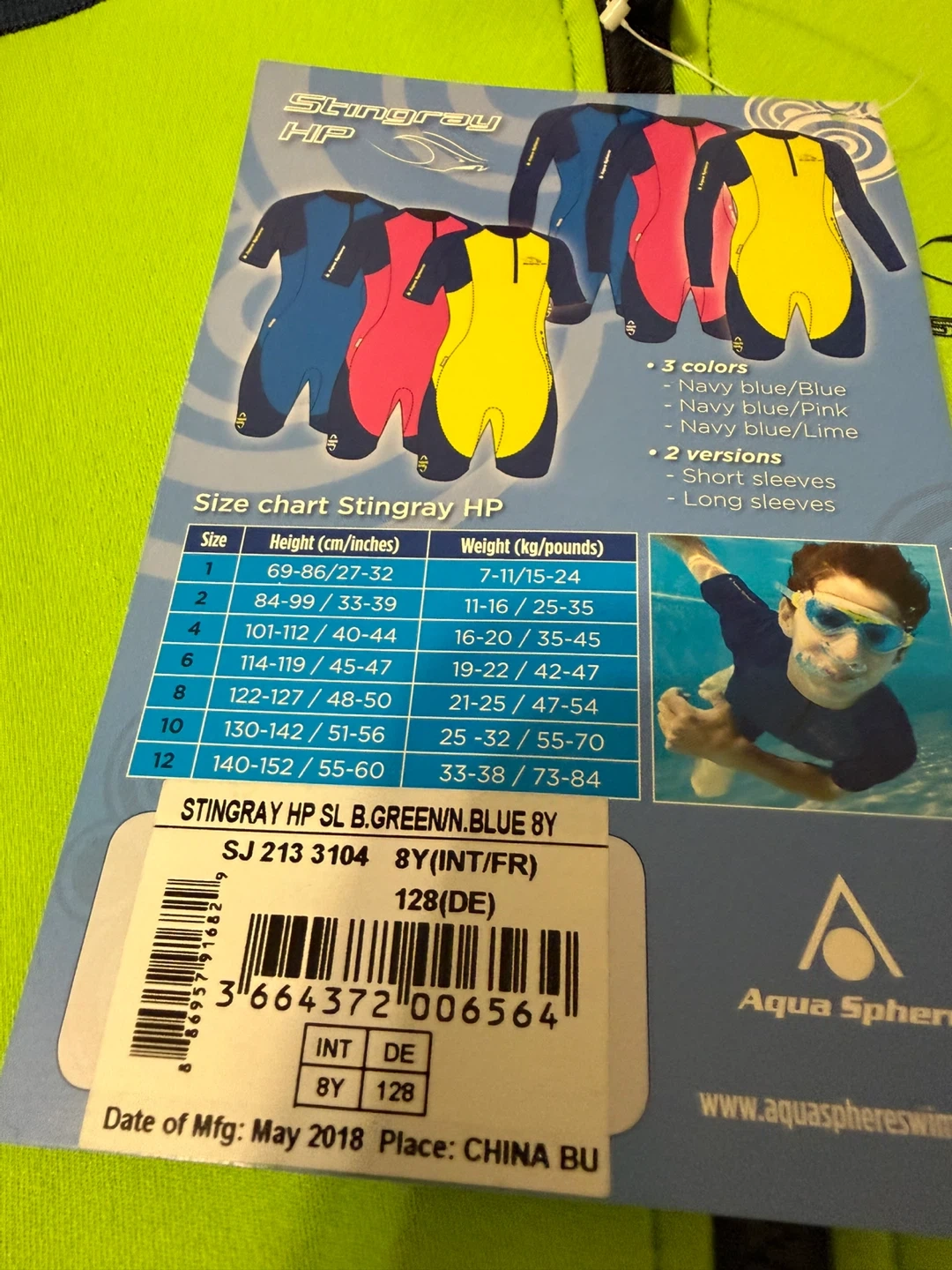 This is an Aqua Sphere Stingray HP wetsuit in lime green and navy blue. It's a short sleeve, short leg style. This wetsuit was manufactured in May 2018. It provides UV protection and is designed for water sports. It's a size 8Y.