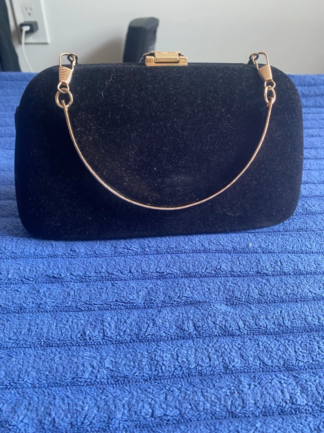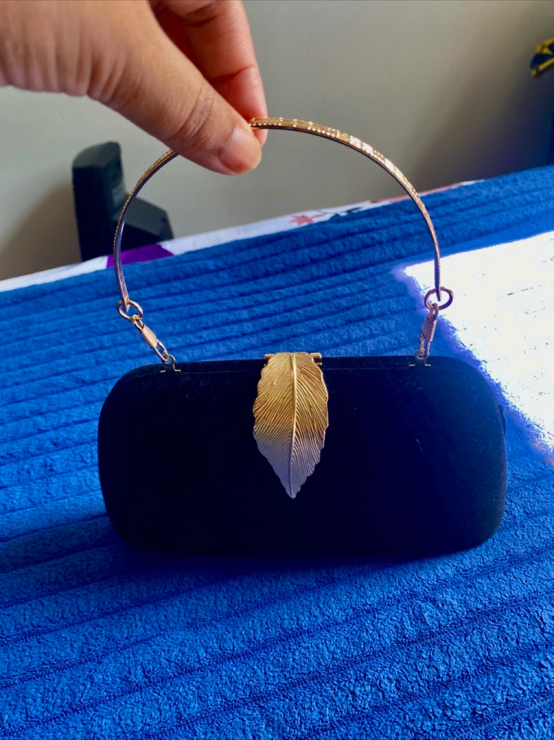 Black valvet clutch handbag, with a gold-colored leaf accent. Features a handle that can be tucked inside. Ideal for keeping your essentials safe while enjoying a serene evening.