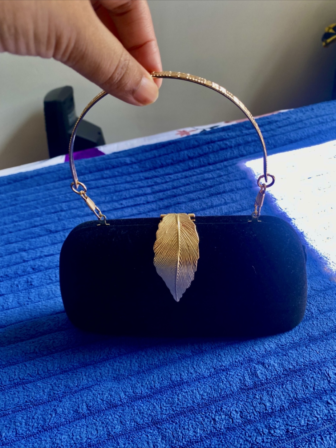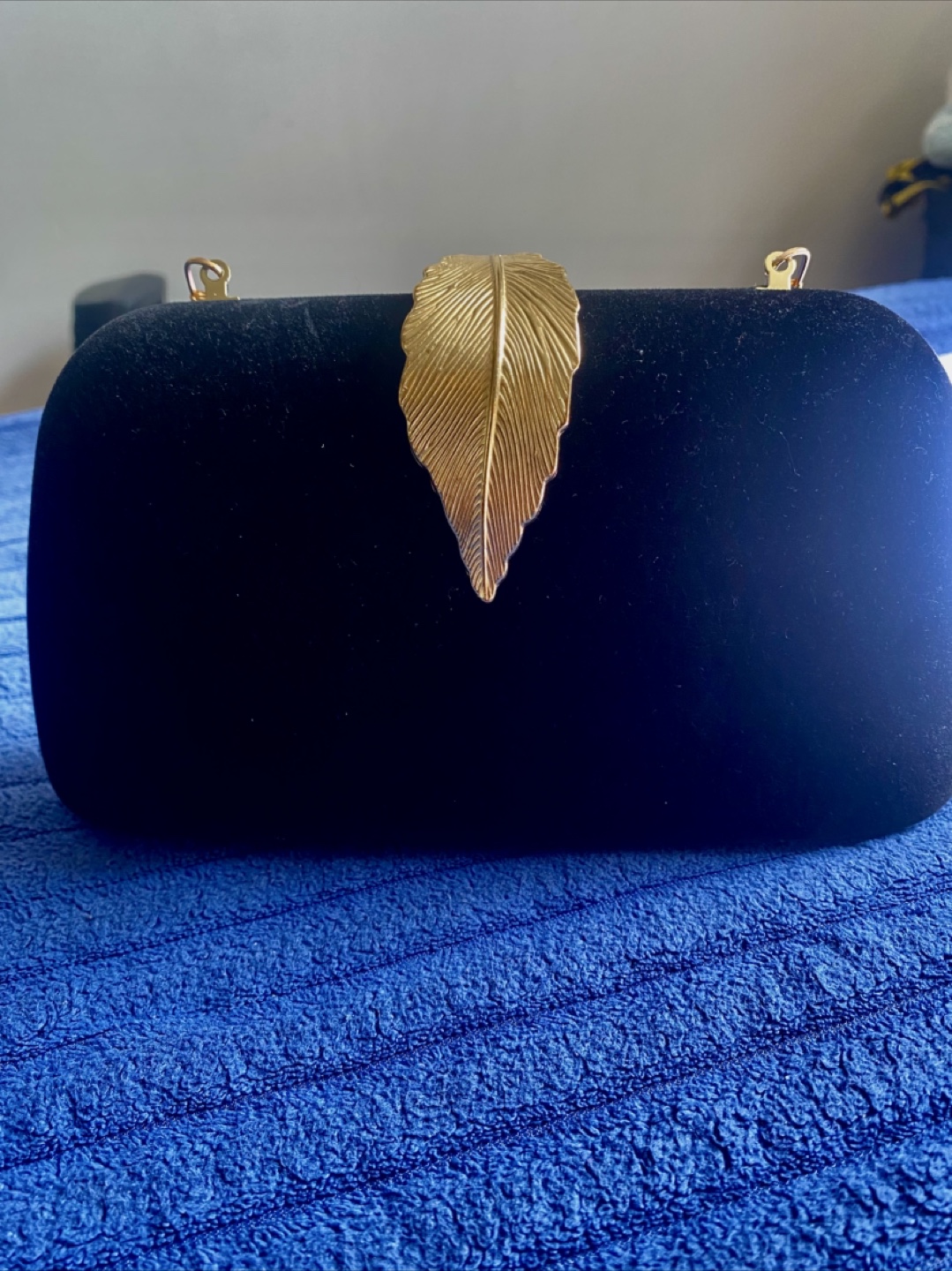 Black valvet clutch handbag, with a gold-colored leaf accent. Features a handle that can be tucked inside. Ideal for keeping your essentials safe while enjoying a serene evening.