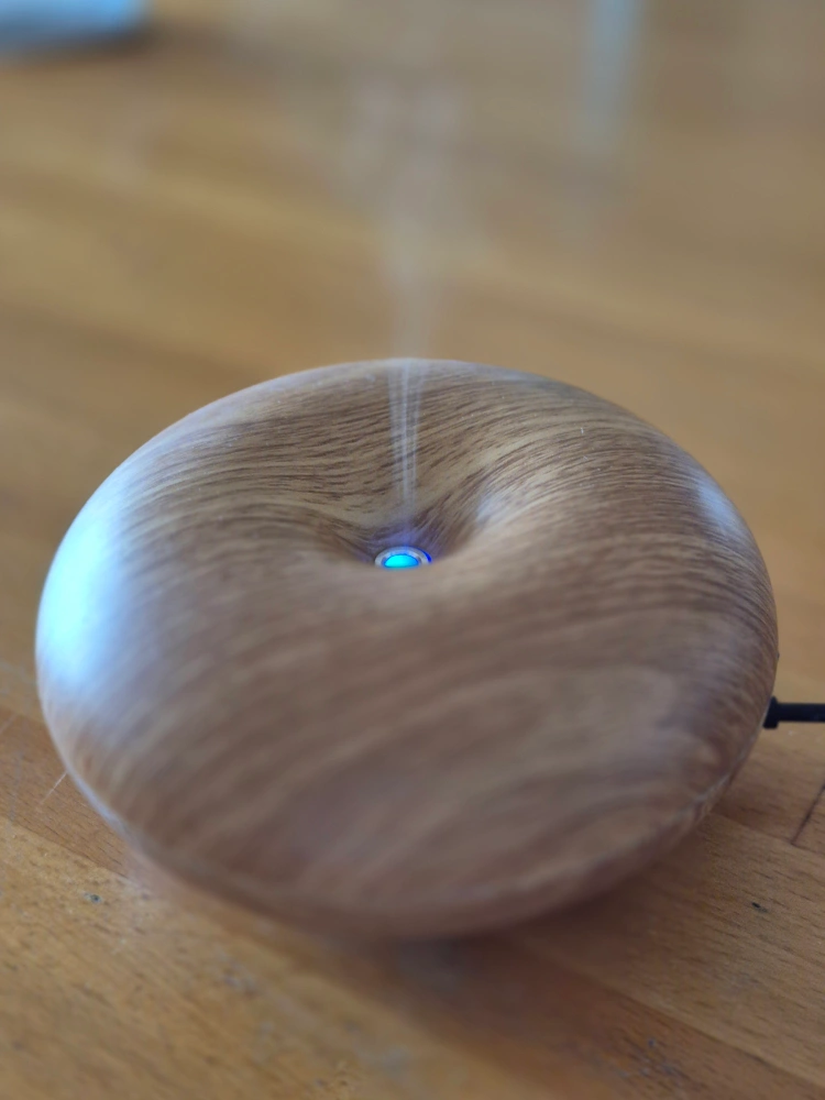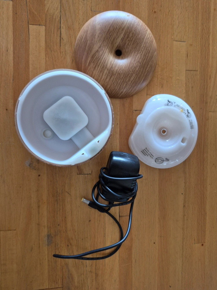 Aromatherapy diffuser. Includes the base, outer cover, water reservoir and power cord. It's the perfect way to add a relaxing scent to your home.