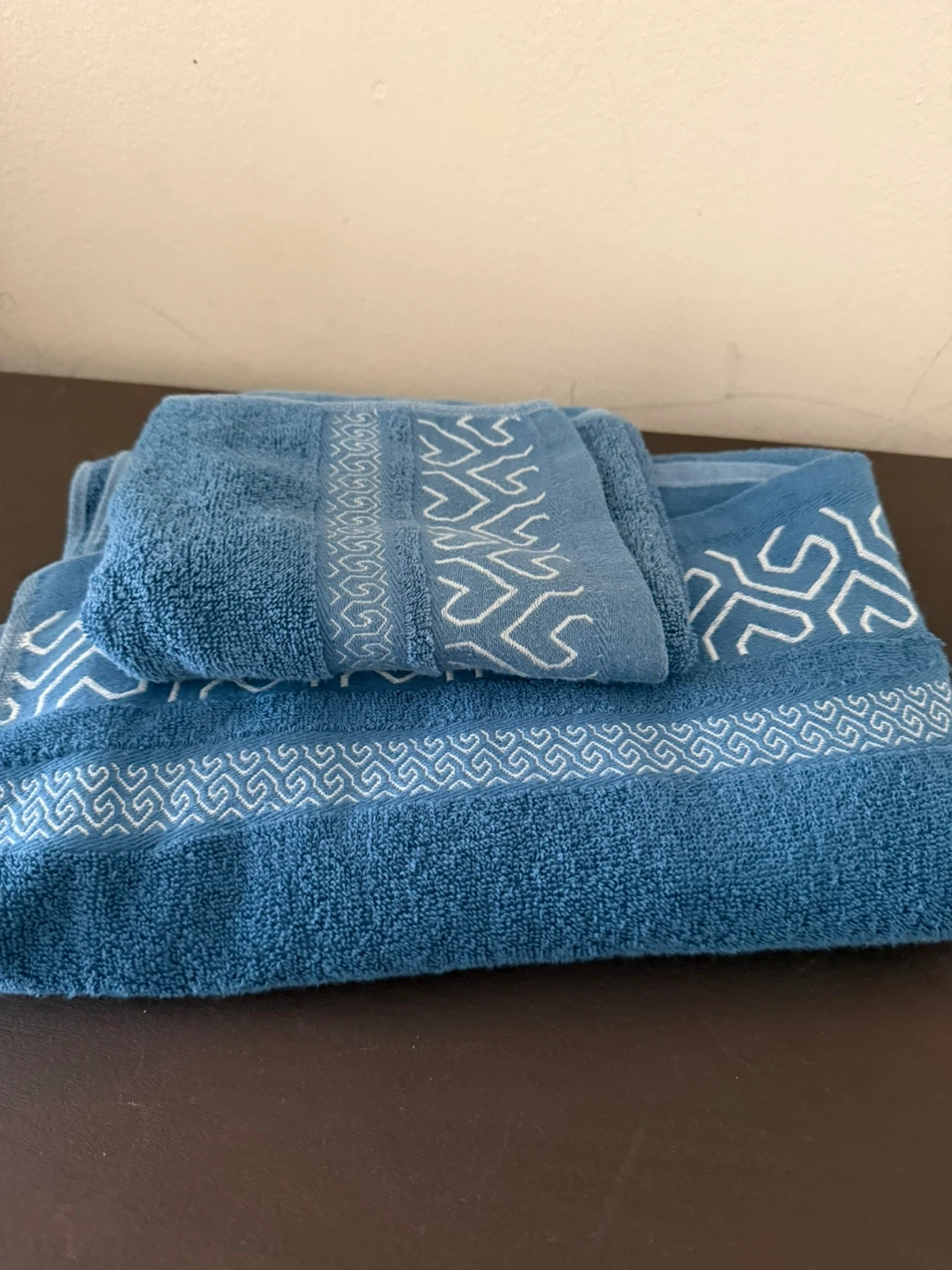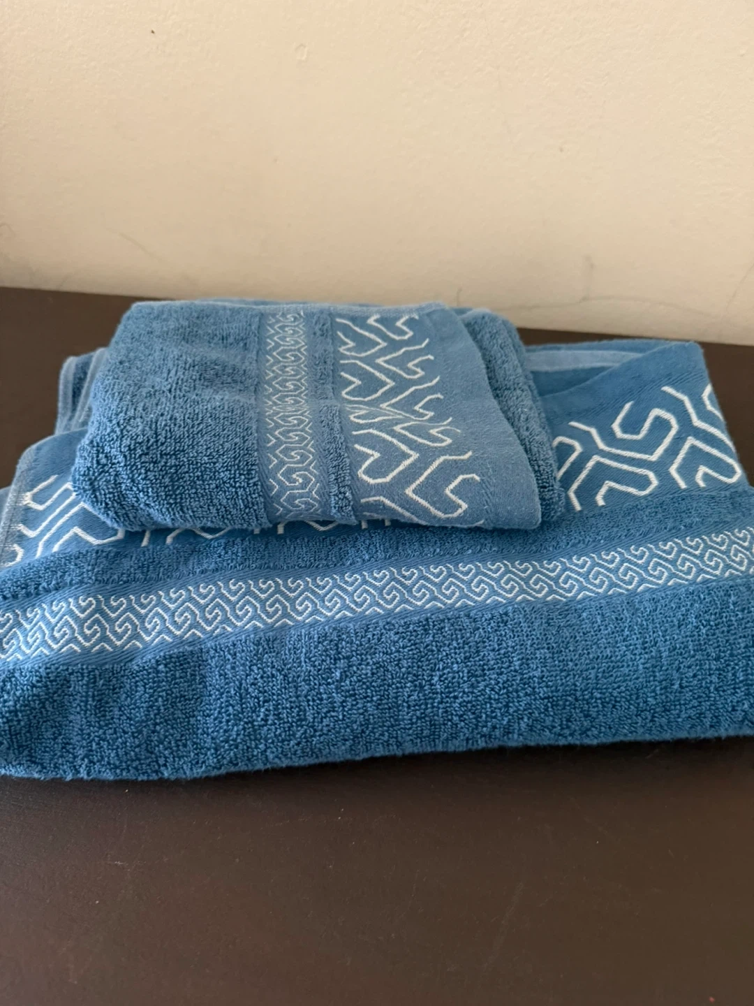 Set of blue bath towels featuring a white geometric pattern. Soft and absorbent material. Dimensions not specified.