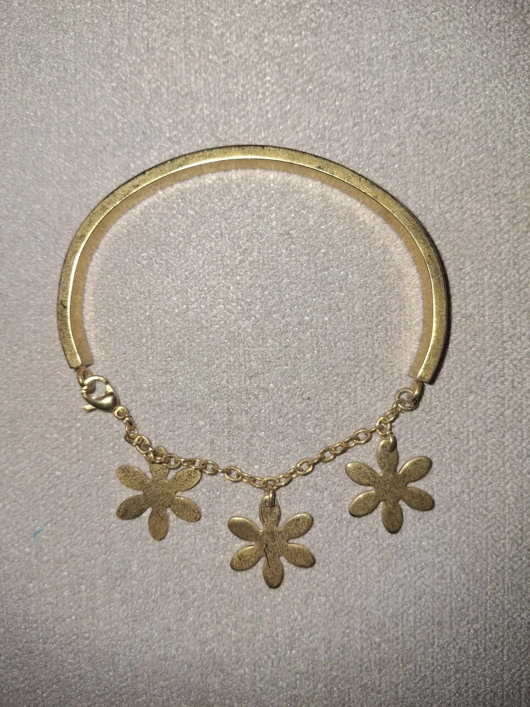 This is a cute gold bangle bracelet. It has three flower charms hanging from it. It's in good condition and ready to wear! Stainless steel