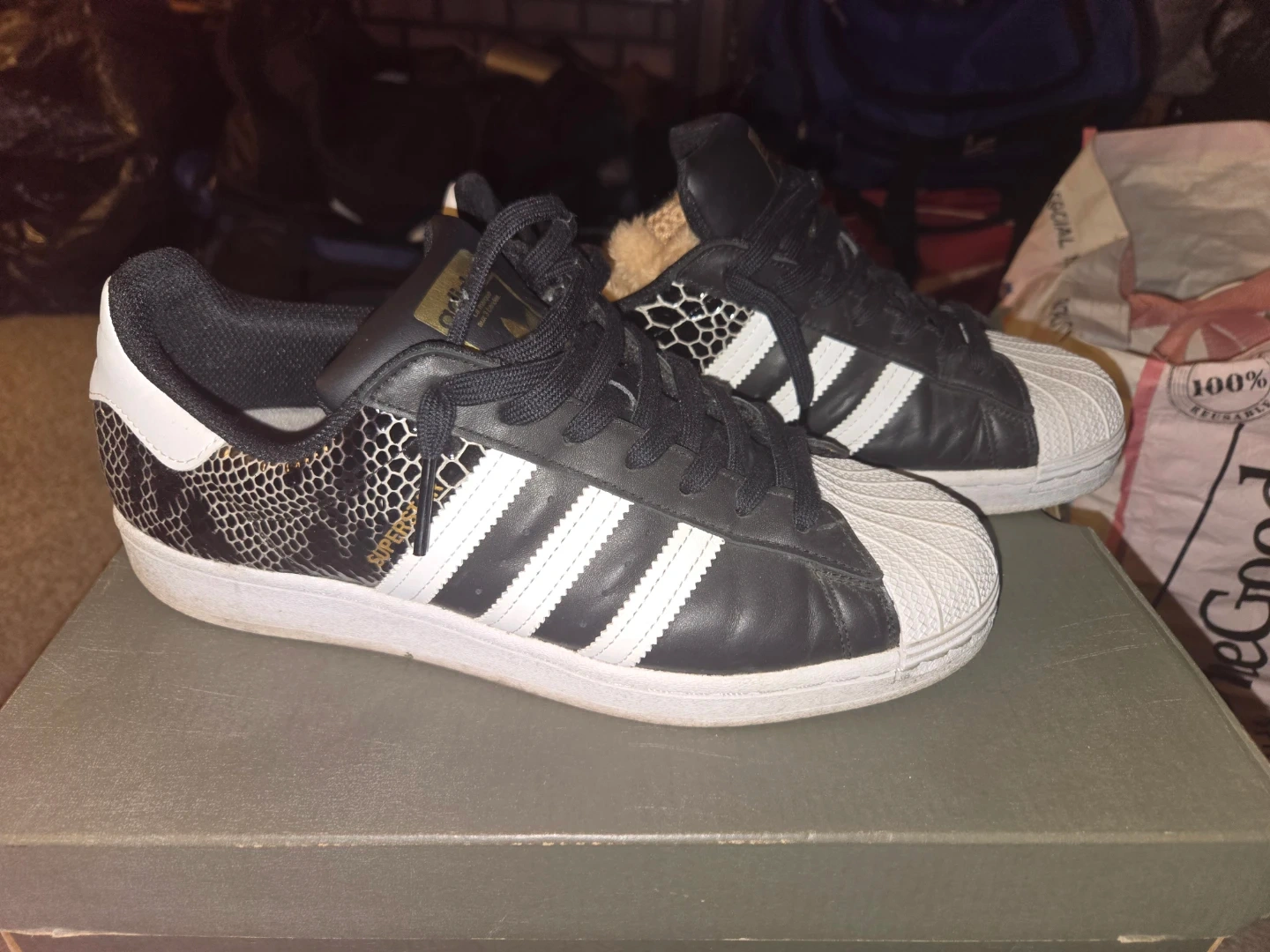 Classic Adidas Superstar sneakers. Black leather with white stripes and shell toe. Features a snakeskin-patterned accent on the heel.