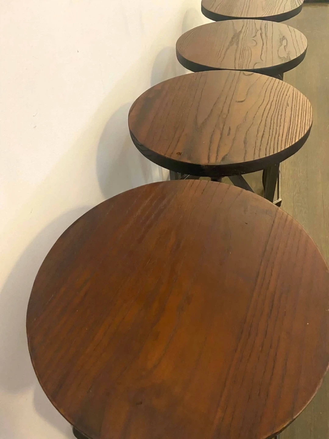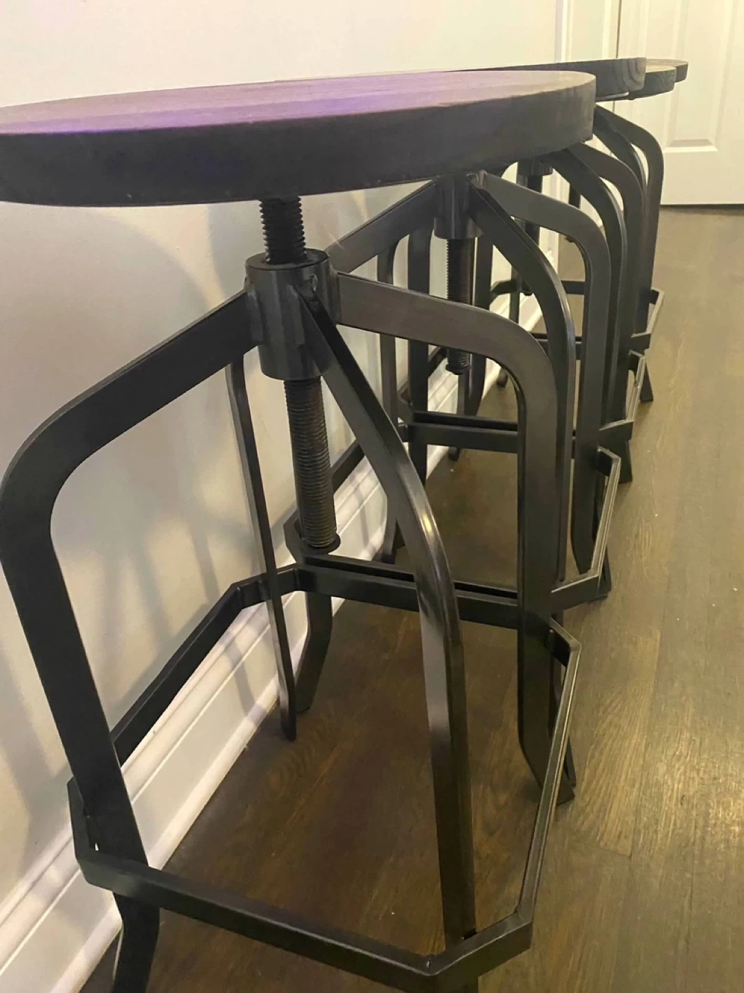 Selling a set of four industrial-style bar stools. They feature a dark wood seat and a black metal base. The height is adjustable (26-33in), making them versatile for different counter heights. They are in good condition and would add a cool, industrial touch to any kitchen or bar area