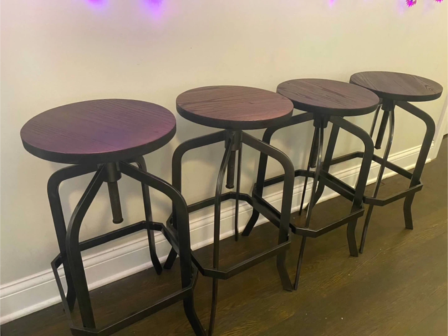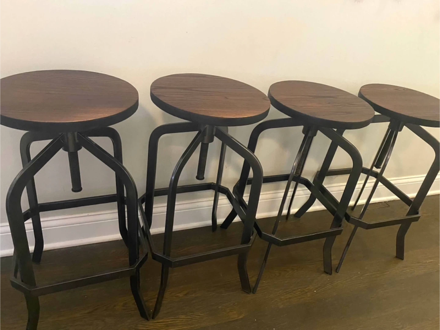 Selling a set of four industrial-style bar stools. They feature a dark wood seat and a black metal base. The height is adjustable (26-33in), making them versatile for different counter heights. They are in good condition and would add a cool, industrial touch to any kitchen or bar area