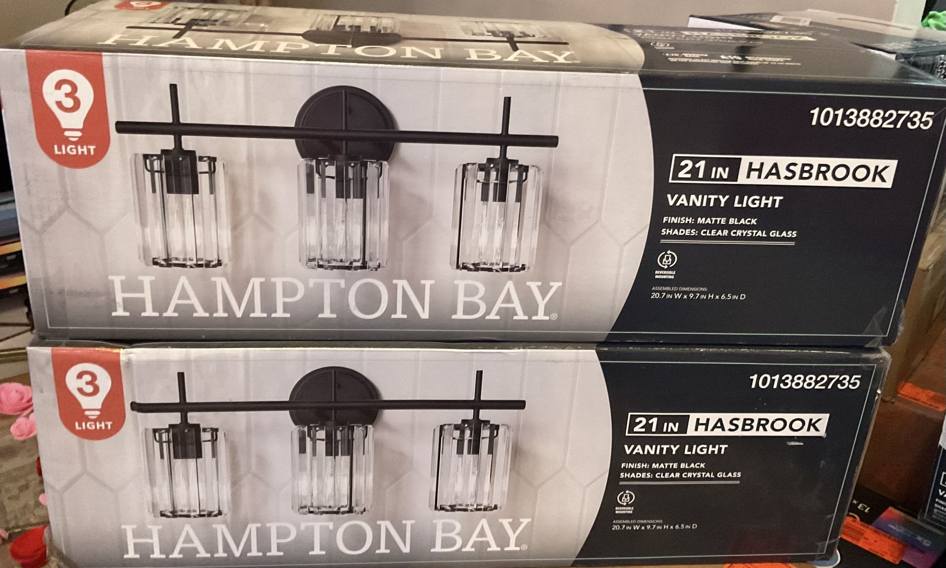 Brand new Hampton Bay 21 inch 3-light vanity light with clear crystal glass. Have 5 available.
