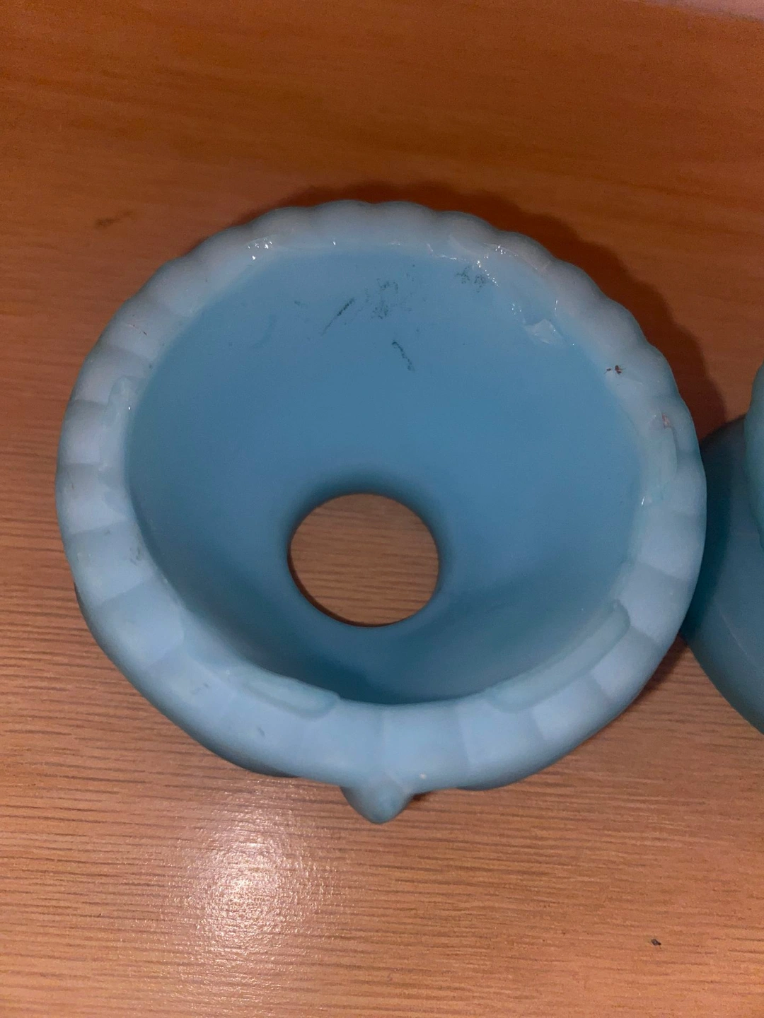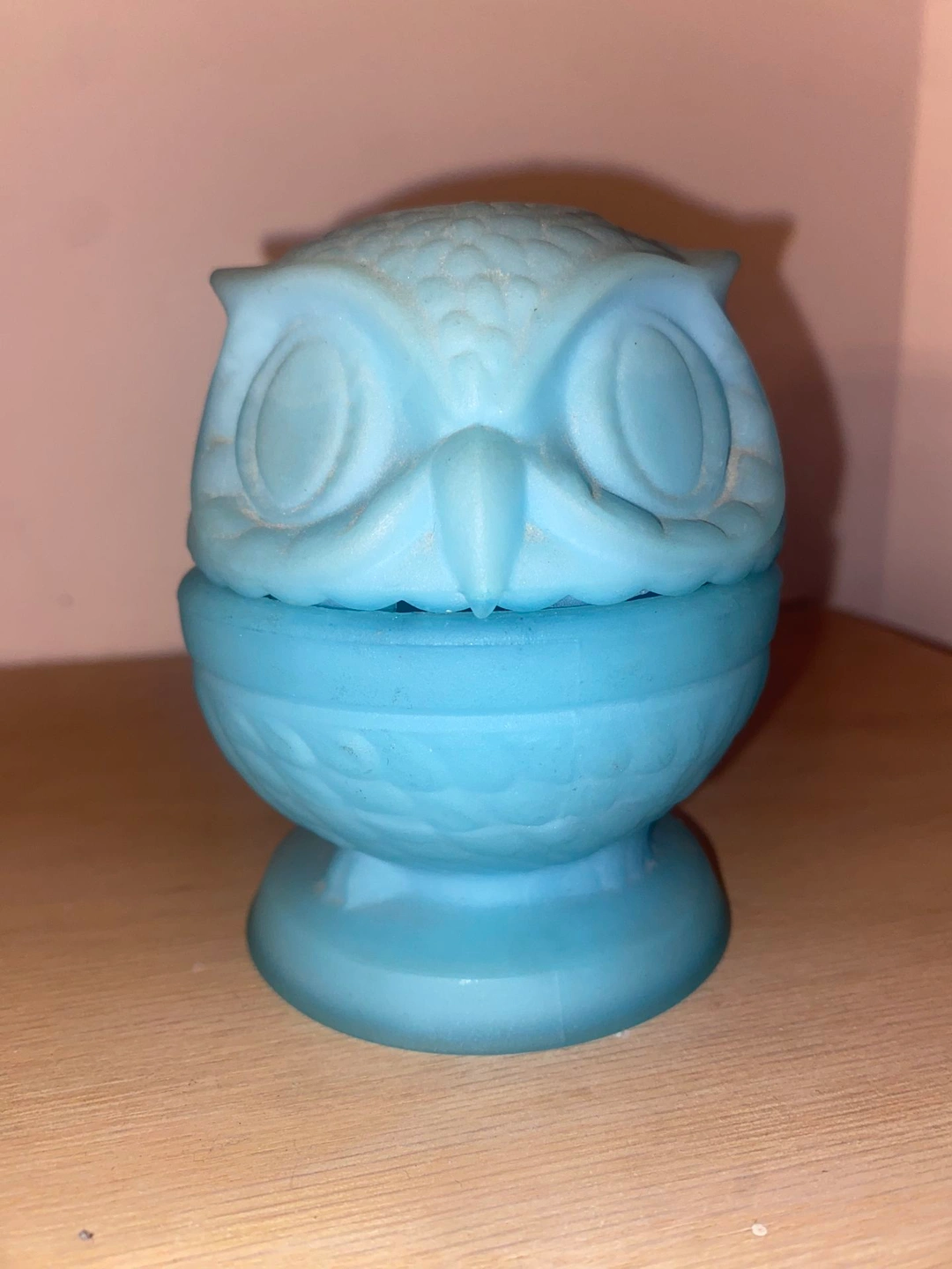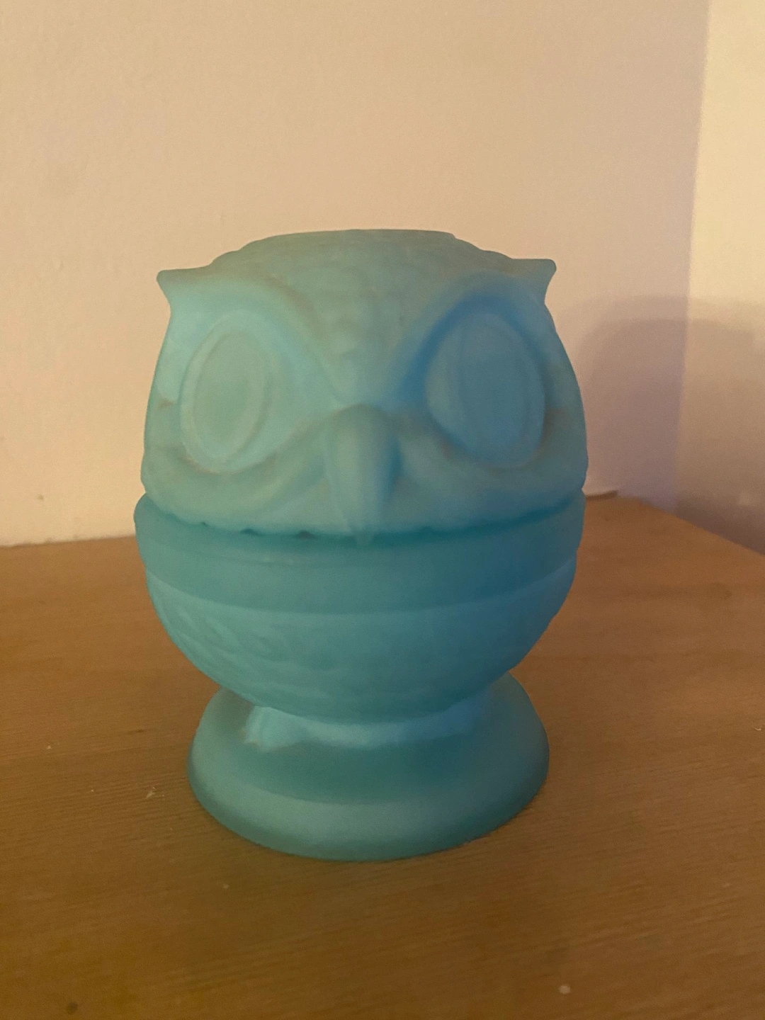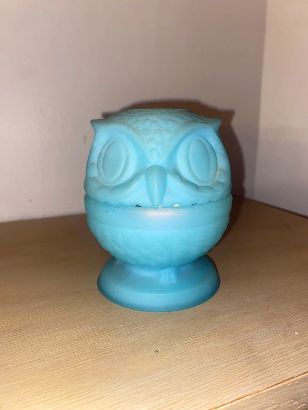 Vintage 1970s Fenton Blue Satin Owl Fairy Lamp. Highly collectible Fenton Art Glass. Approximately 4 inches tall. Used in good condition, with chips on the inside rim area. Pickup in Orland Park or Countryside.