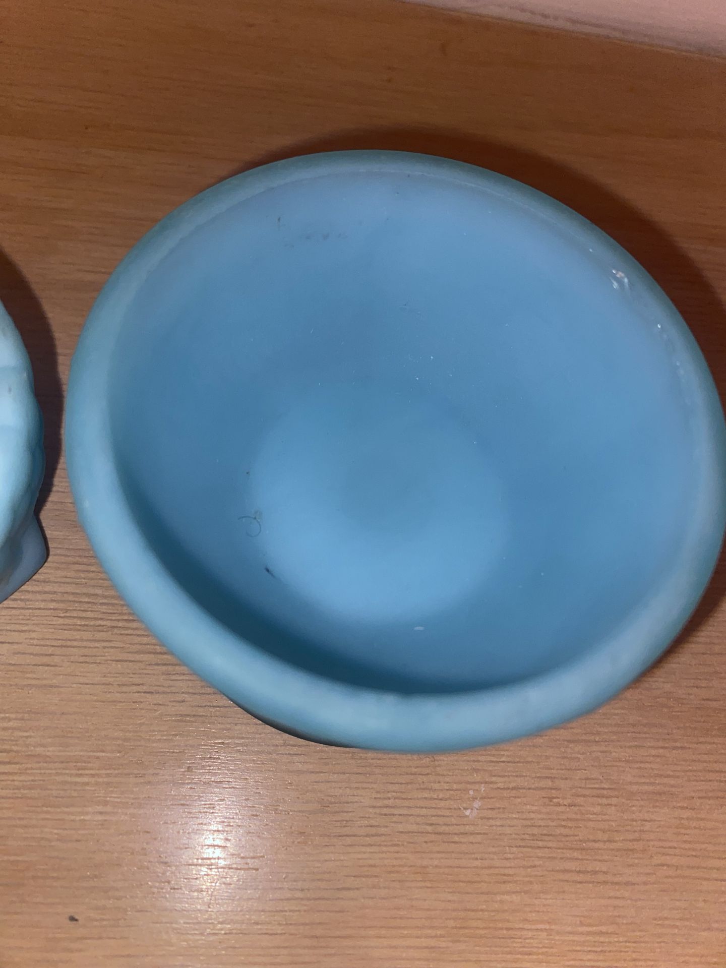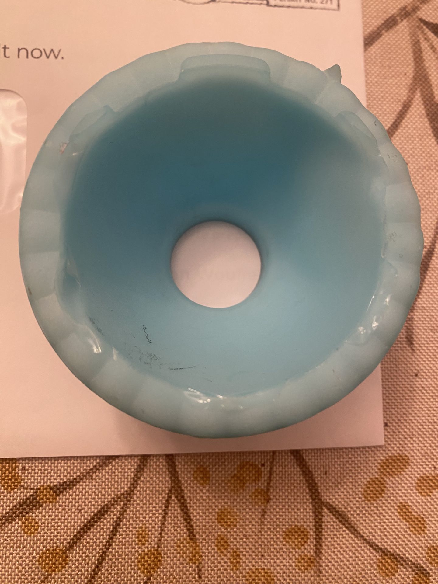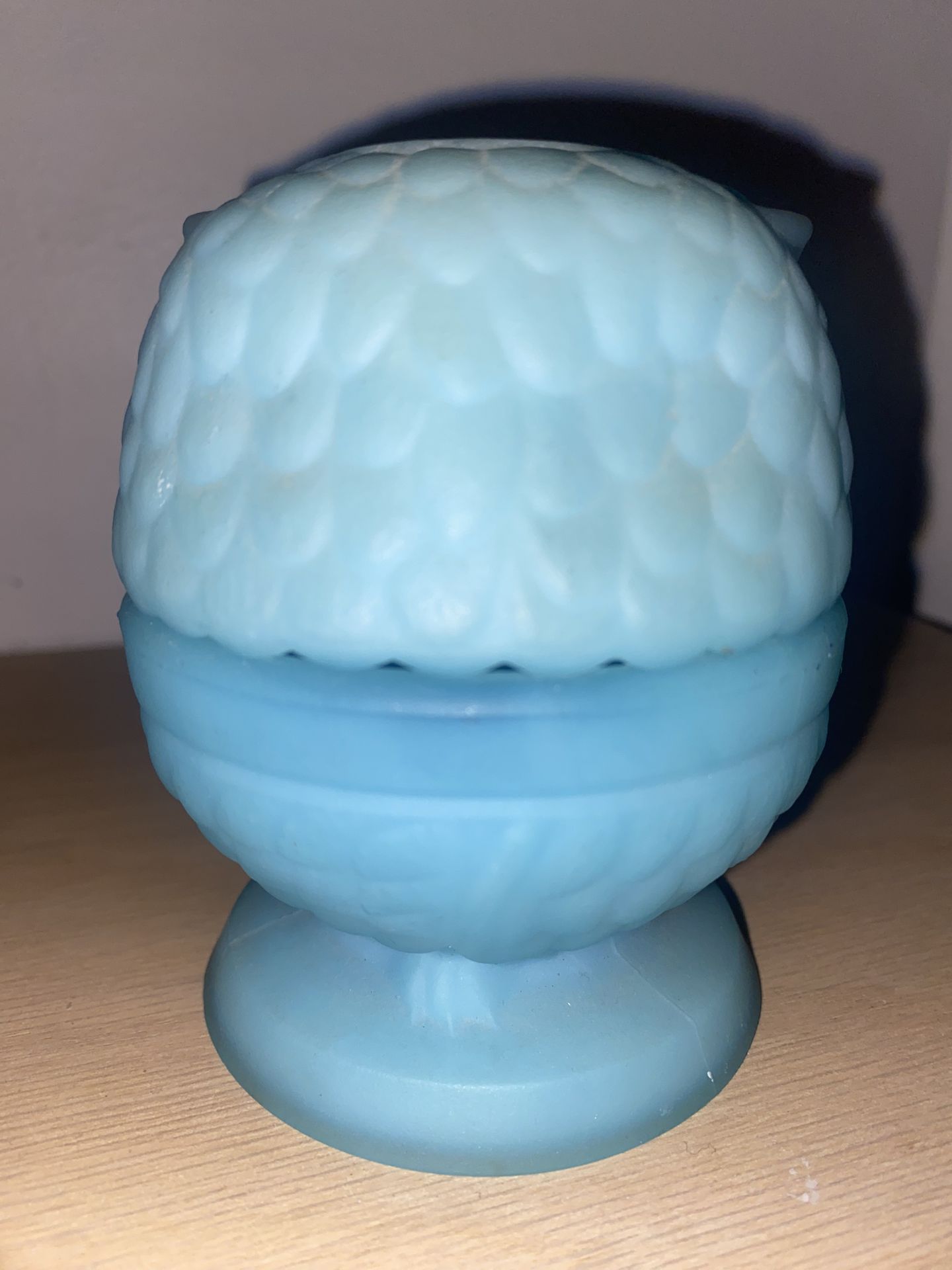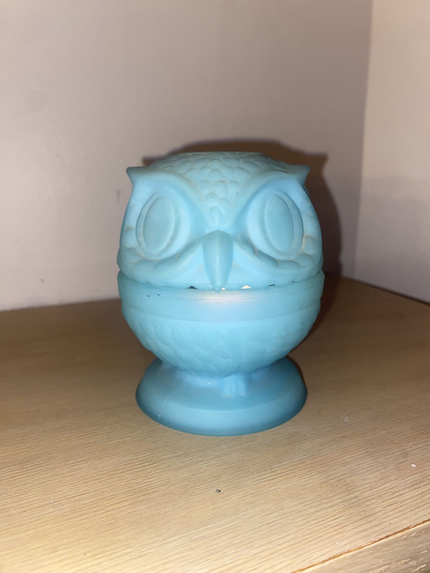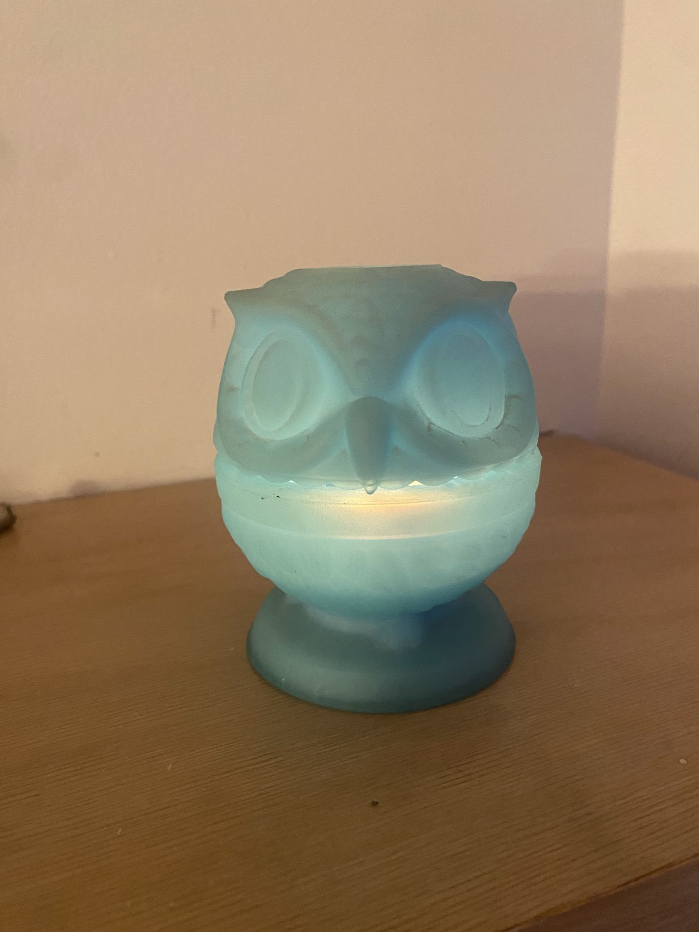 Vintage 1970s Fenton Blue Satin Owl Fairy Lamp. Highly collectible Fenton Art Glass. Approximately 4 inches tall. Used in good condition, with chips on the inside rim area. Pickup in Orland Park or Countryside.