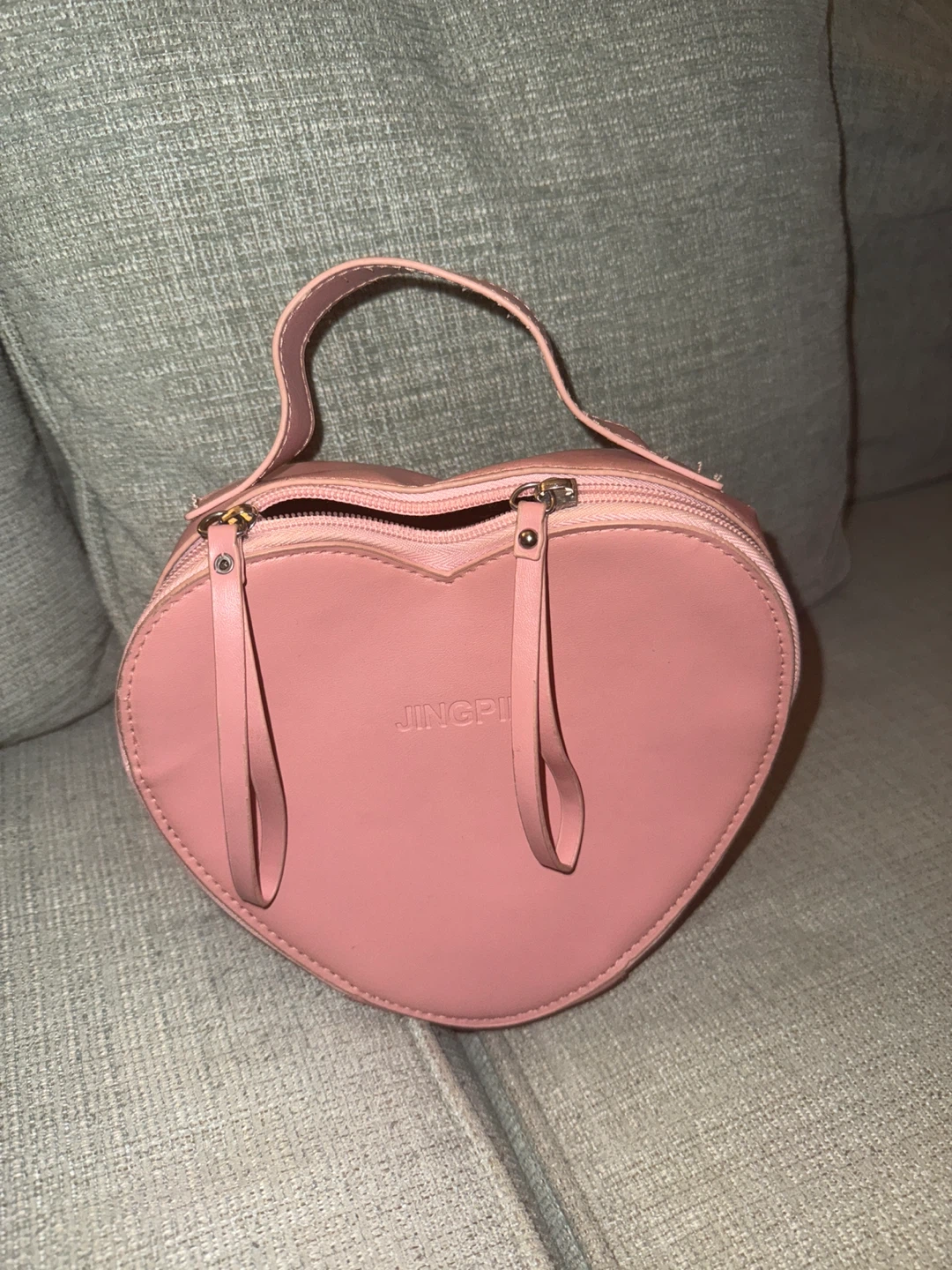 Giving away a cute pink heart-shaped handbag! It's “okay” condition and perfect for adding a sweet touch to any outfit. It has a zipper closure and a handle for easy carrying.
