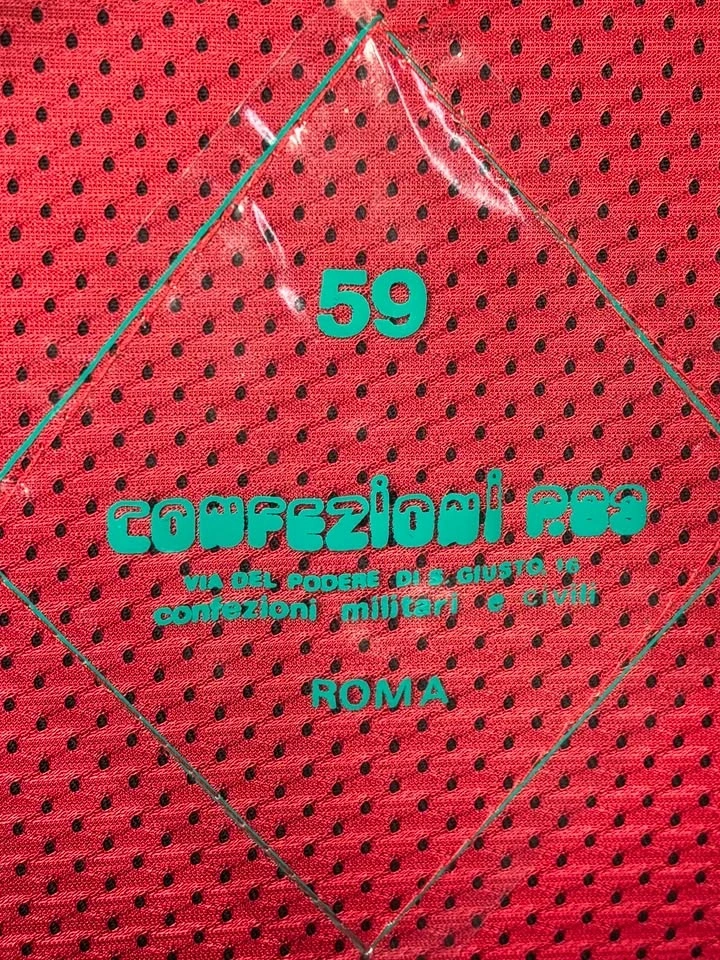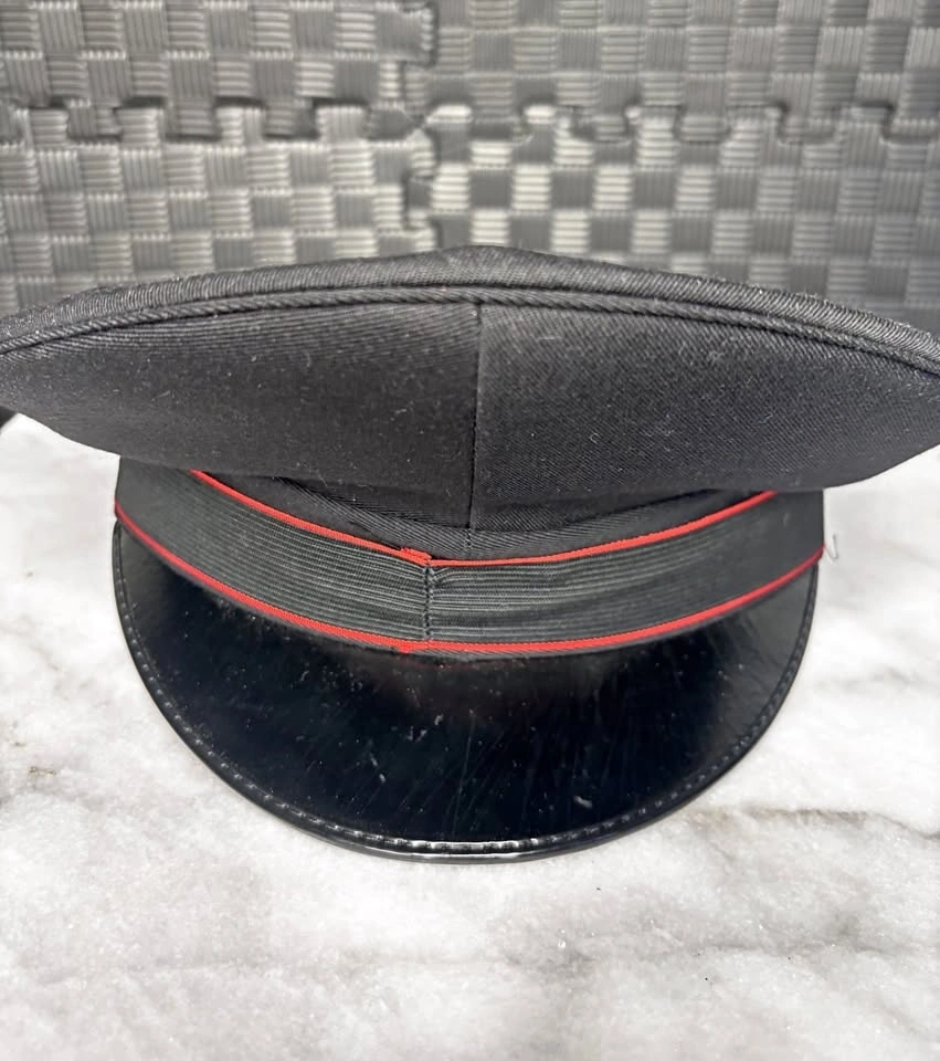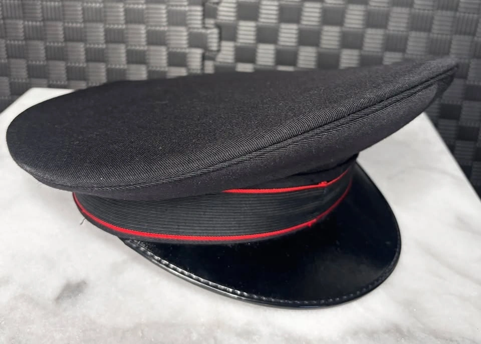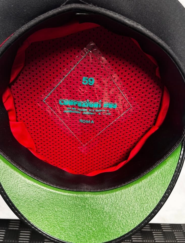 Authentic Italian Military Police (Carabinieri) formal dress cap. Produced by government contractor Confezioni P.33 in Rome. Features the signature black wool body with scarlet red piping. Size: 59 (Large / US 7 3/8). Era: Post-WWII (1960-1980 era). Condition: Excellent vintage structure; patent leather visor. Newly cleaned and disinfected! Note: No chin strap. Only worn once with a wig. Provenance: Internal label confirms factory at Via del Podere di S. Giusto 16, Rome, Italy. Pickup "Electric Ladybug Garden", top of Central Park.