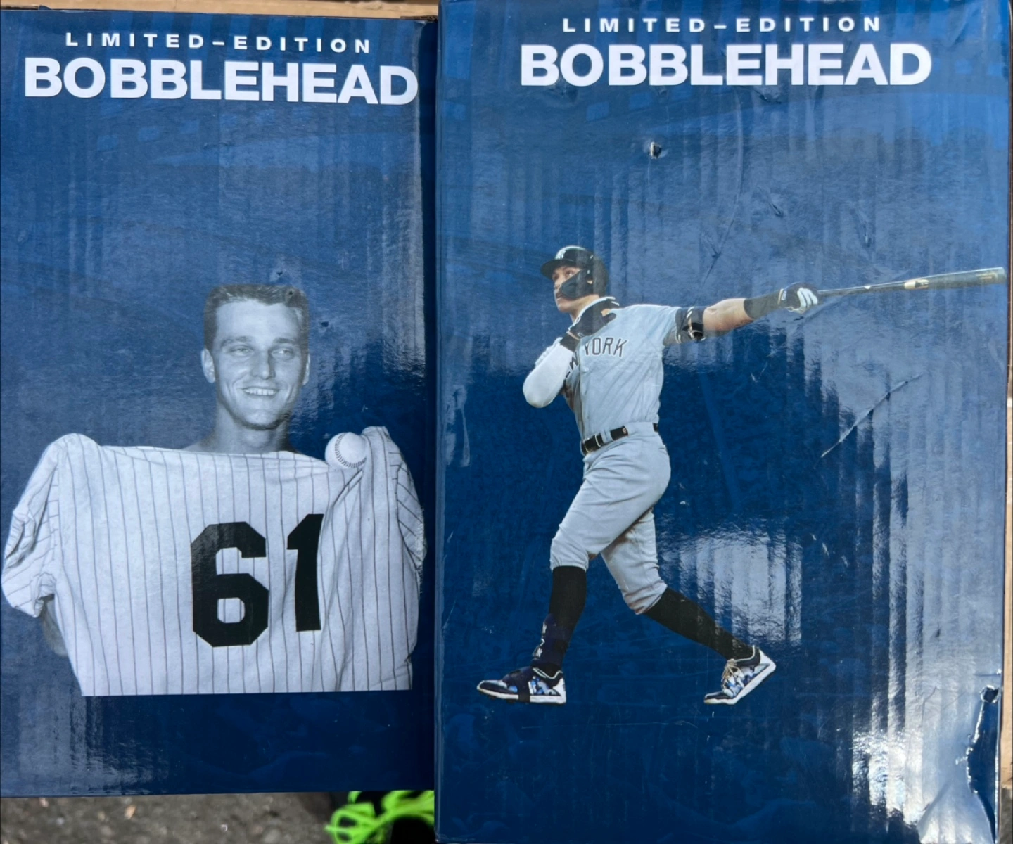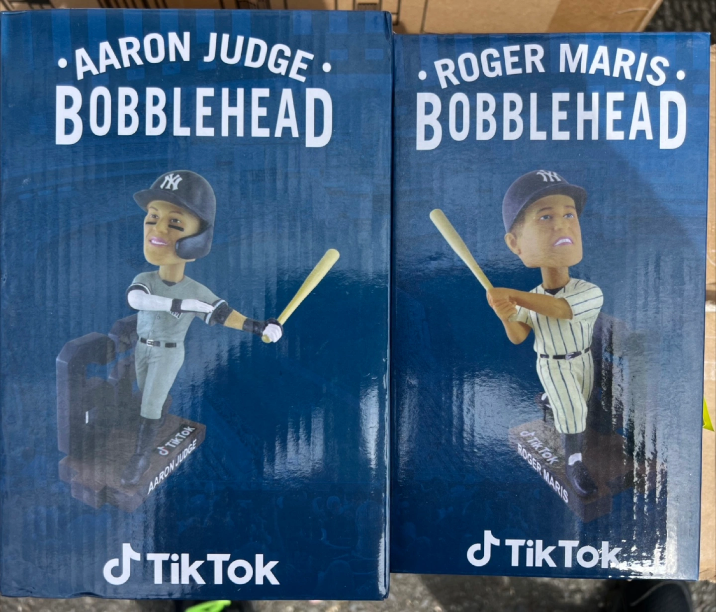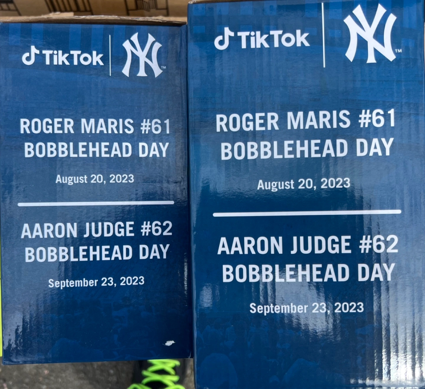 Two limited-edition bobbleheads. Aaron Judge and Roger Maris. New York Yankees. TikTok collaboration. August 20, 2023 and September 23, 2023 dates shown on boxes.