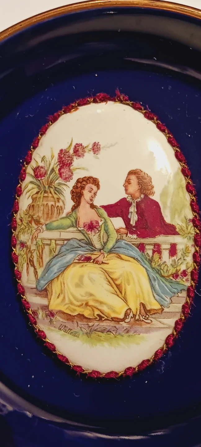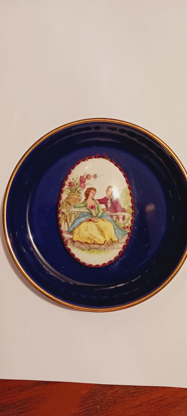 FUHRMANN NEUCHATEL SIGNED FINE GERMAN COBALT BLUE PORCELAIN SMALL TRINKET DISH WITH CAMEO DECORATION INLAID. This lovely trinket dish features a charming painted scene of a couple enjoying a moment outdoors. It has a deep blue finish with a gold trim. The oval-shaped dish is perfect for holding small jewelry or decorative items. 5" diameter. Excellent condition. Made in Germany π©πͺ. ALL MY PRICES ARE NEGOTIABLE !!