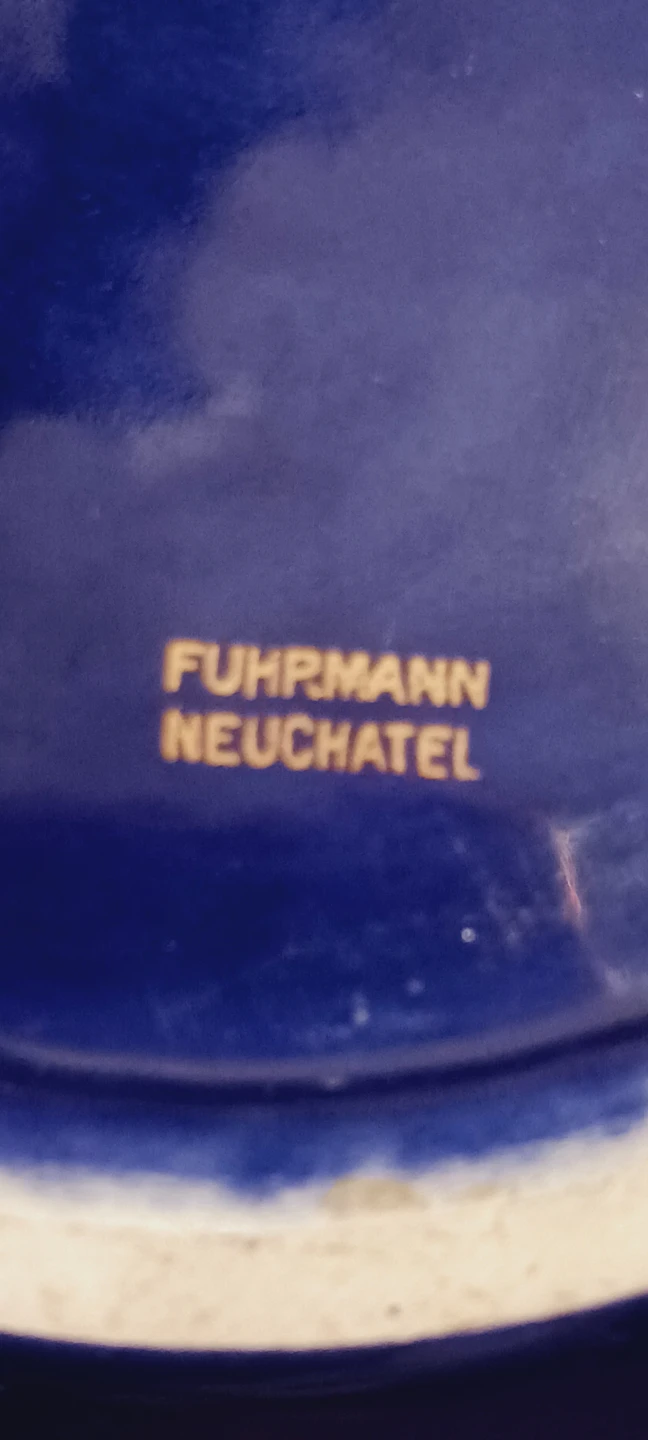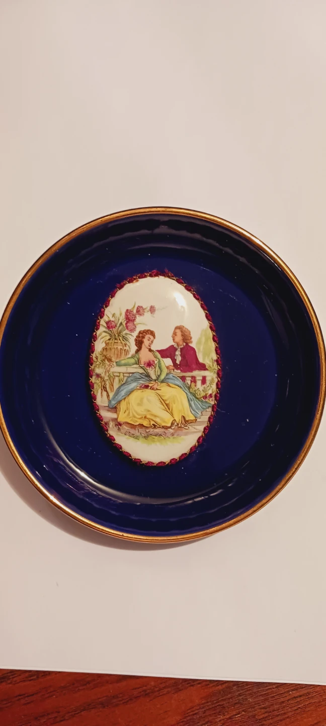 FUHRMANN NEUCHATEL SIGNED FINE GERMAN COBALT BLUE PORCELAIN SMALL TRINKET DISH WITH CAMEO DECORATION INLAID. This lovely trinket dish features a charming painted scene of a couple enjoying a moment outdoors. It has a deep blue finish with a gold trim. The oval-shaped dish is perfect for holding small jewelry or decorative items. 5" diameter. Excellent condition. Made in Germany π©πͺ. ALL MY PRICES ARE NEGOTIABLE !!